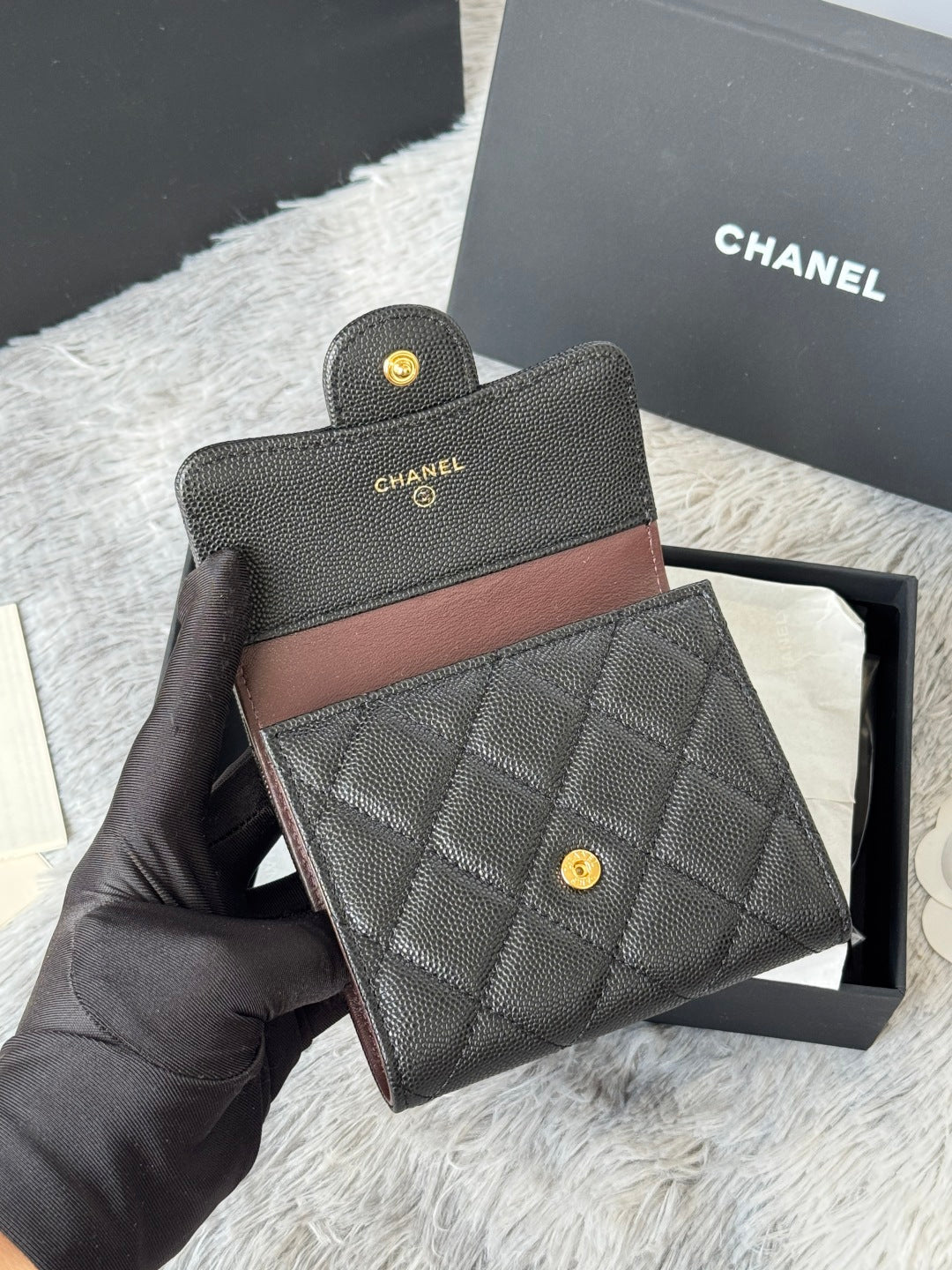 CHANEL 25S CF SMALL TRI FOLD WALLET 11 IN BLACK CAVIAR GOLD HARDWARE