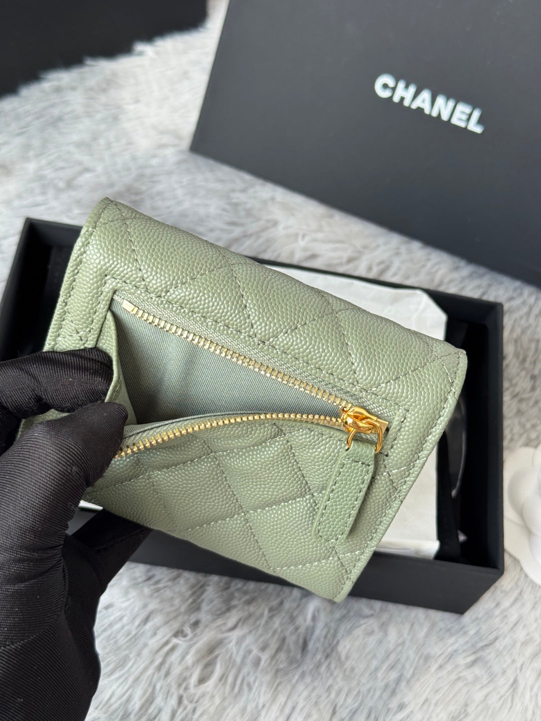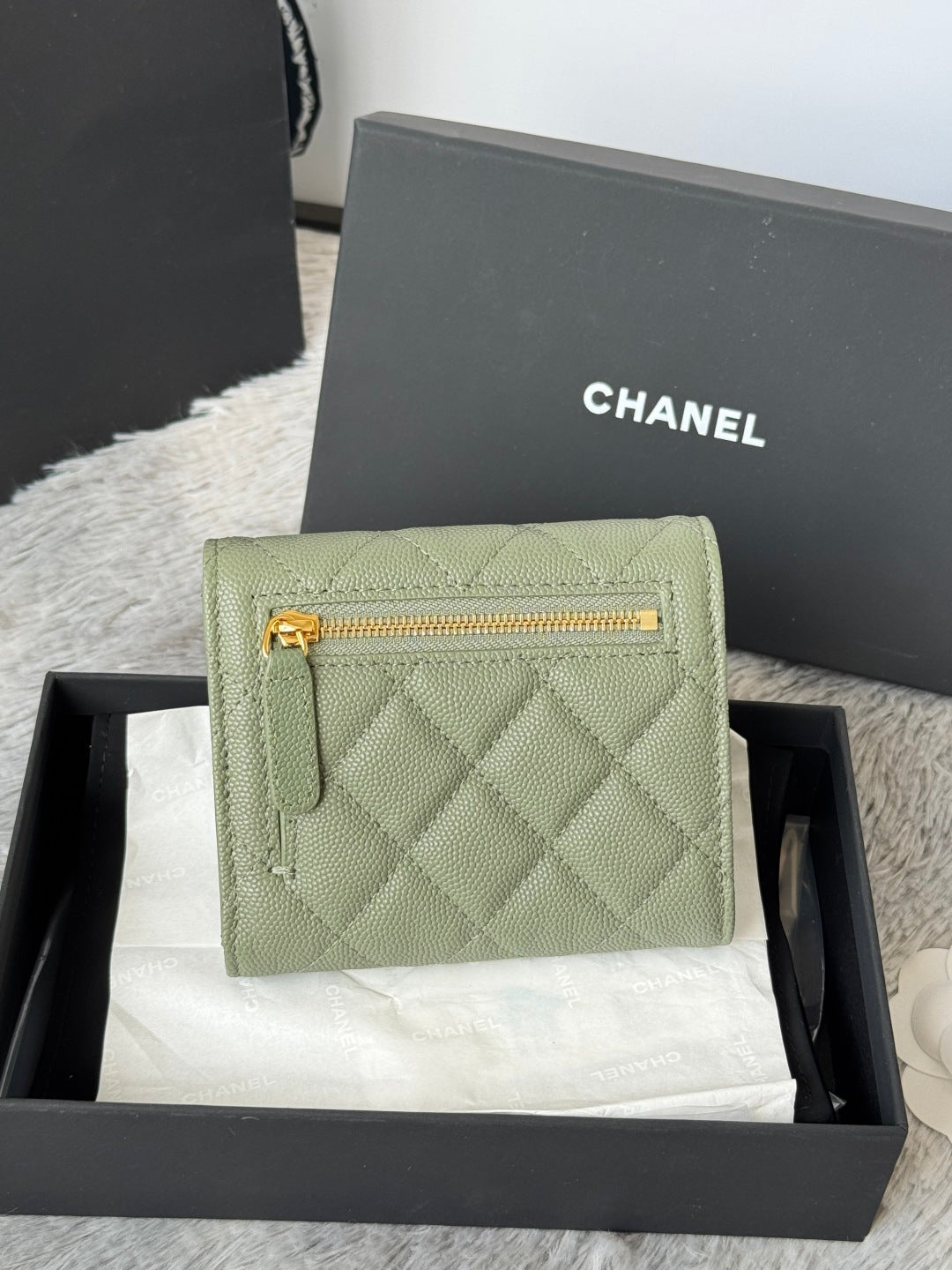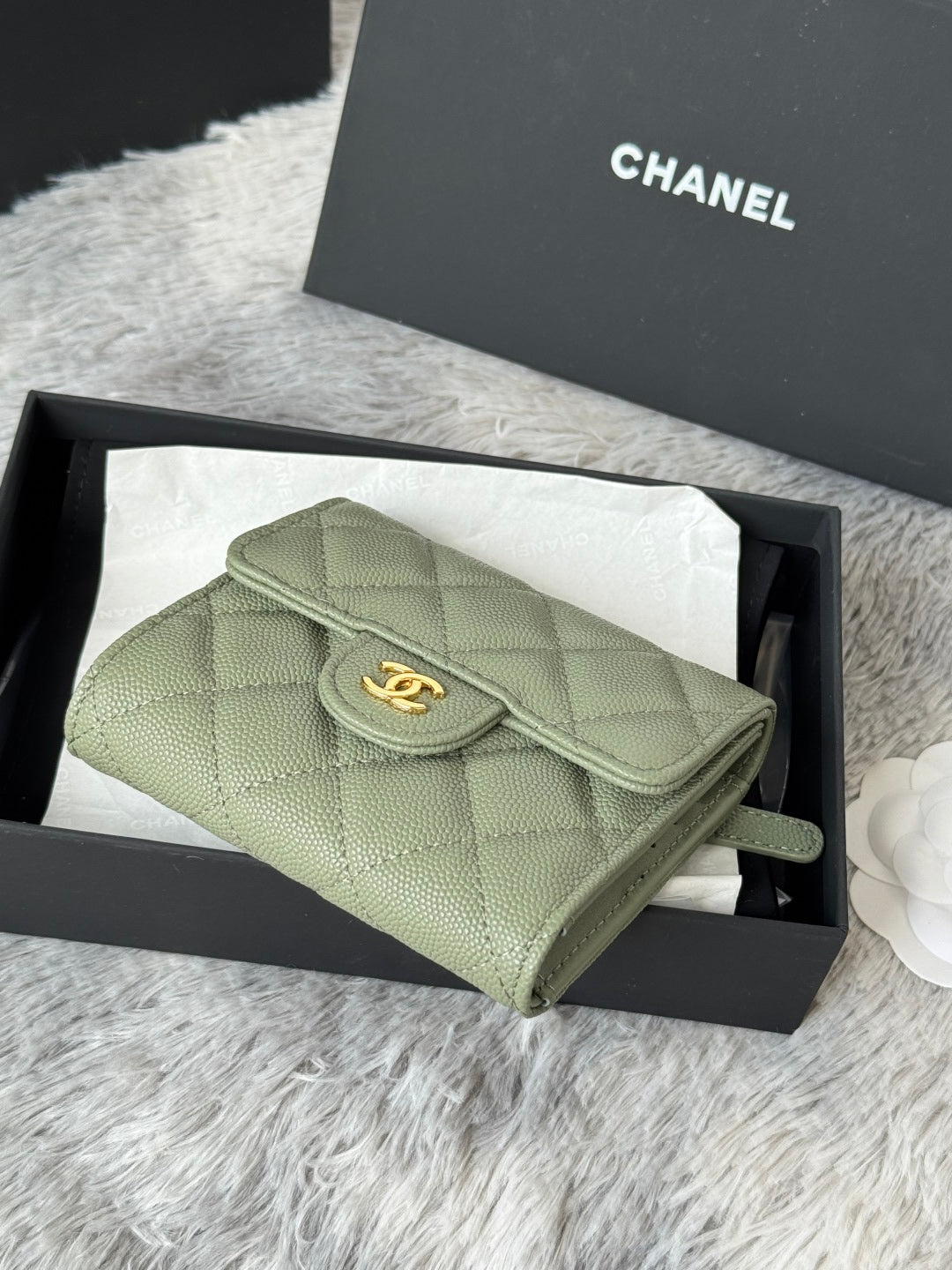 CHANEL 25S CF SMALL TRI FOLD WALLET 11 IN MOSS GREEN CAVIAR GOLD HARDWARE