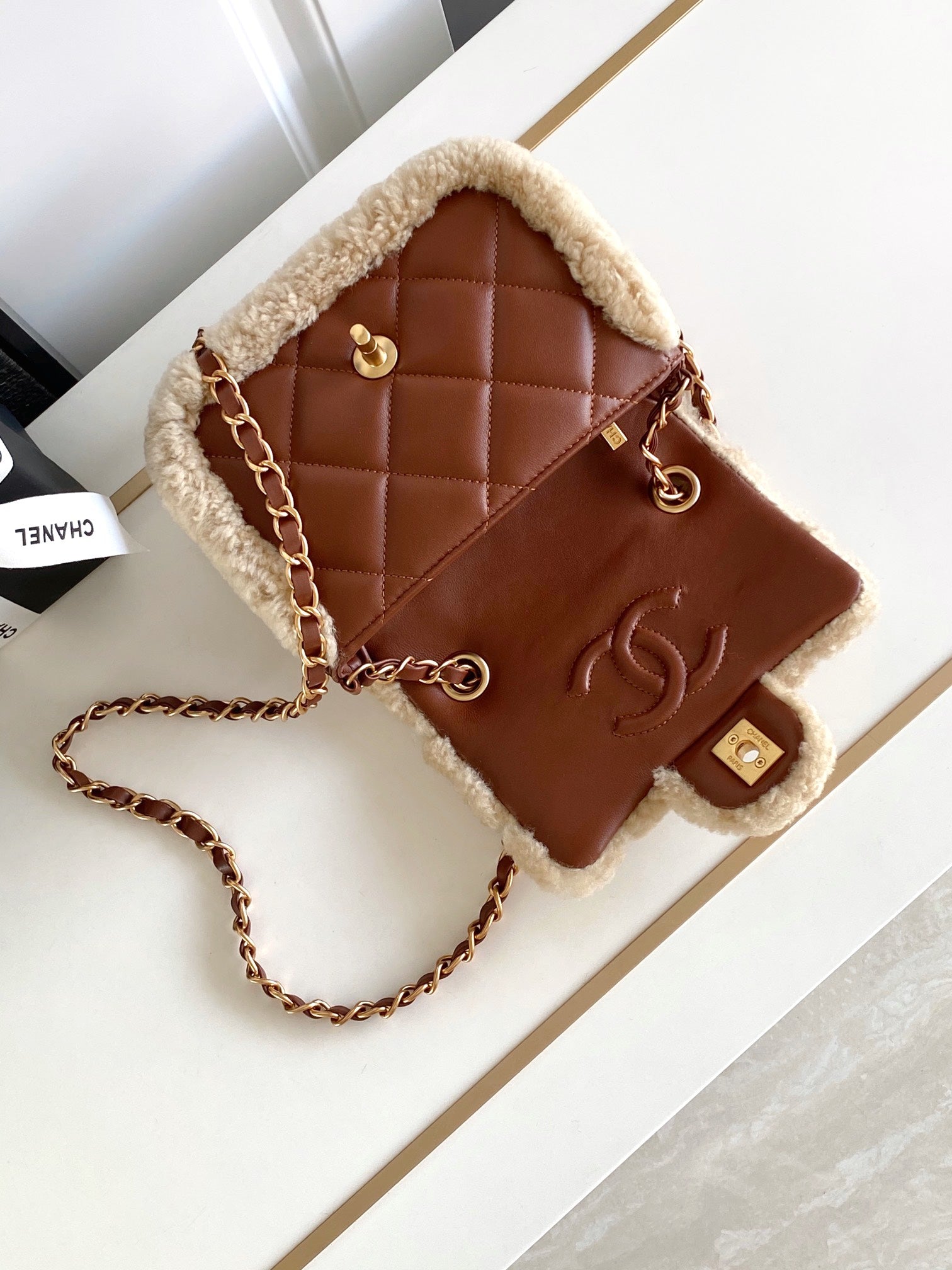 CHANEL 25S FLAP BAG 18 CM IN BEIGE WOOL AND BROWN LAMBSKIN