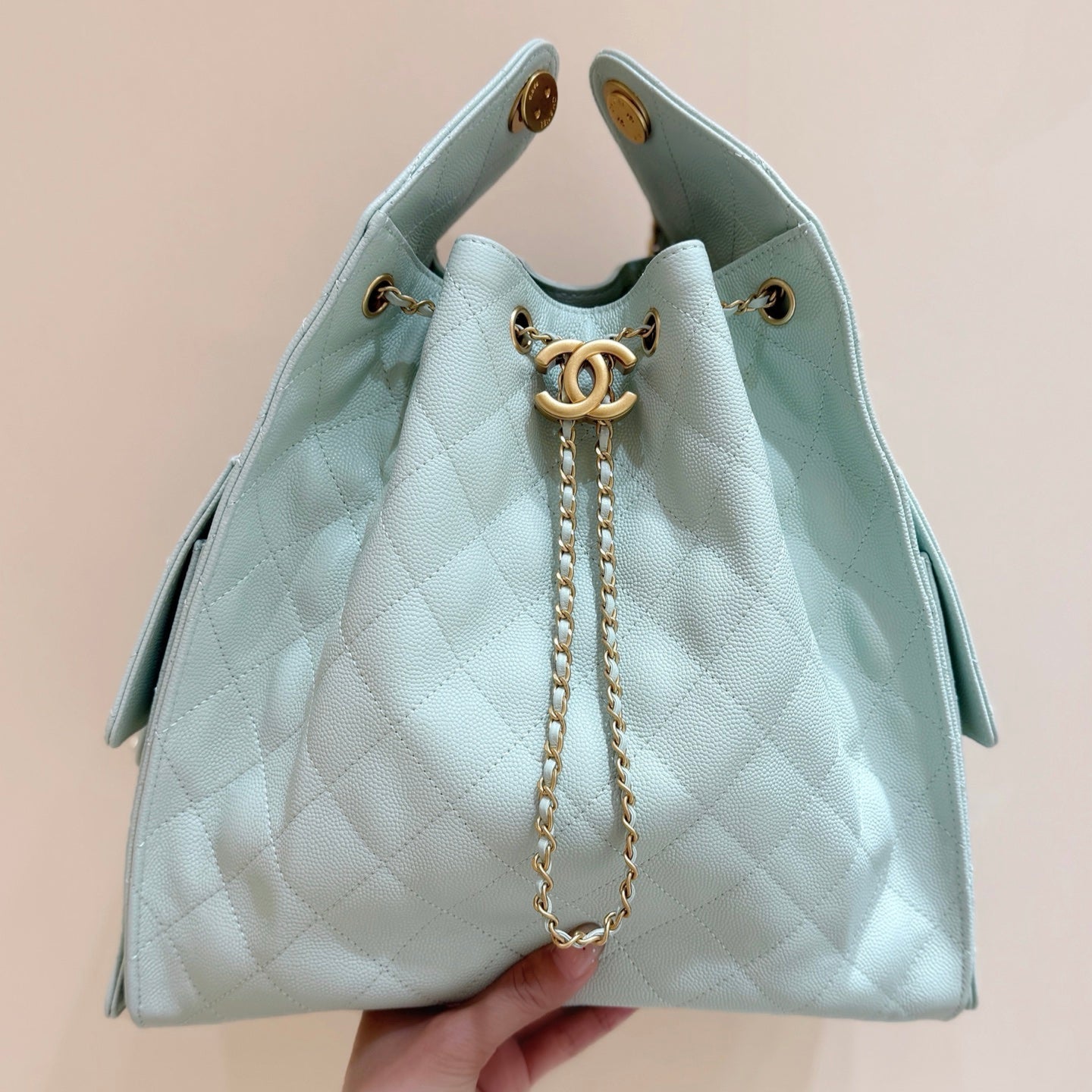CHANEL 25S HANDBAG IN PALE CYAN 40 GRAINED CALFSKIN GOLD HARDWARE