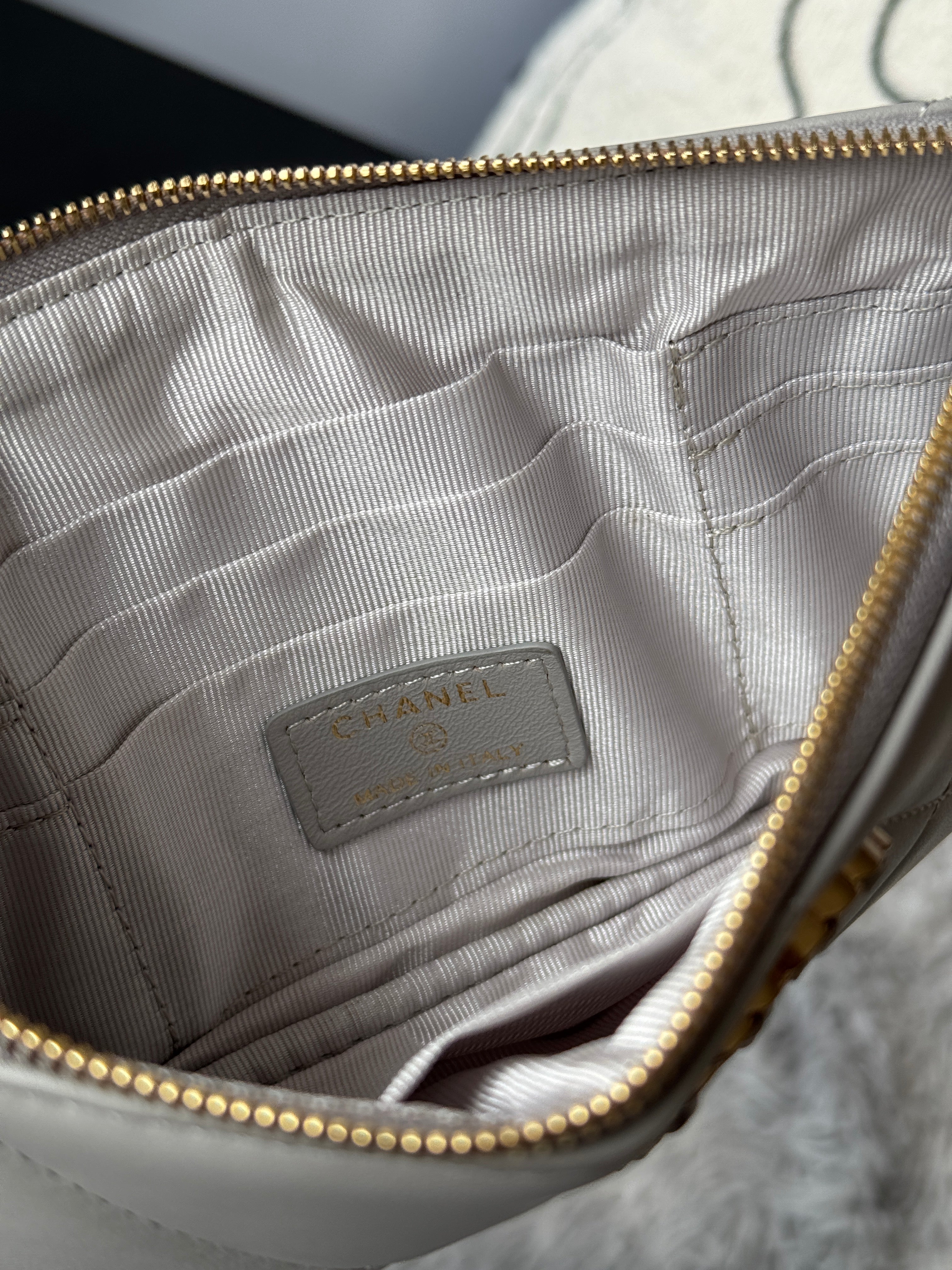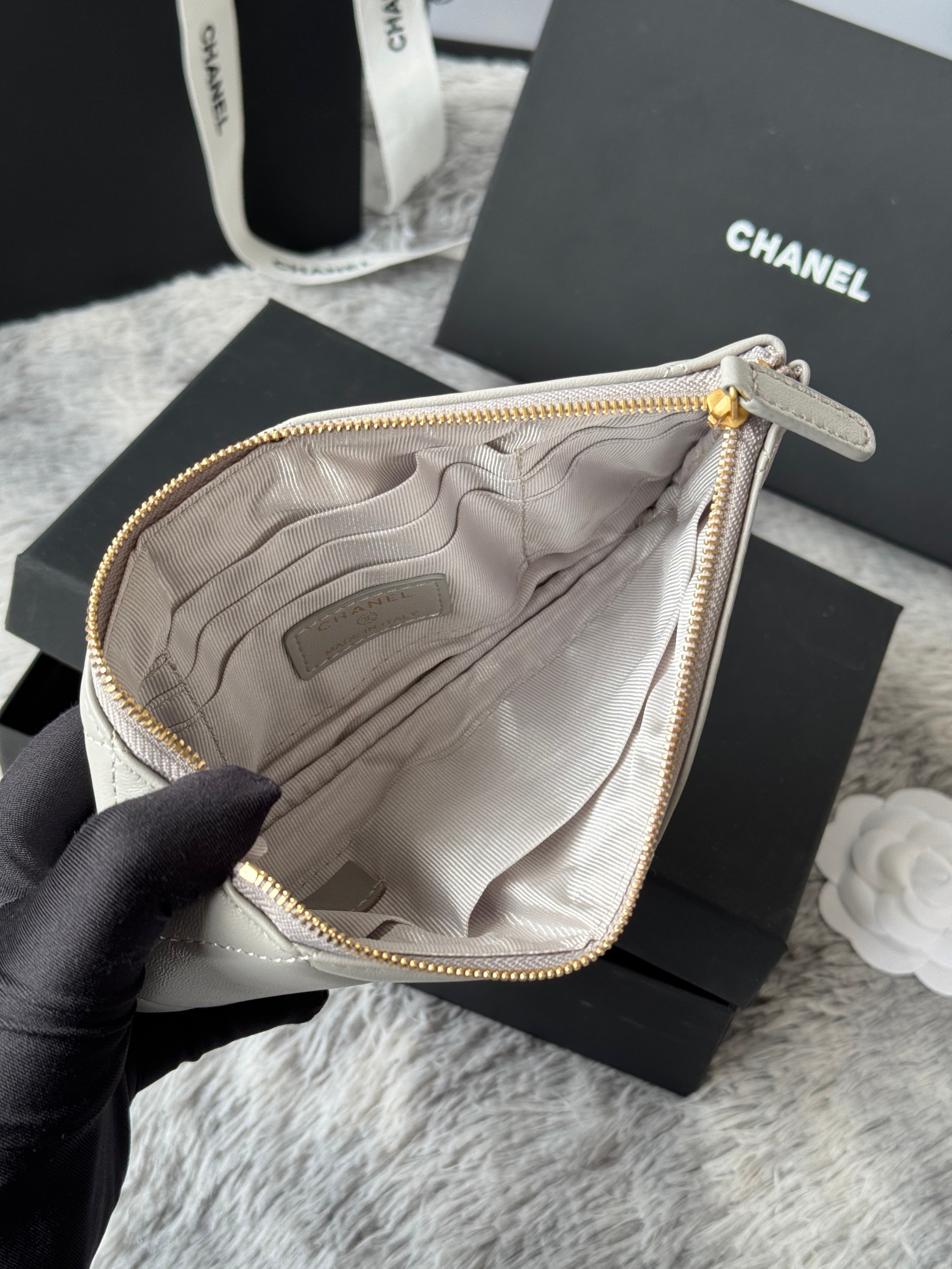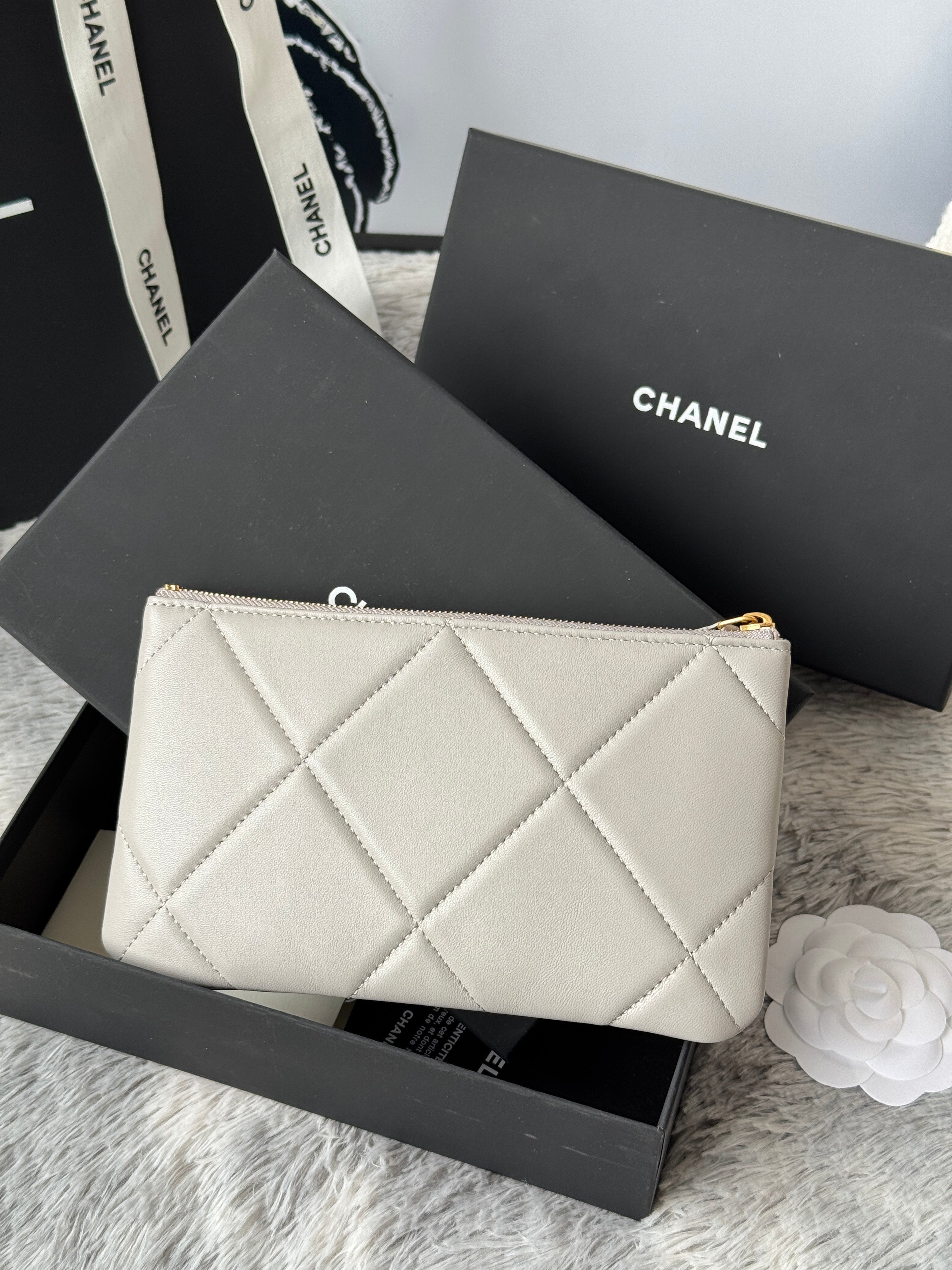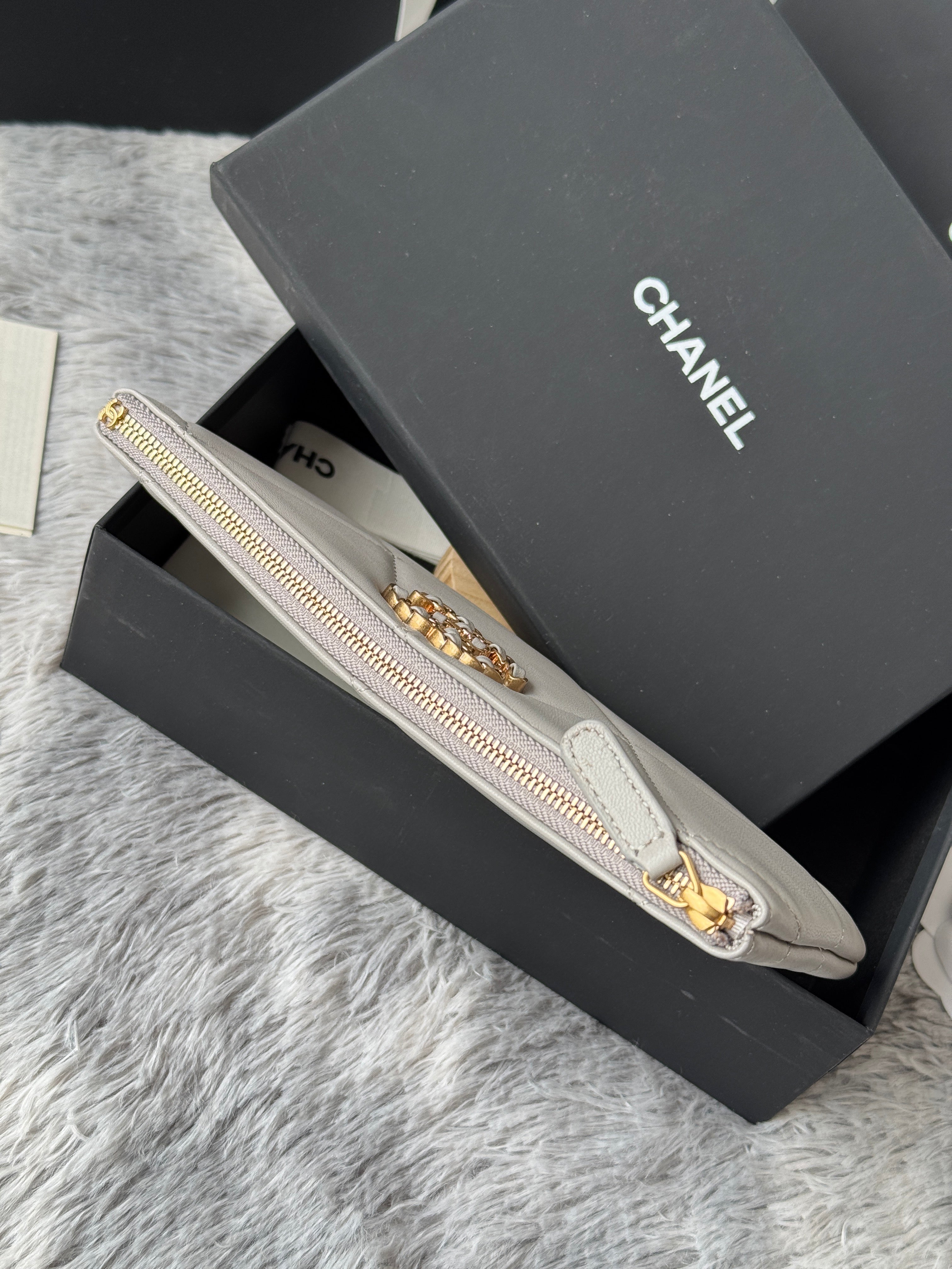 CLASSIC ZIPPER POUCH 20 IN GREY SMOOTH LAMBSKIN GOLD-TONE HARDWARE
