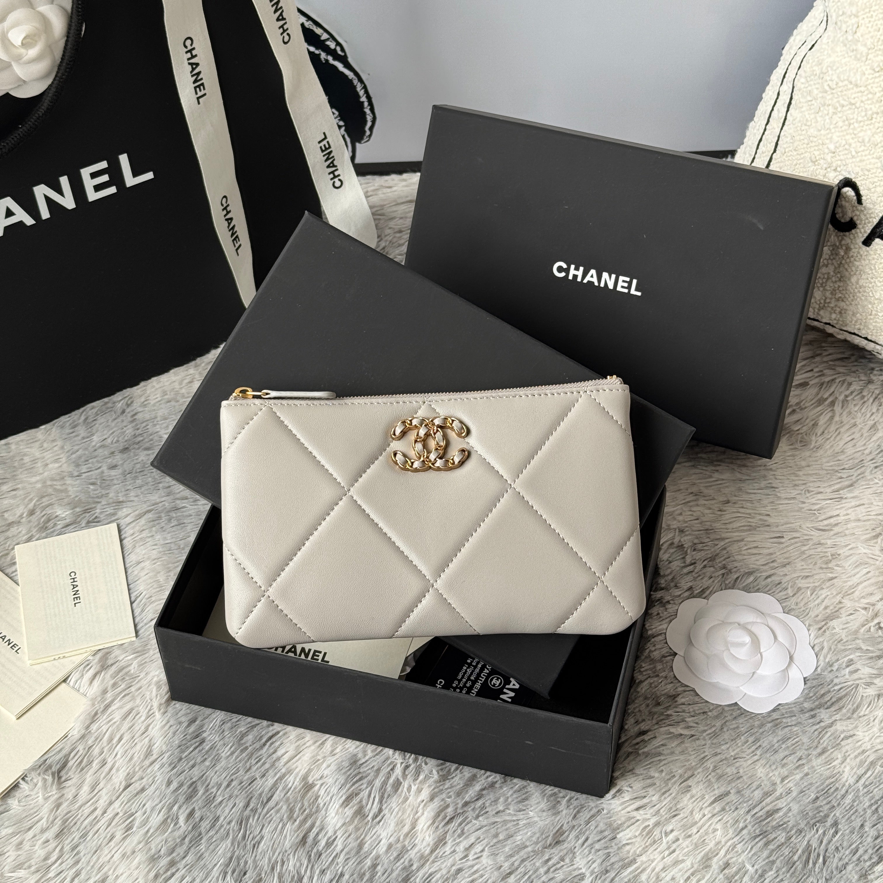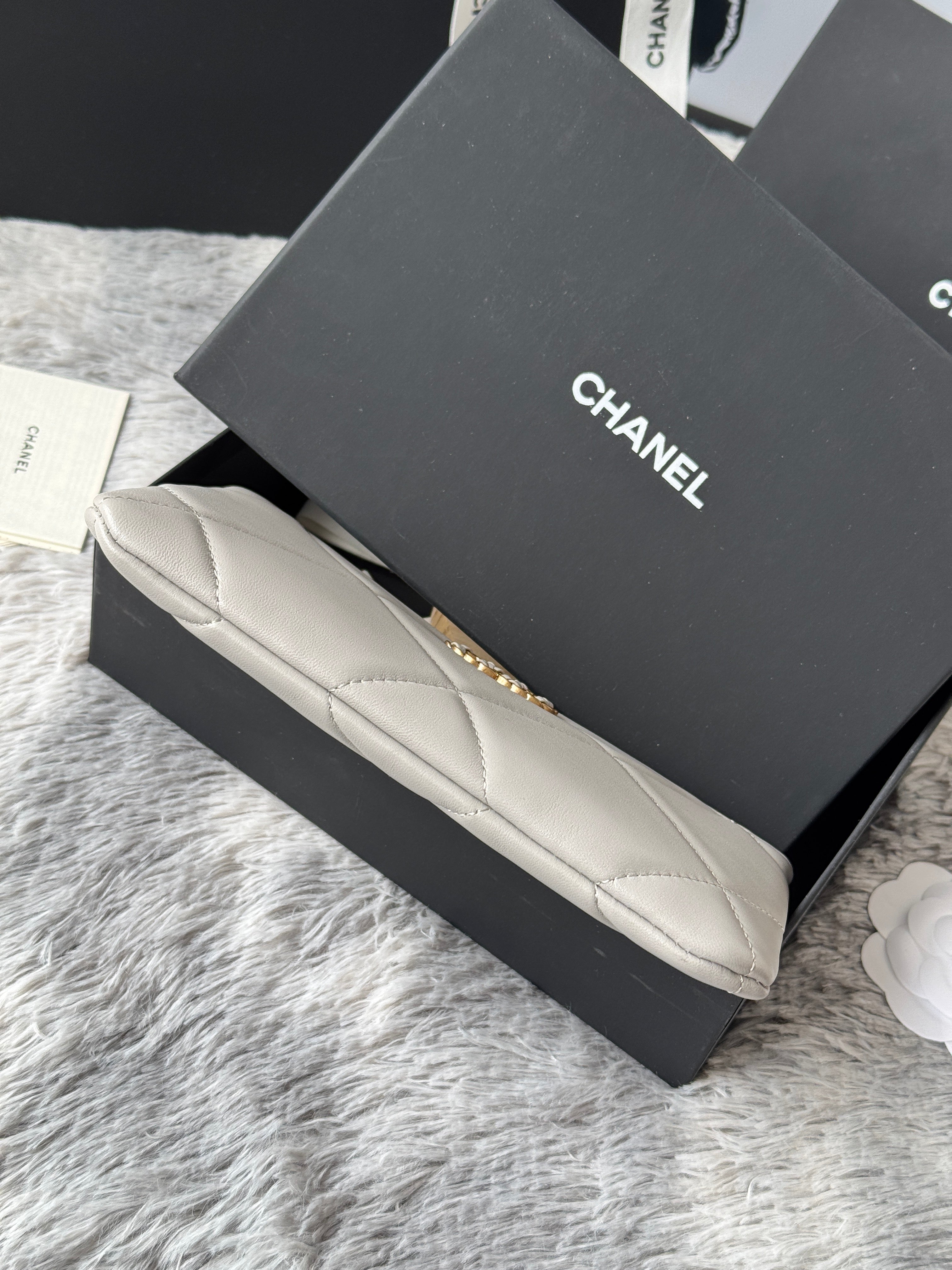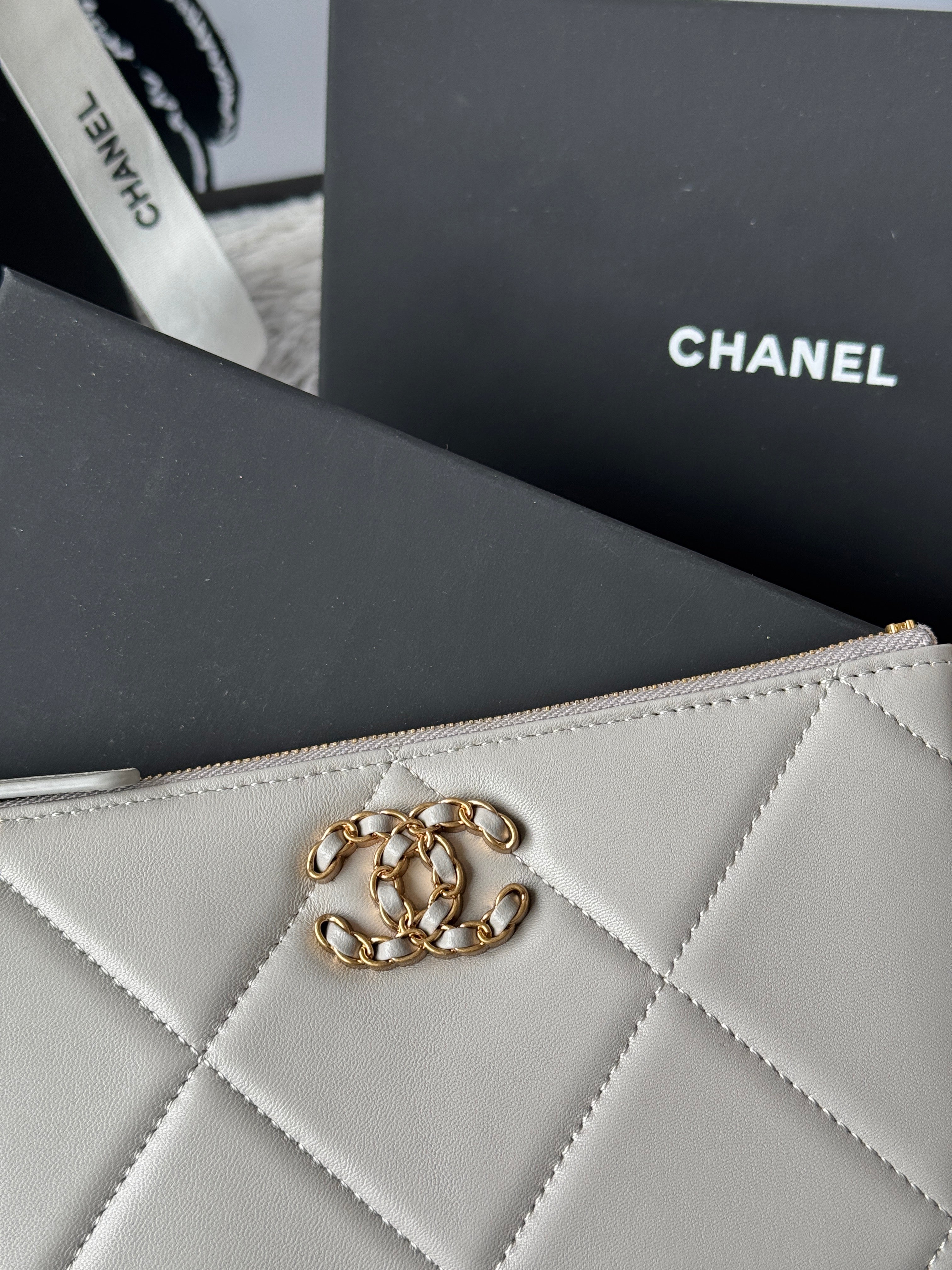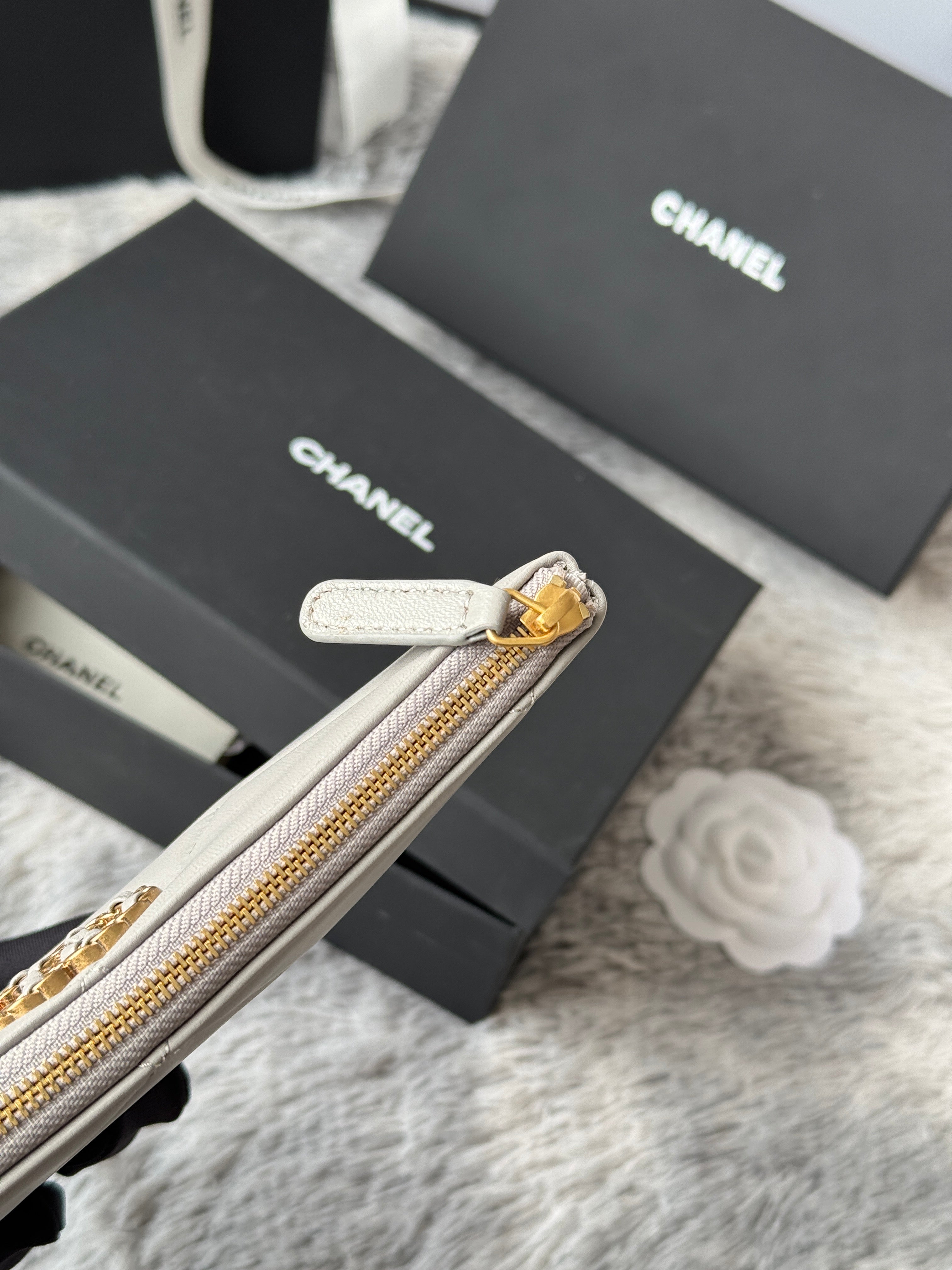 CLASSIC ZIPPER POUCH 20 IN GREY SMOOTH LAMBSKIN GOLD-TONE HARDWARE