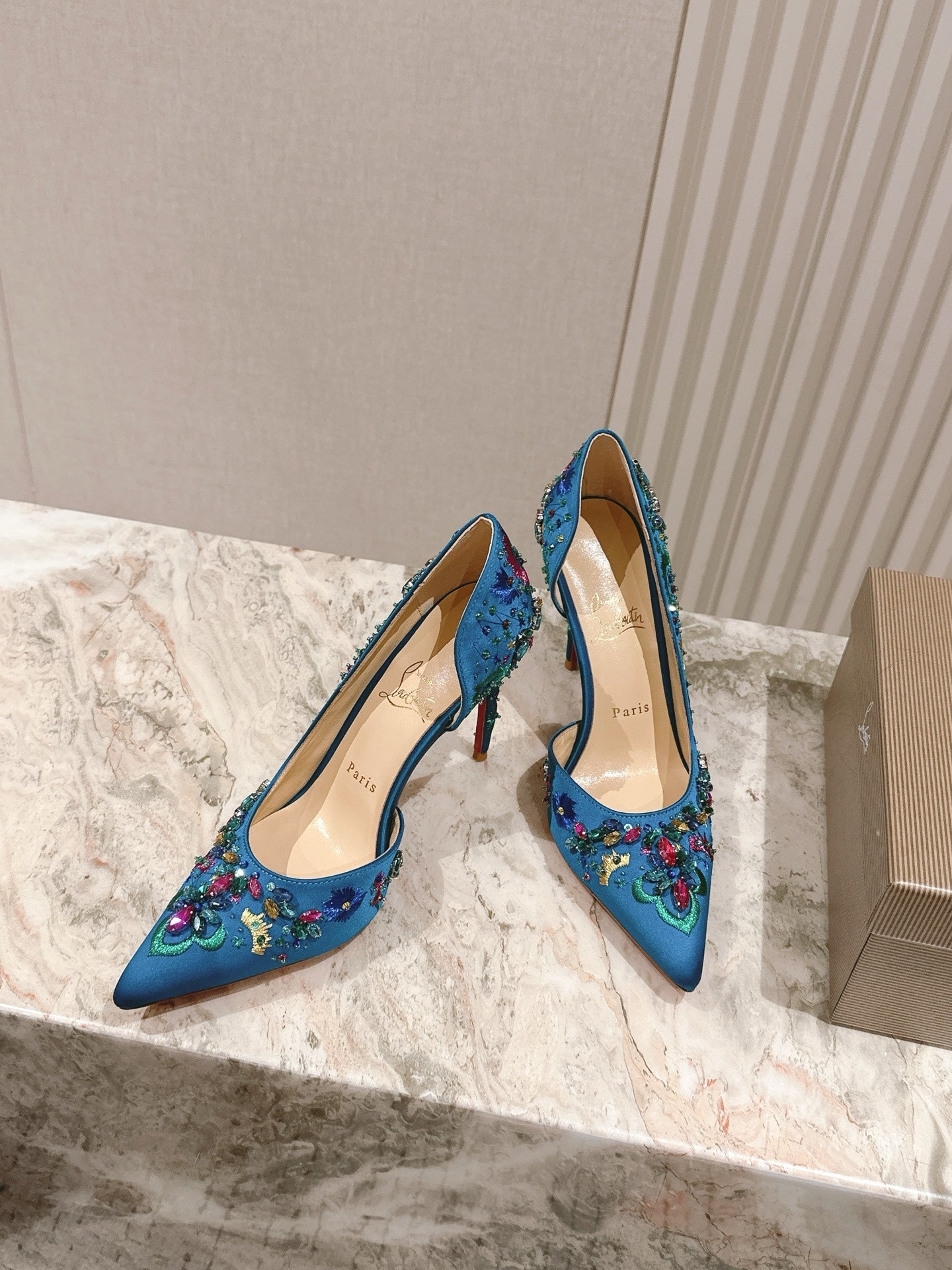 COLORFUL EMBROIDERED IRIZA PUMPS 105MM IN AQUA BLUE SATIN