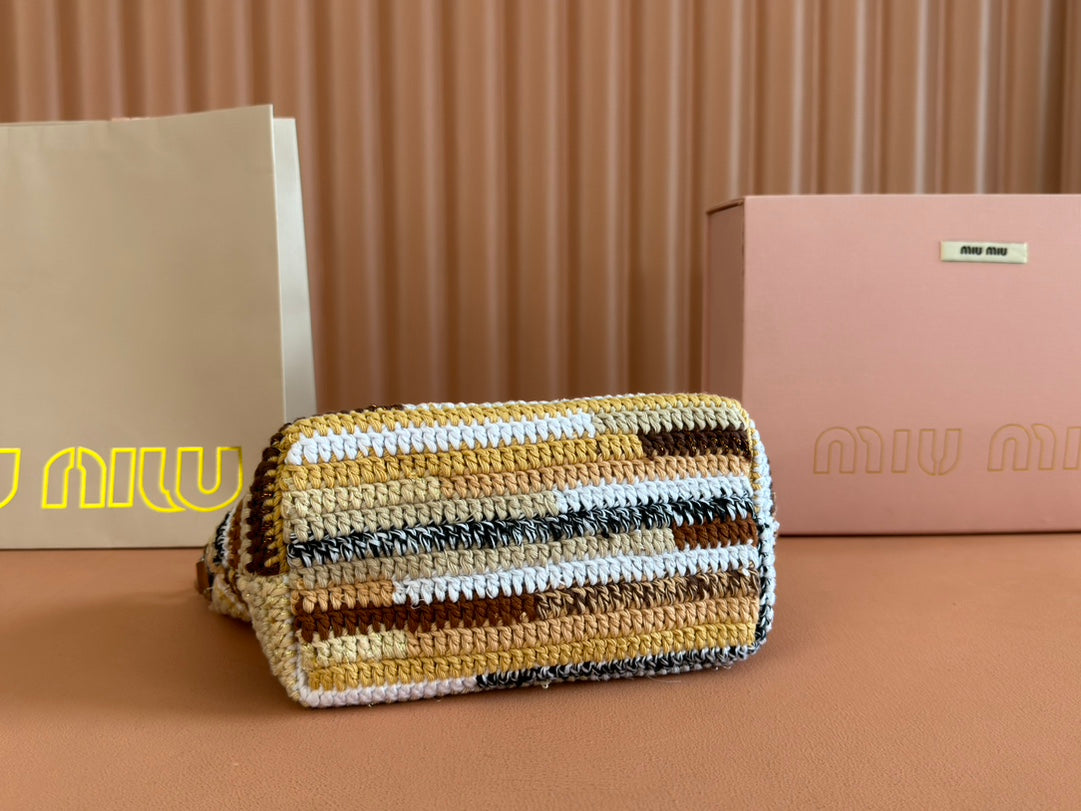 CROCHET SHOULDER BAG 25.5 NATURAL COLOUR-BLOCK WOOL WITH BROWN STRAP CALFSKIN