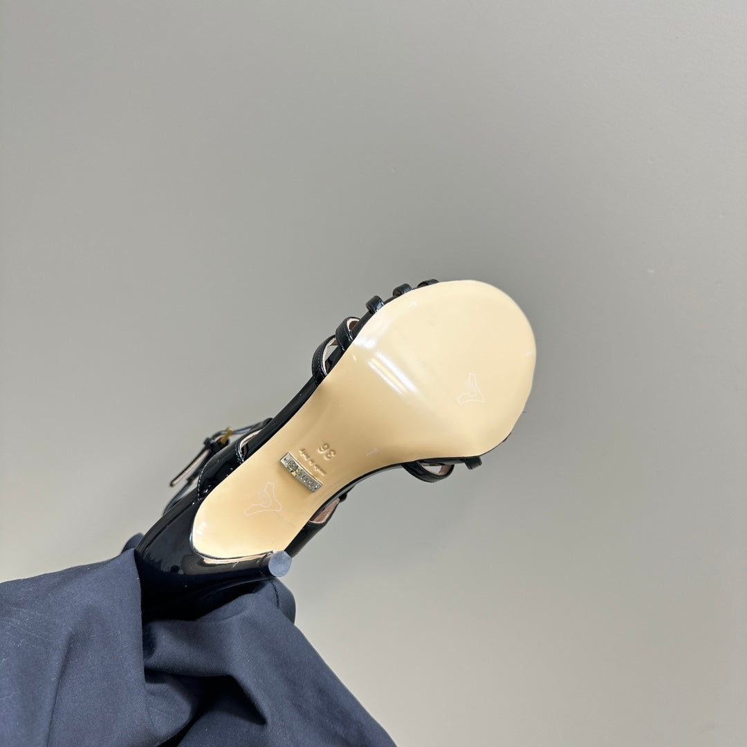 CRYSTAL HORSEBIT STRAPPY SANDAL 10.5CM IN BLACK PATENT LEATHER