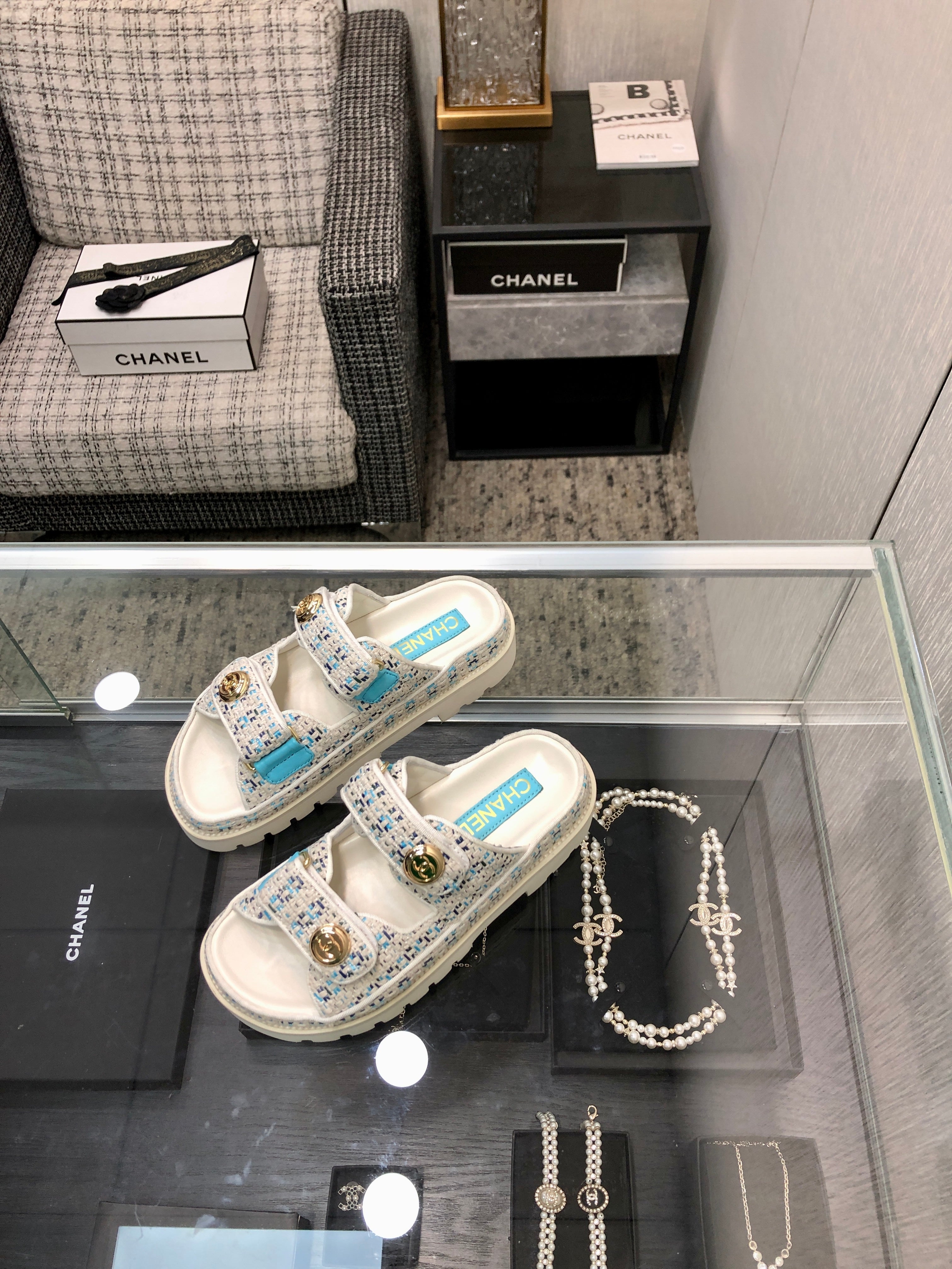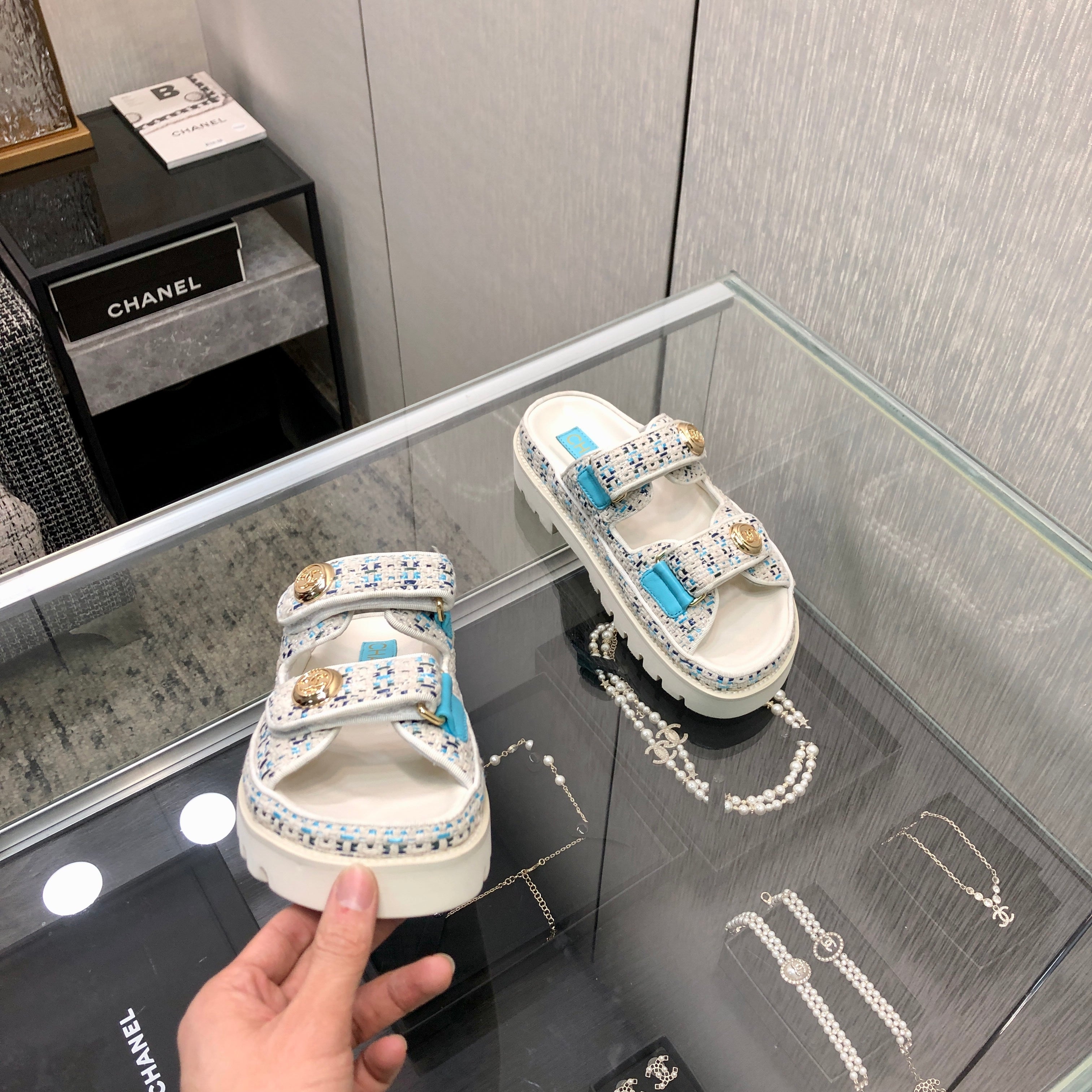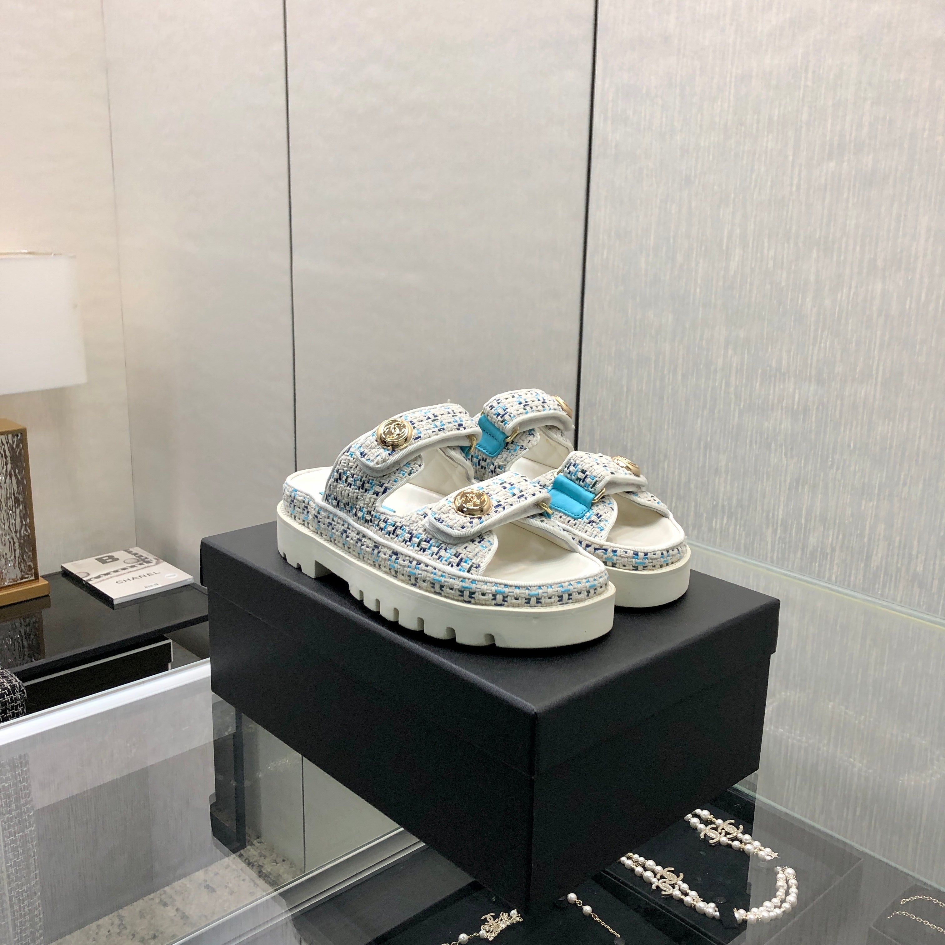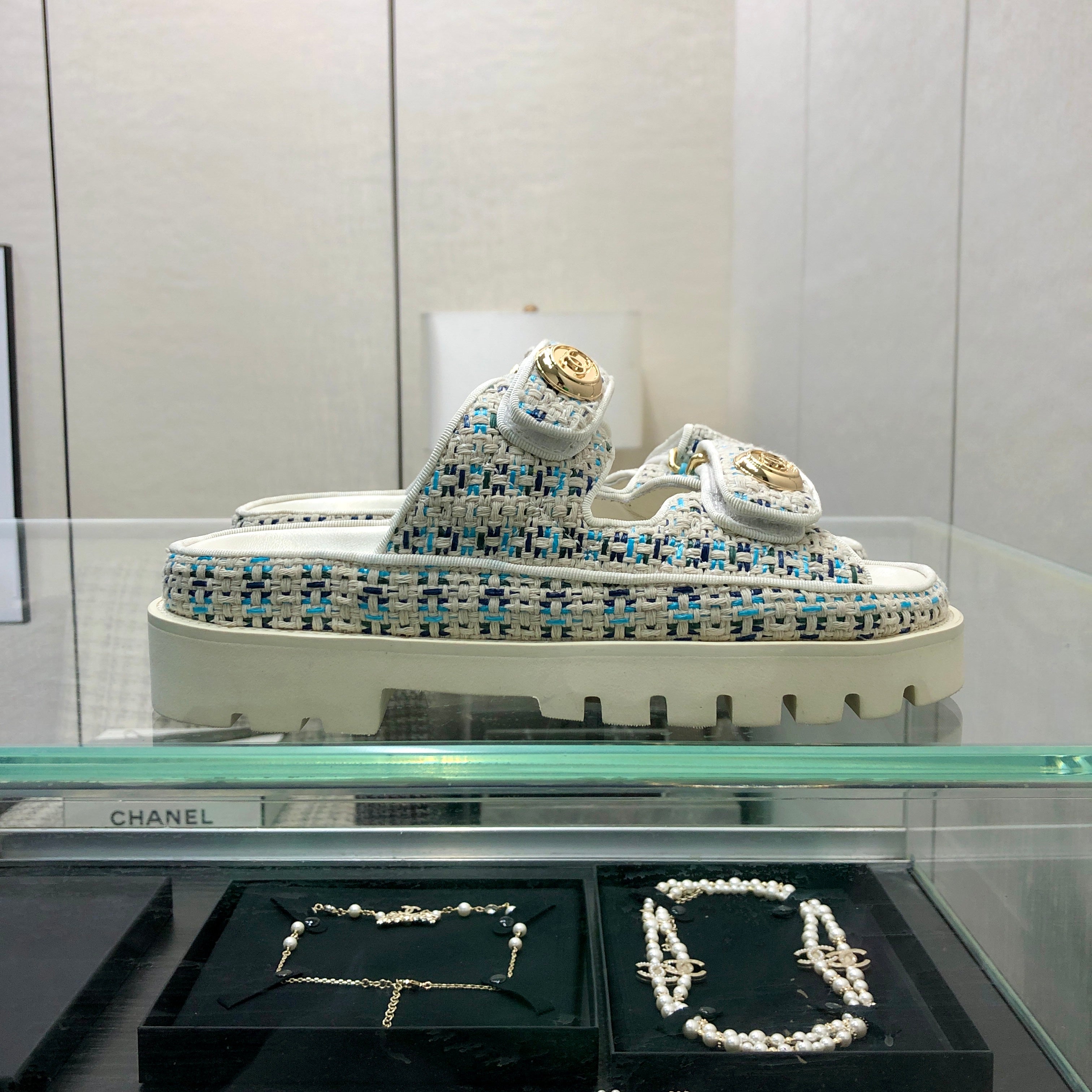 DAD SANDAL MULE IN WHITE MIX LIGHT BLUE TWEED FABRIC