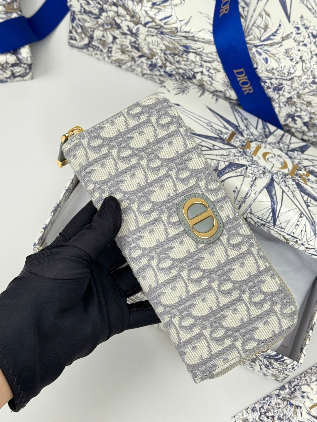 DIOR 25S LONG ZIPPER WALLET 19 IN GRAY OBLIQUE JACQUARD CANVAS