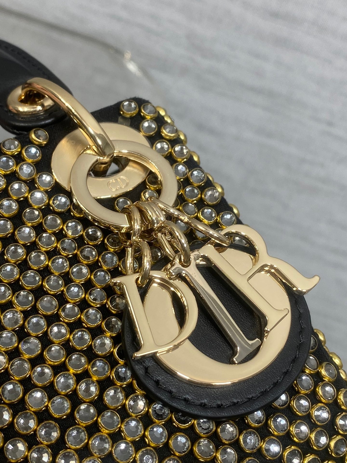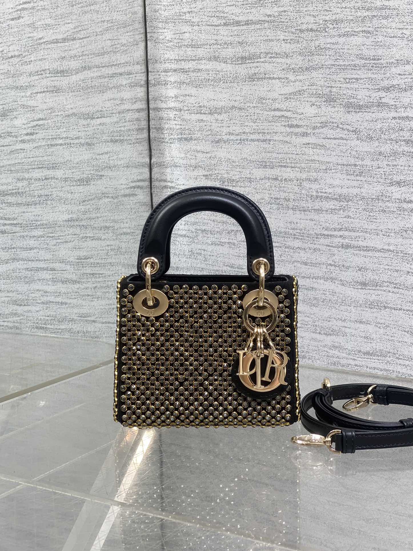 DIOR 25S MINI LADY D-LITE BAG 12 IN BLACK CANVAS AND CALFSKIN CRYSTAL-STUDDED