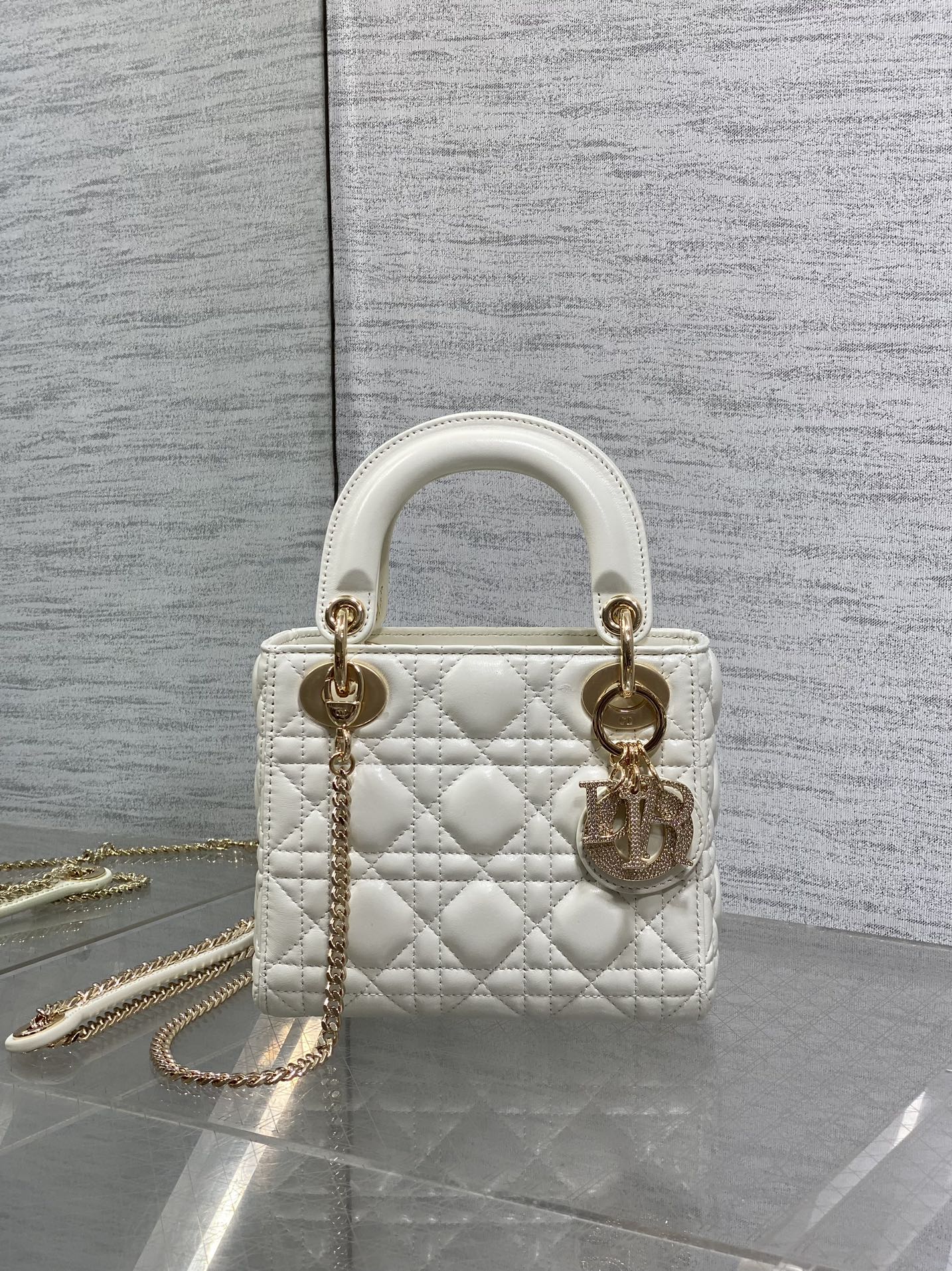 DIOR 25S MINI LADY DIOR BAG 17 IN IVORY CALFSKIN CHARM CRYSTAL EMBELLISHMENTS