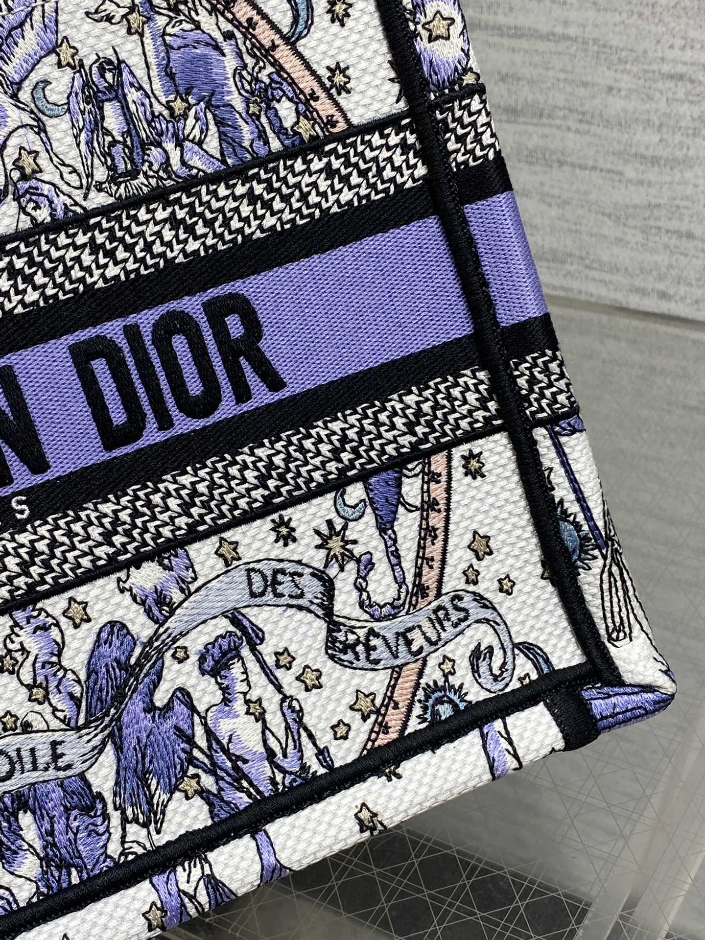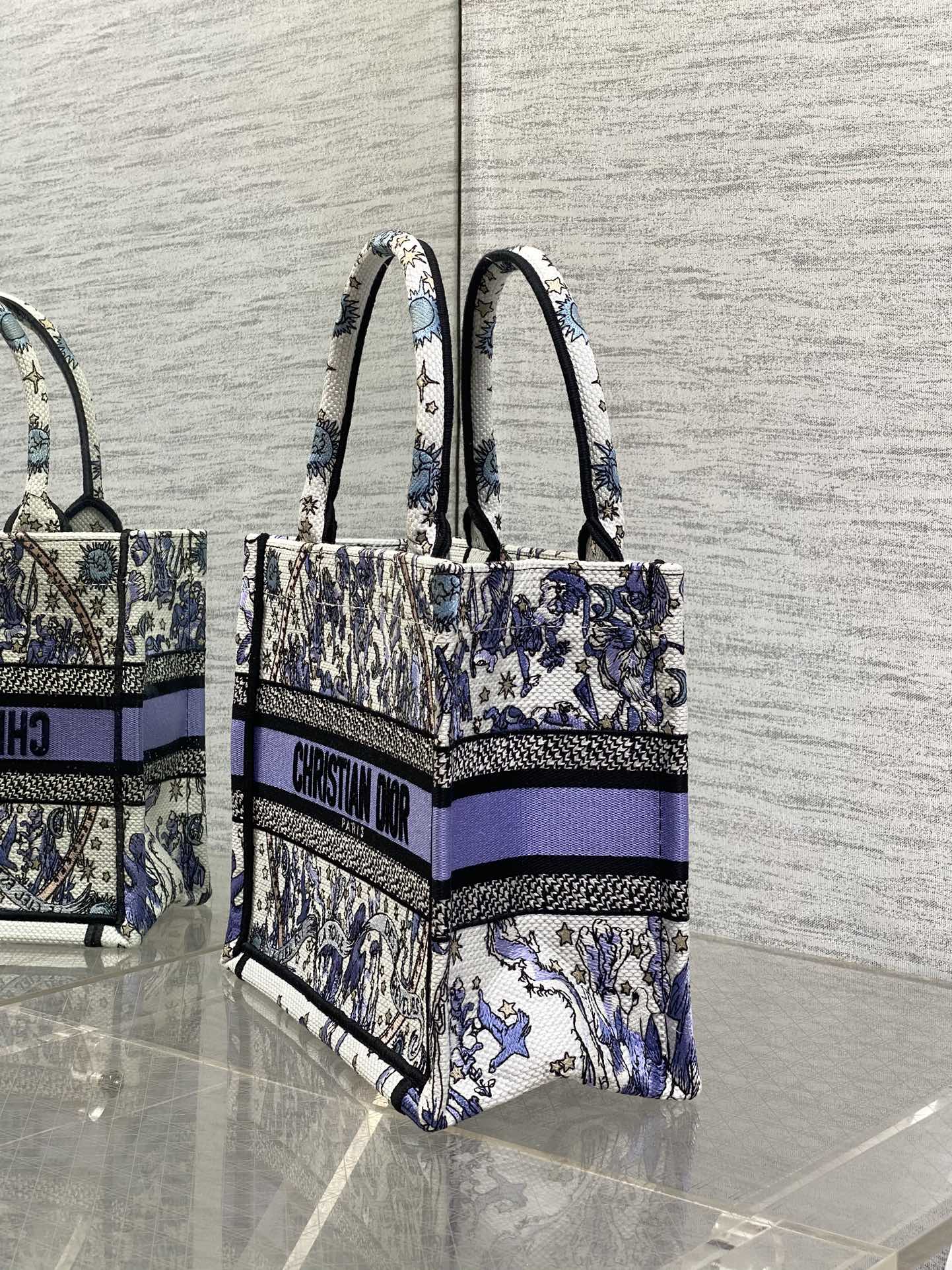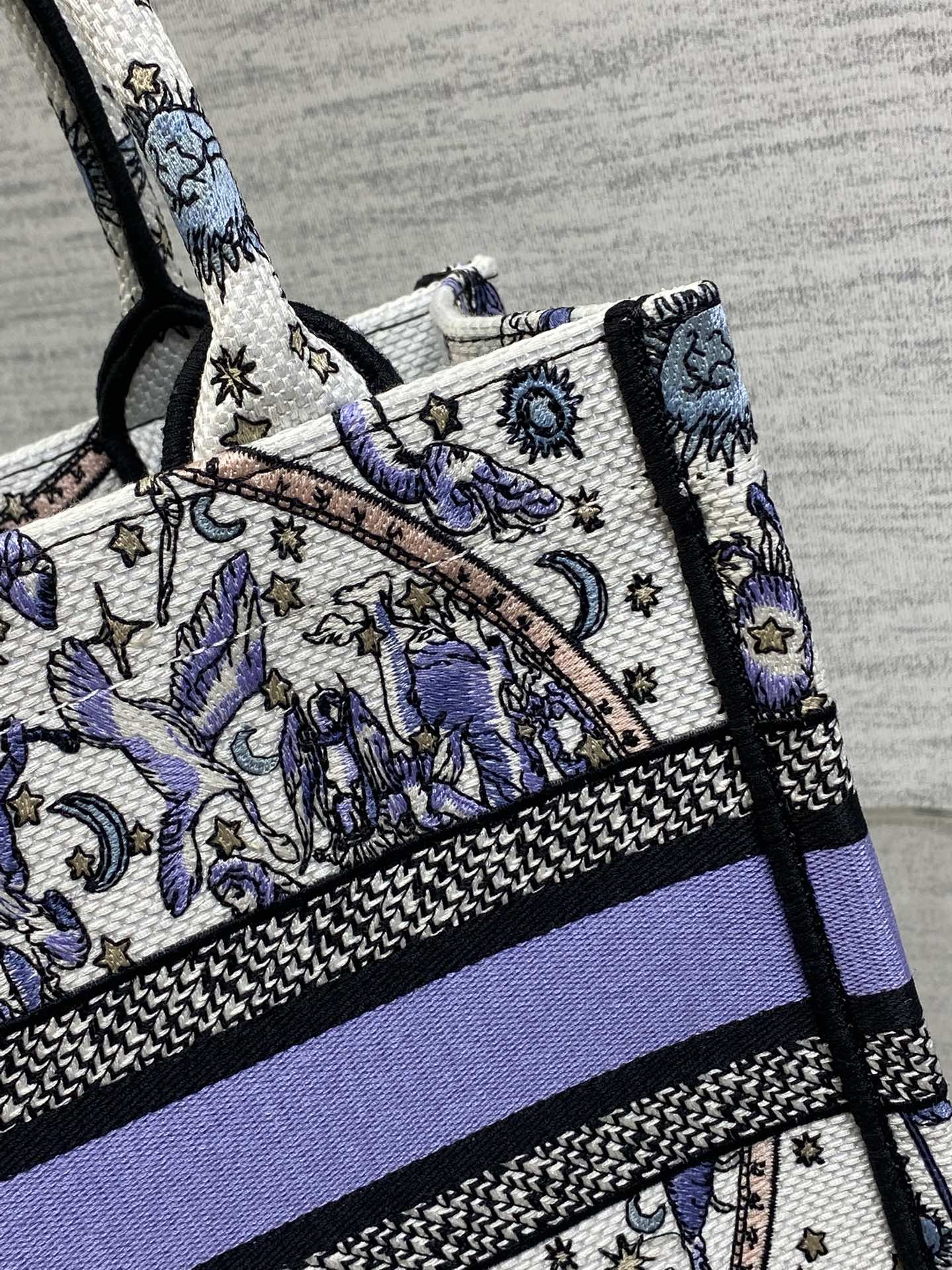 DIOR 25S SMALL BOOK TOTE 26 IN WHITE AND PURPLE DIOR NIGHT OF DREAMS EMBROIDERY