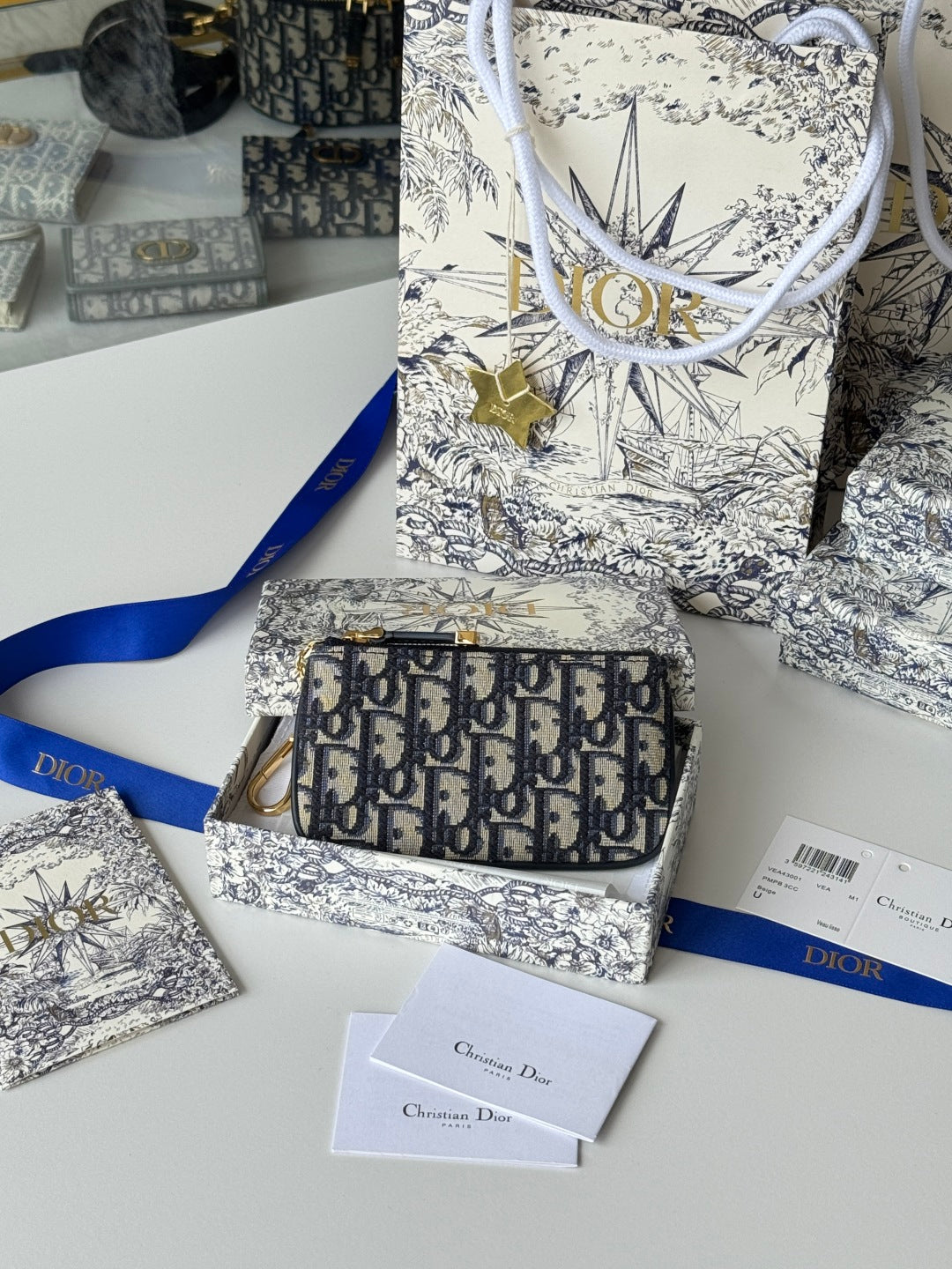 DIOR 25S TRAVEL MYRTE ZIPPED KEY CASE 14 IN DARK BLUE DIOR OBLIQUE JACQUARD CANVAS