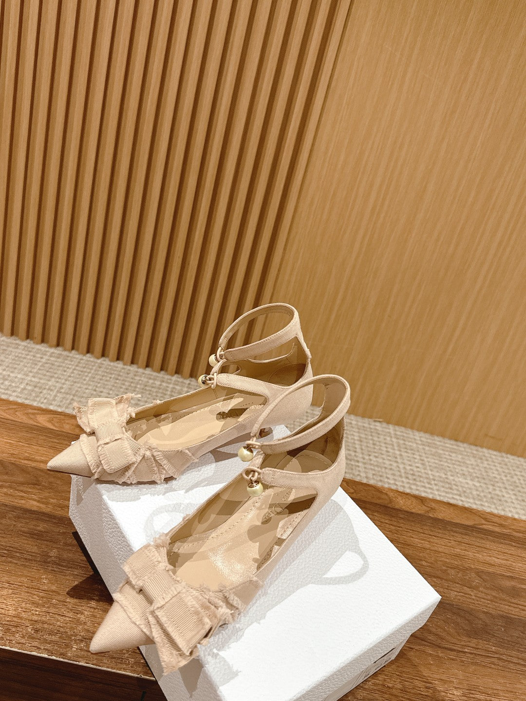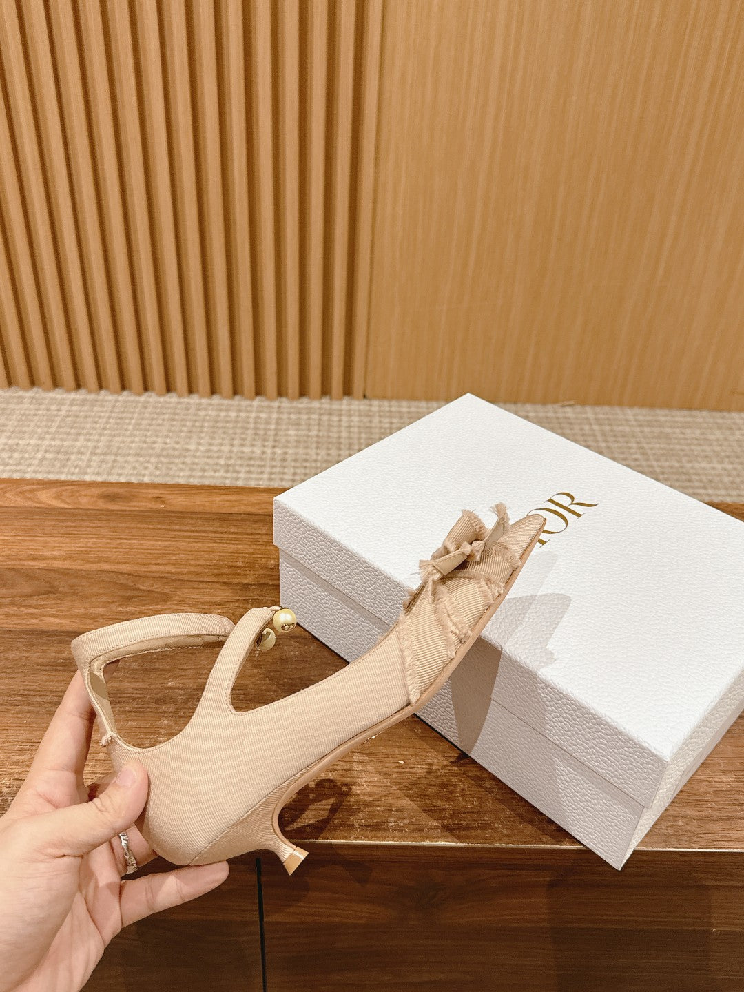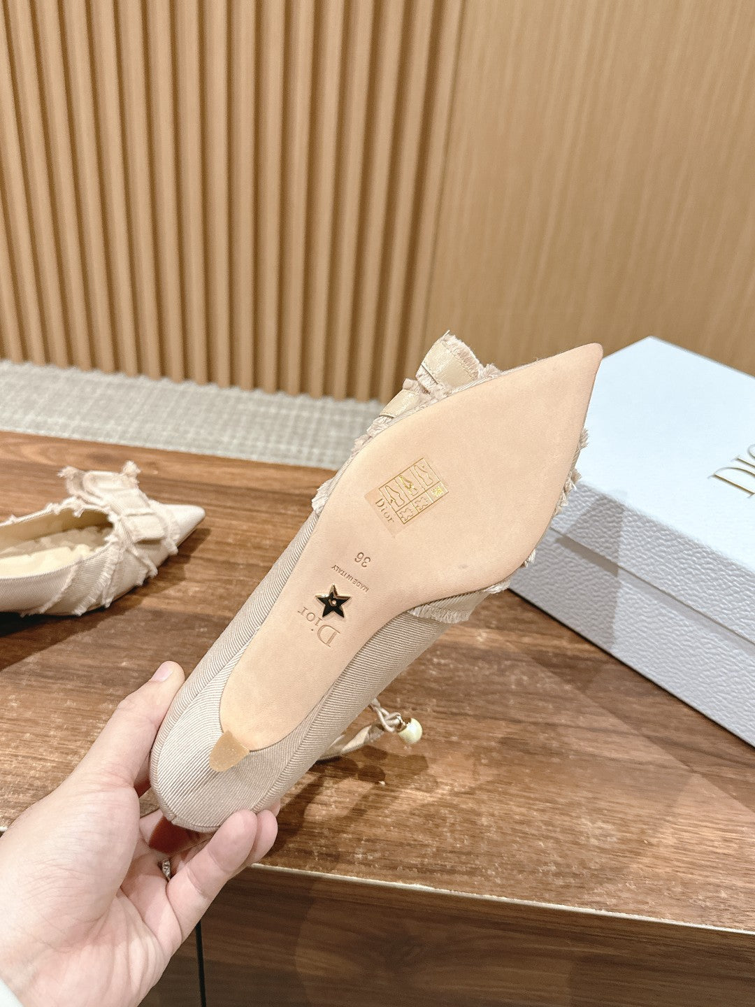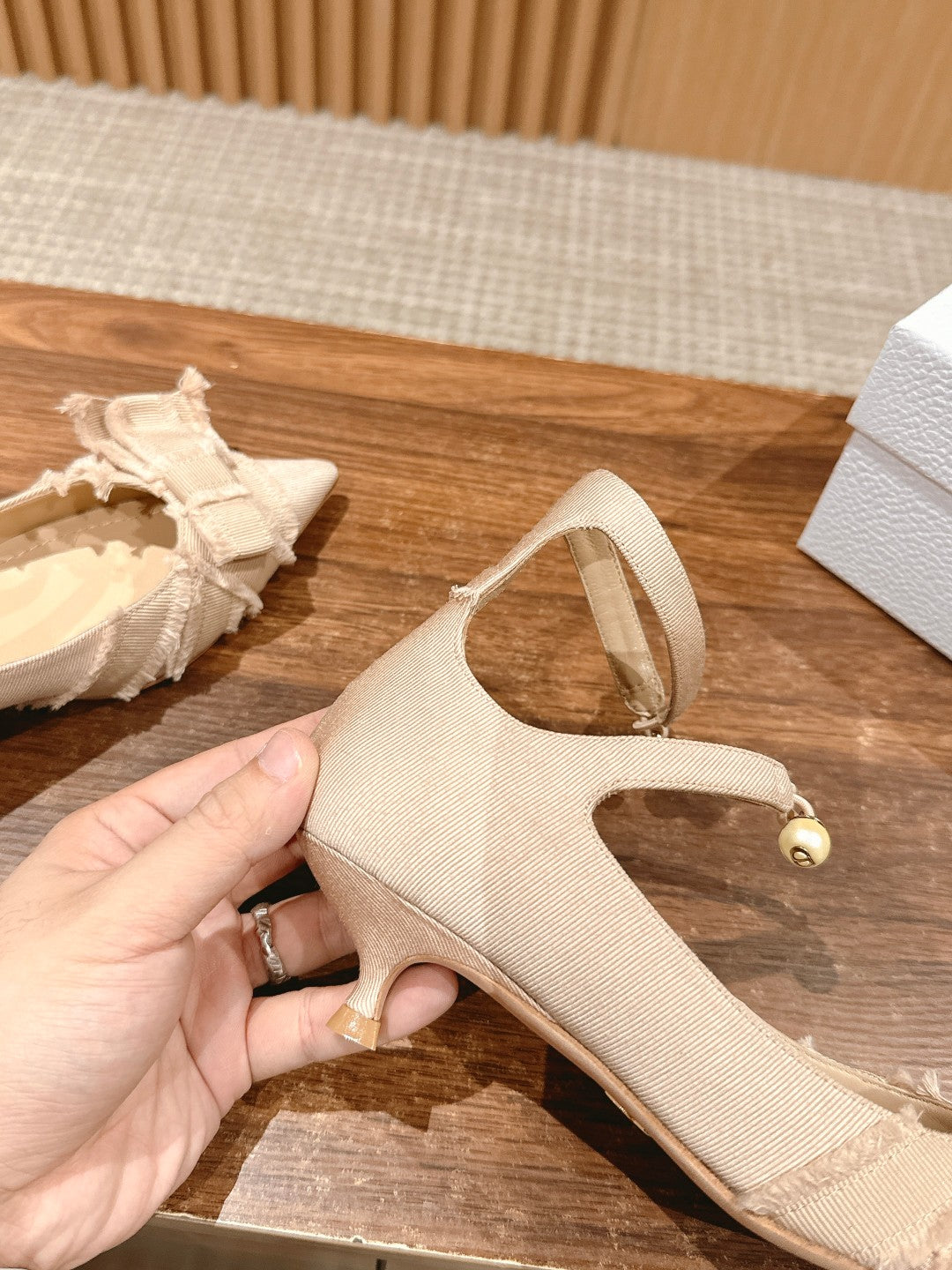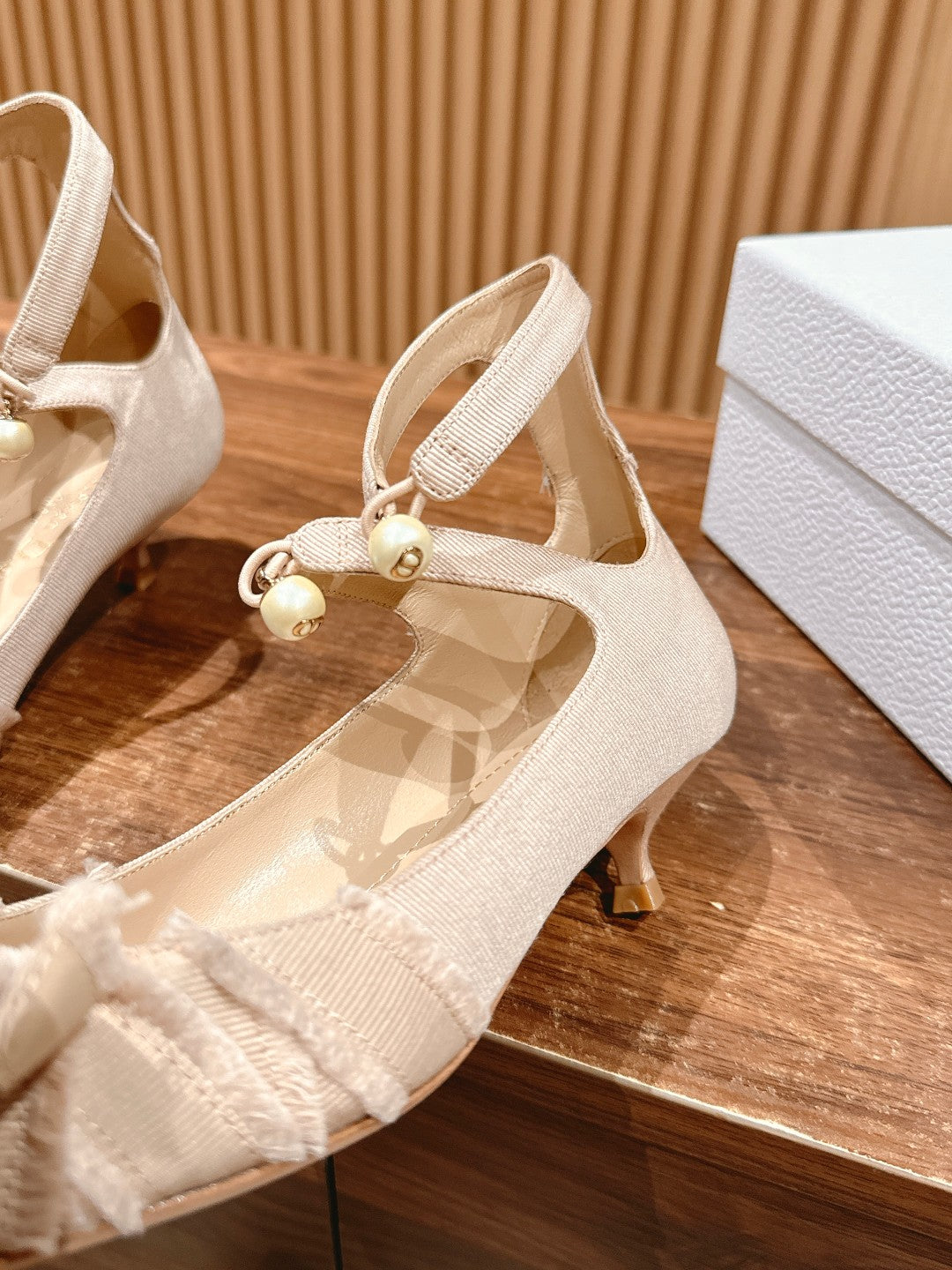 DIOR ADIORABLE HIGH HEEL 25S IN LIGHT BEIGE FABRIC WITH PEARL DETAILING