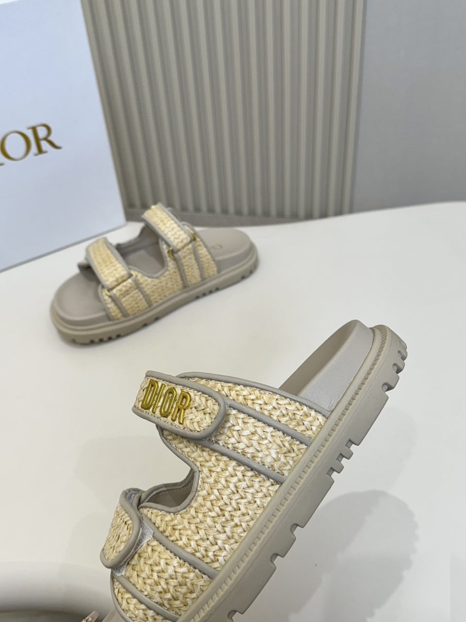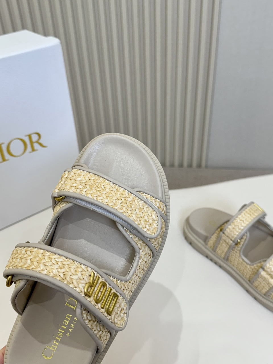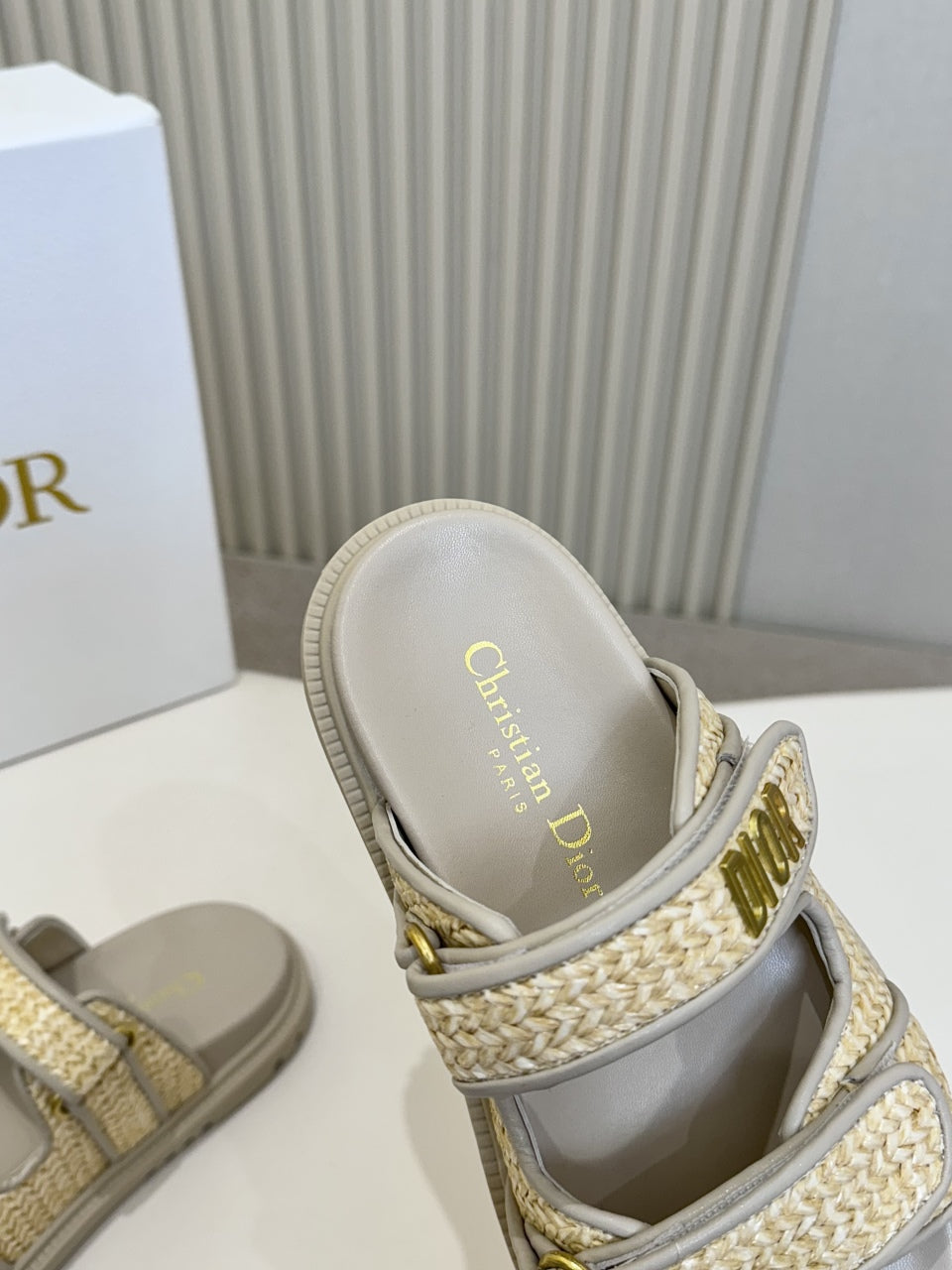 DIOR CLASSIC DOUBLE-STRAP SLIDES 25S IN BEIGE RAFFIA AND GREY CALFSKIN