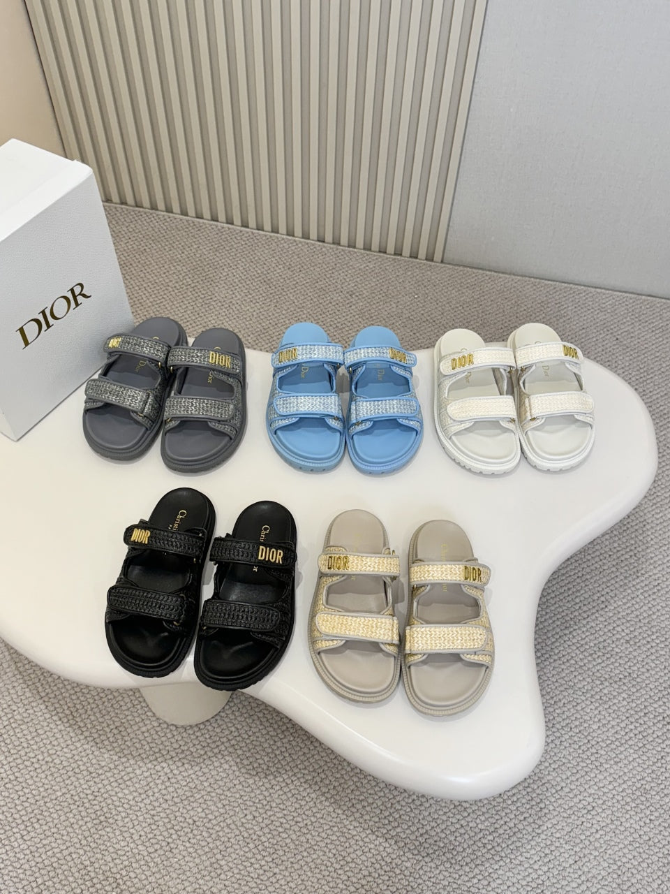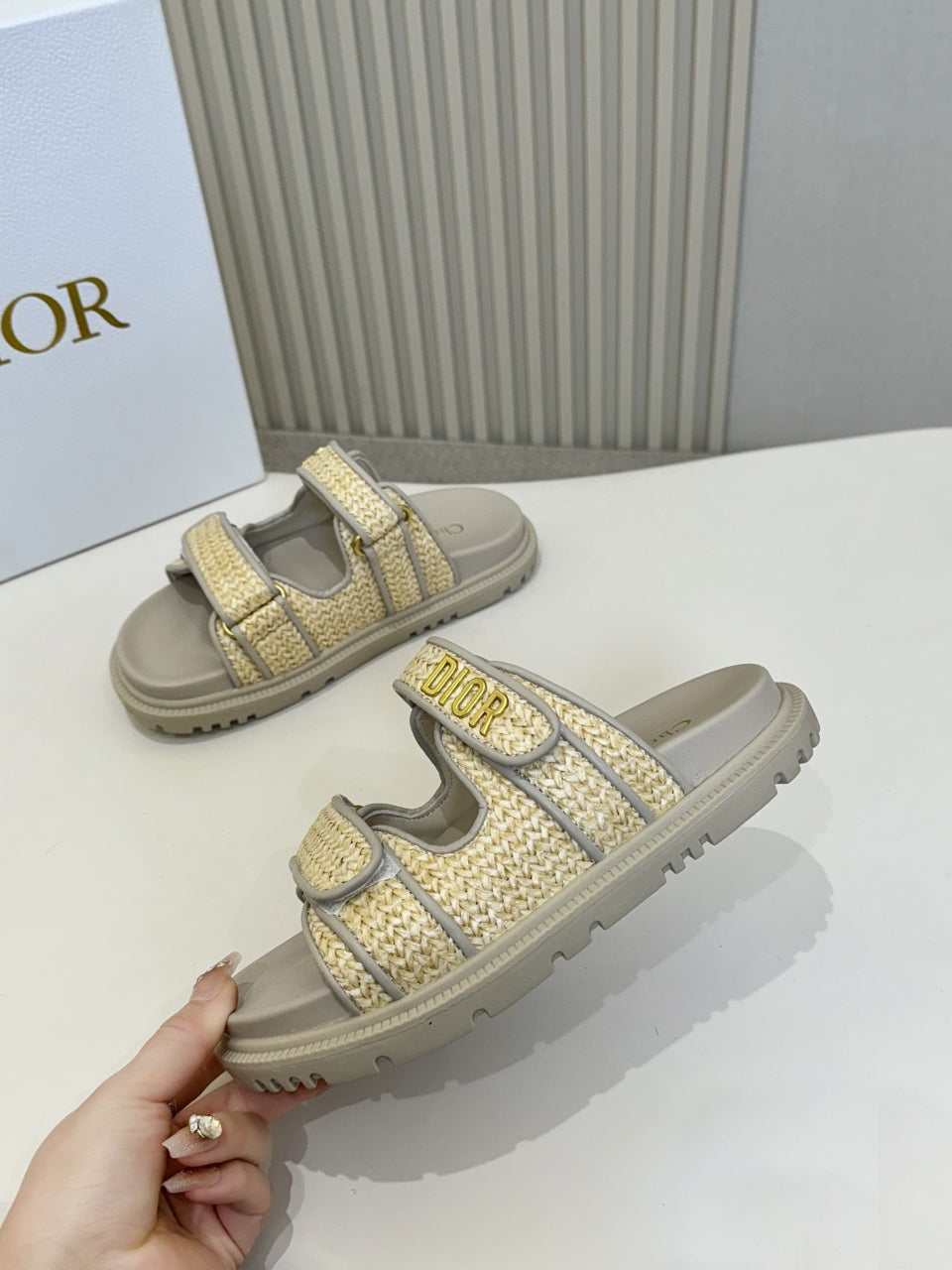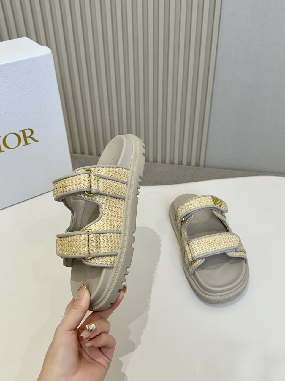 DIOR CLASSIC DOUBLE-STRAP SLIDES 25S IN BEIGE RAFFIA AND GREY CALFSKIN
