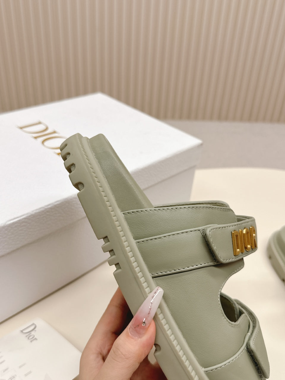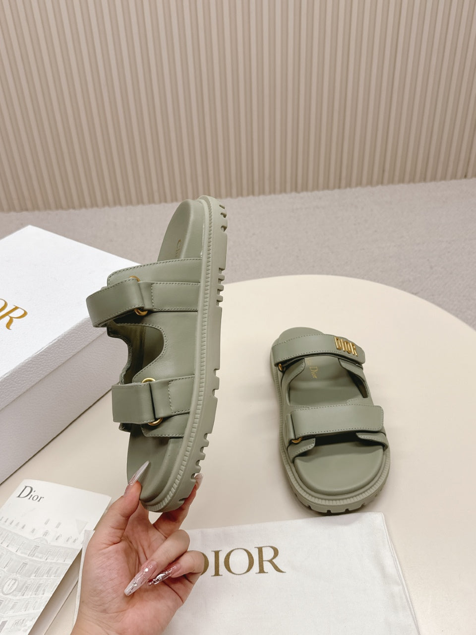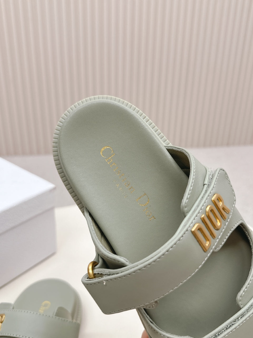 DIOR CLASSIC DOUBLE-STRAP SLIDES 25S IN LIGHT MOSS GREEN CALFSKIN