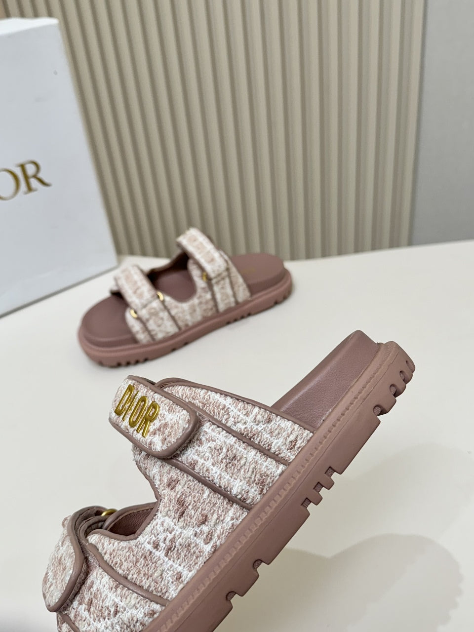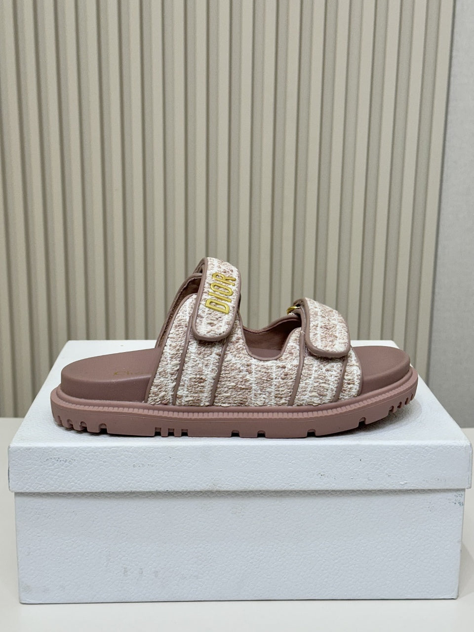 DIOR CLASSIC DOUBLE-STRAP SLIDES 25S IN ROSE BROWN TWEED AND CALFSKIN