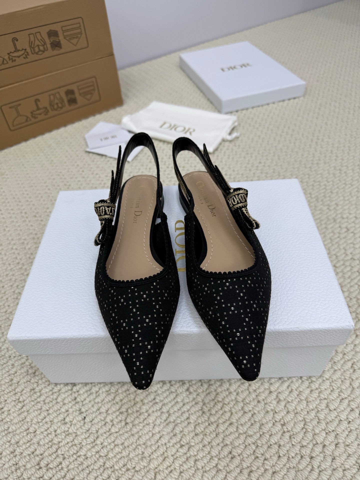 DIOR FLAT SLINGBACK 25S IN BLACK FABRIC AND BRAND NAME EMBROIDERY