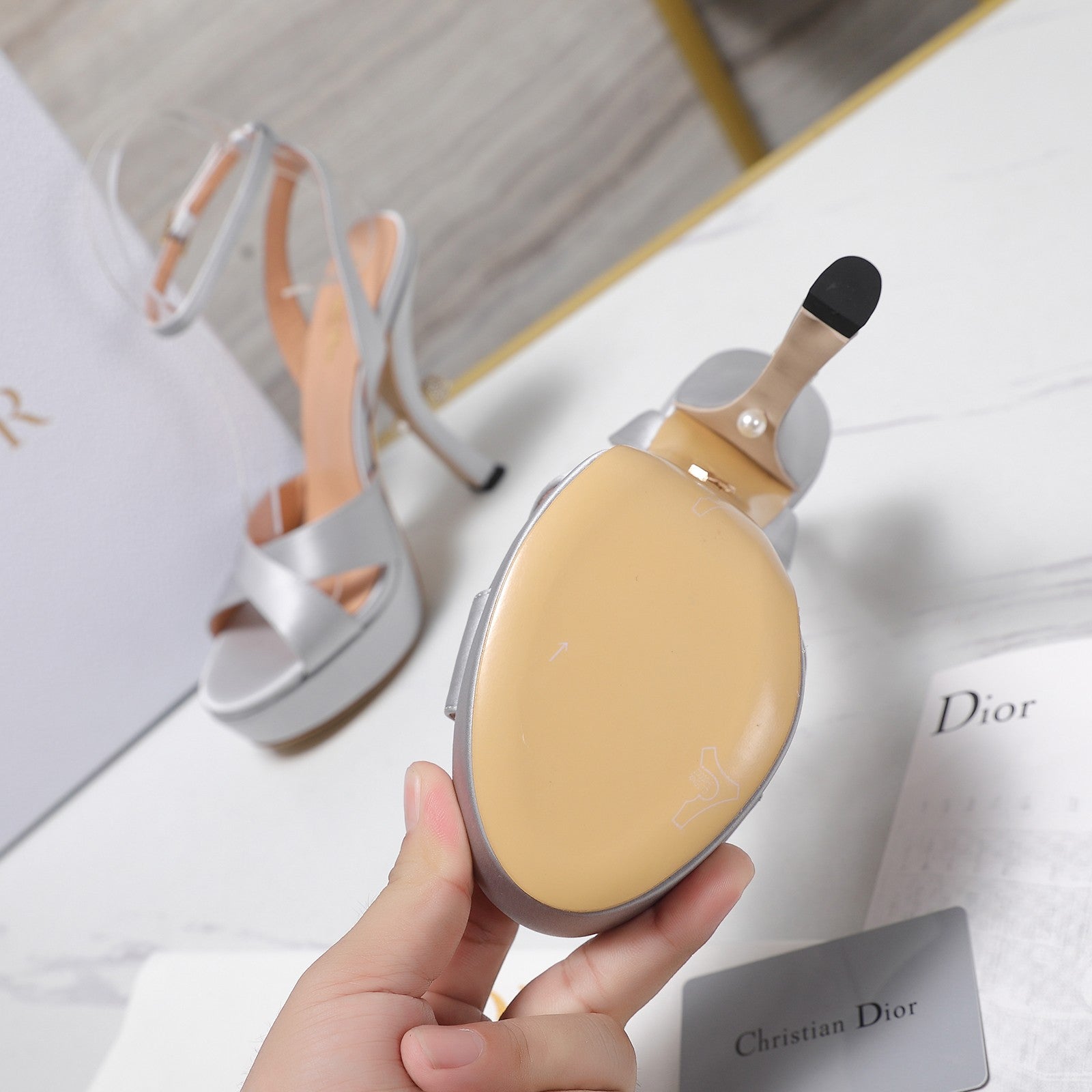 DIOR PEARL-EMBELLISHED HIGH HEEL SANDALS 25S 115 MM IN SILVER SATIN