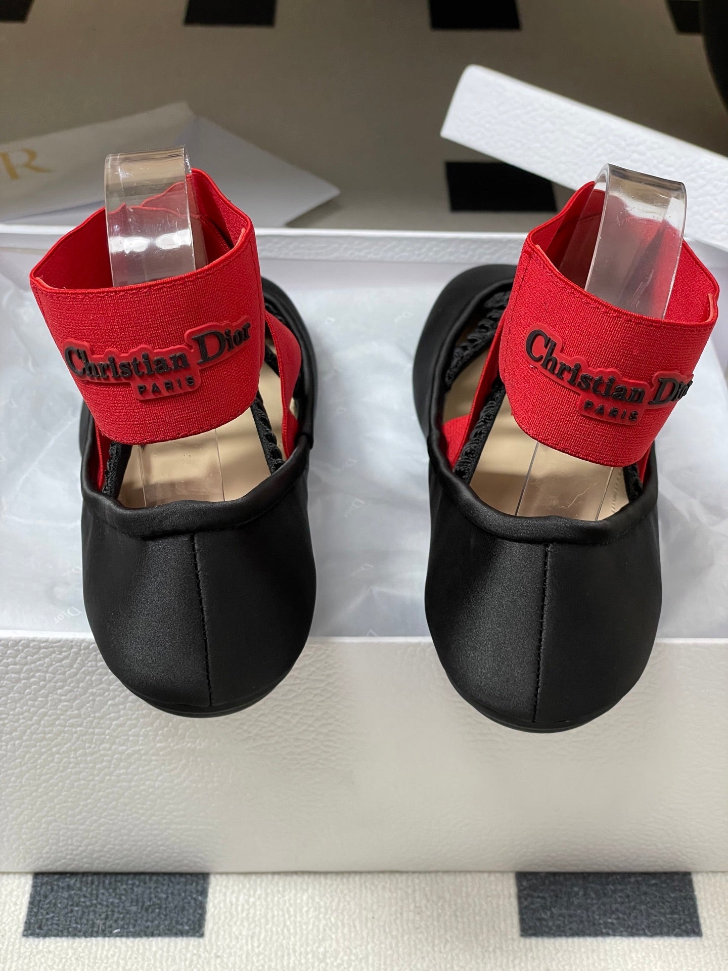 DIOR STRETCH BALLET FLATS 25S IN BLACK MIX RED FABRIC WITH CROSSED STRAPS