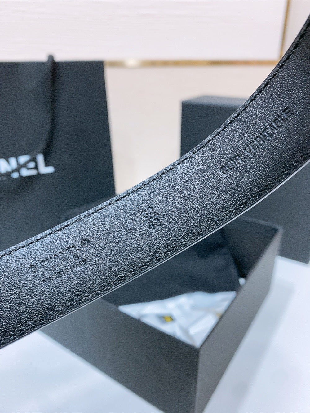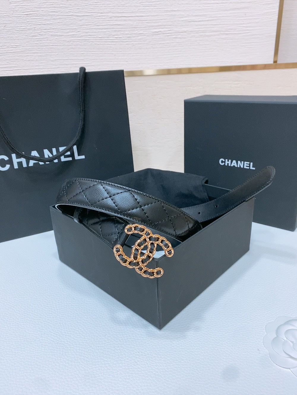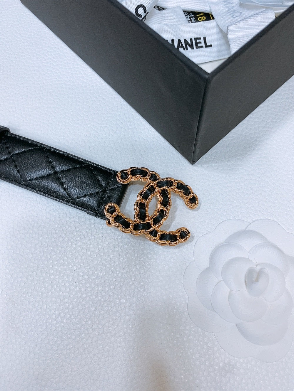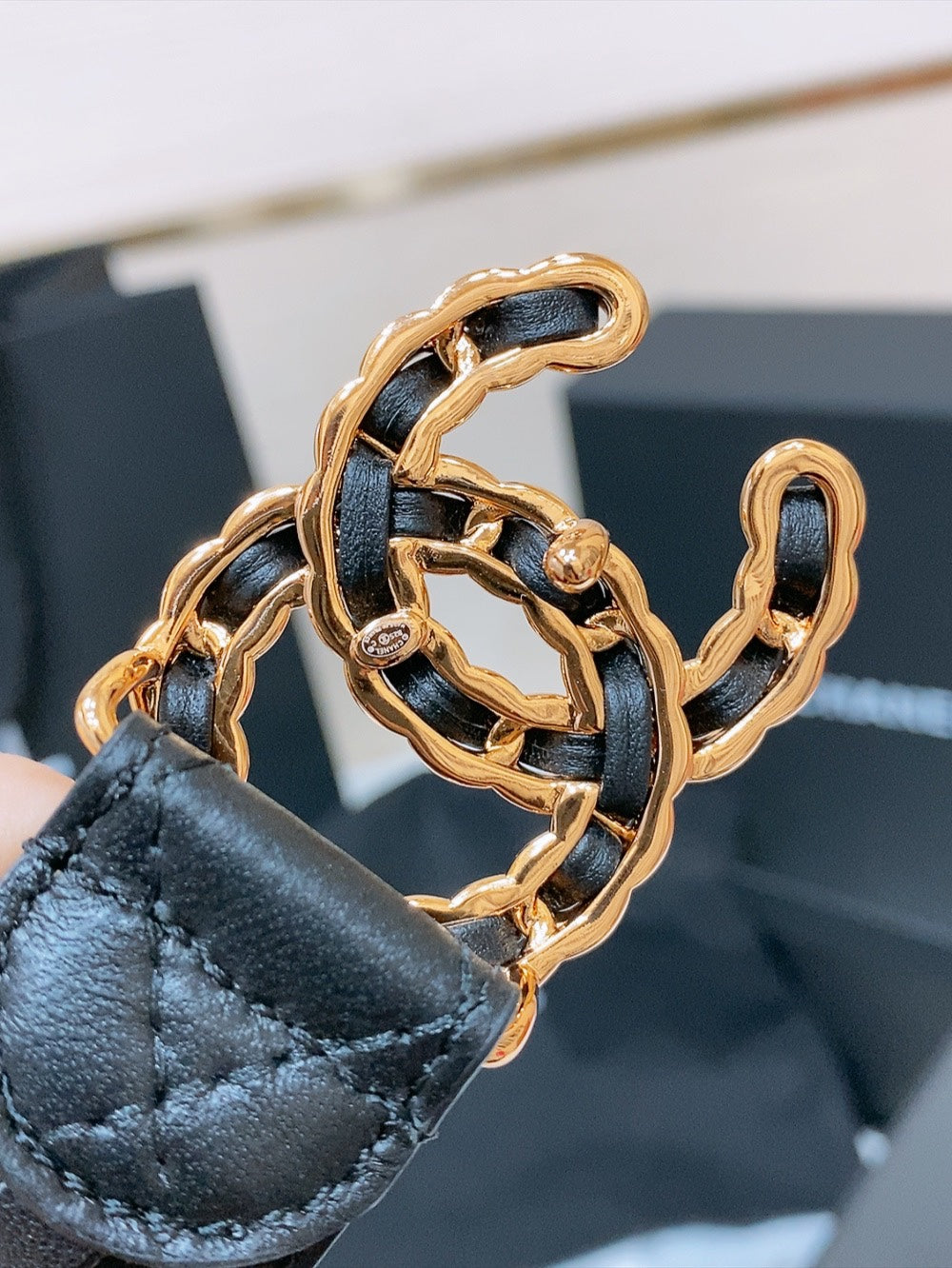 DOUBLE C 30MM IN BLACK QUILTED CALFSKIN INTERWOVEN GOLD CHAIN BUCKLE
