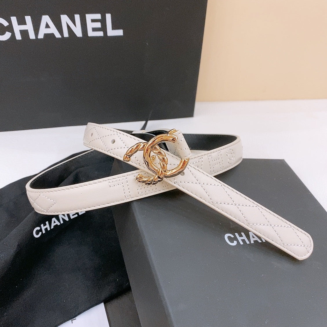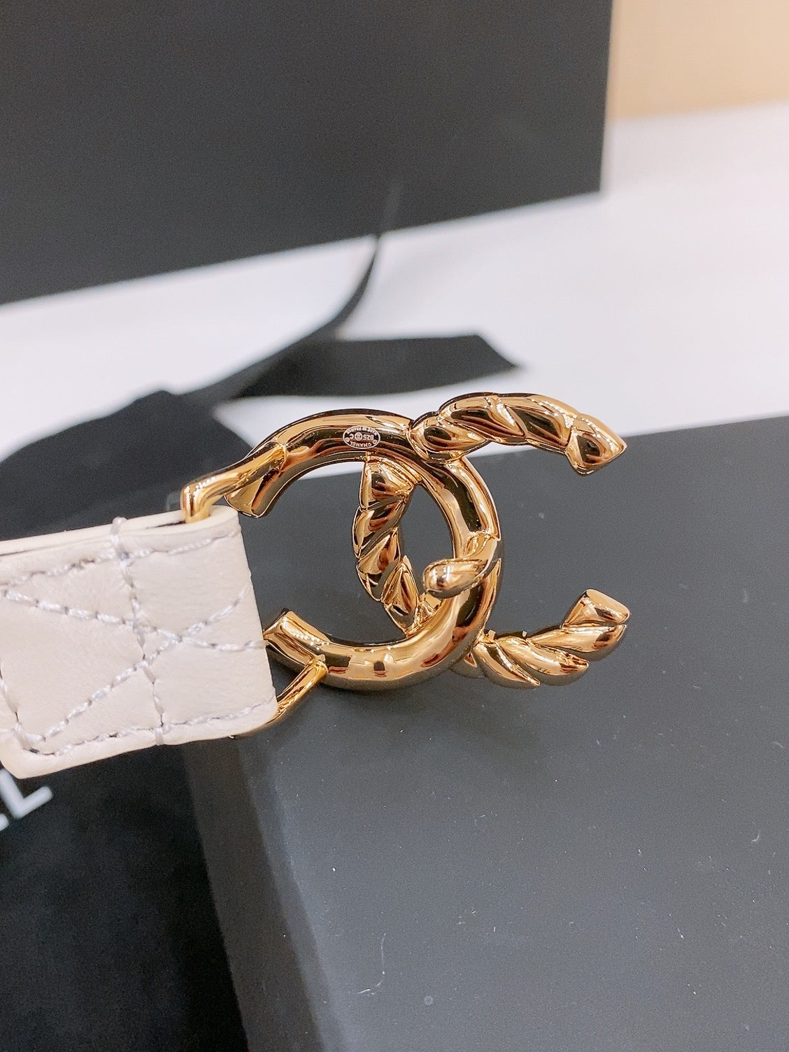 DOUBLE C BELT 20MM IN WHITE CALFSKIN WITH QUILTED STITCHING SPIRAL GOLD BUCKLE