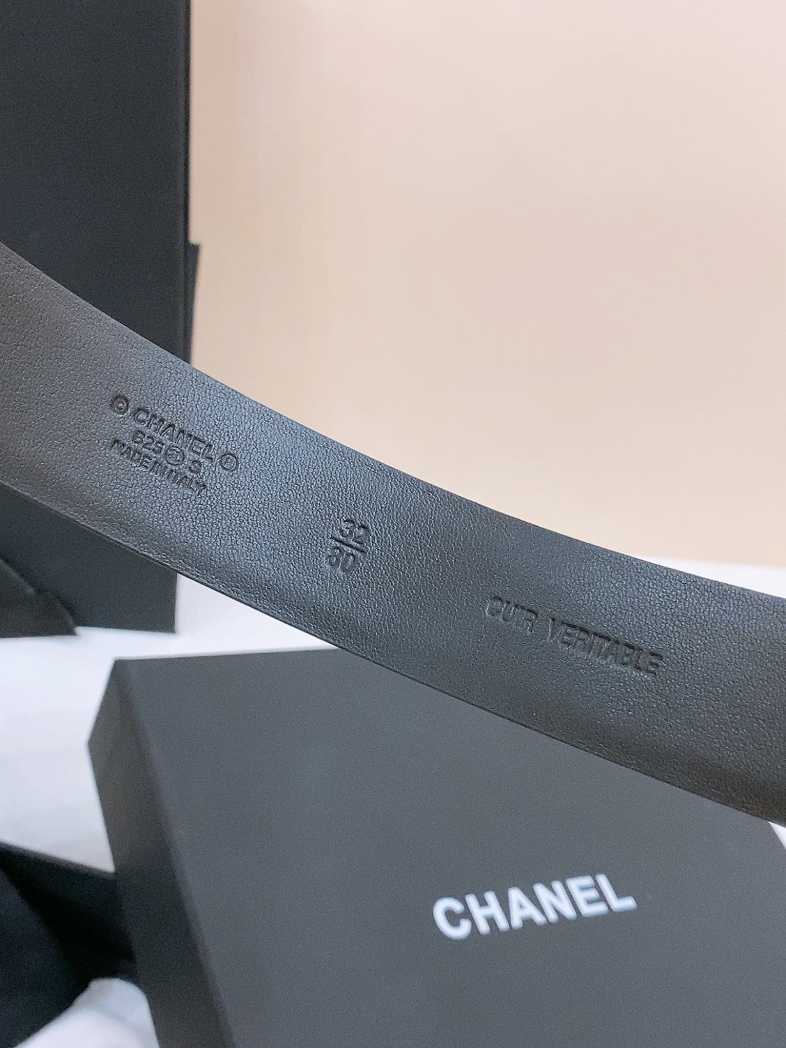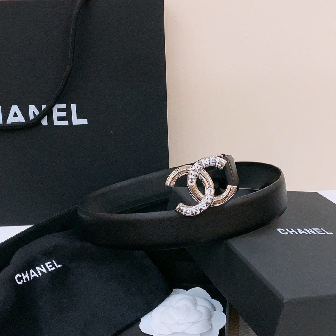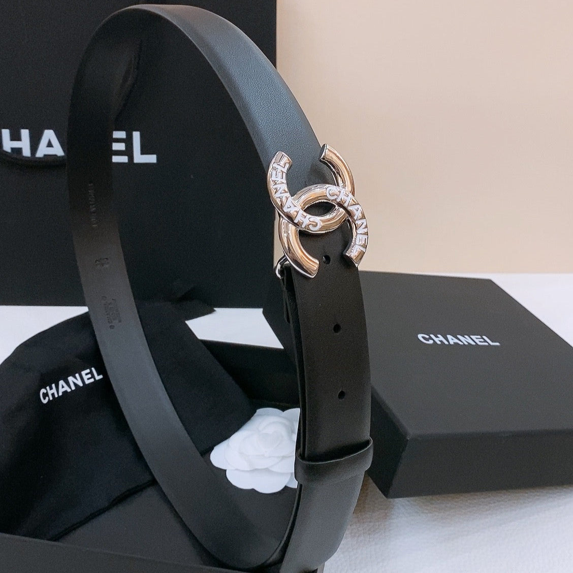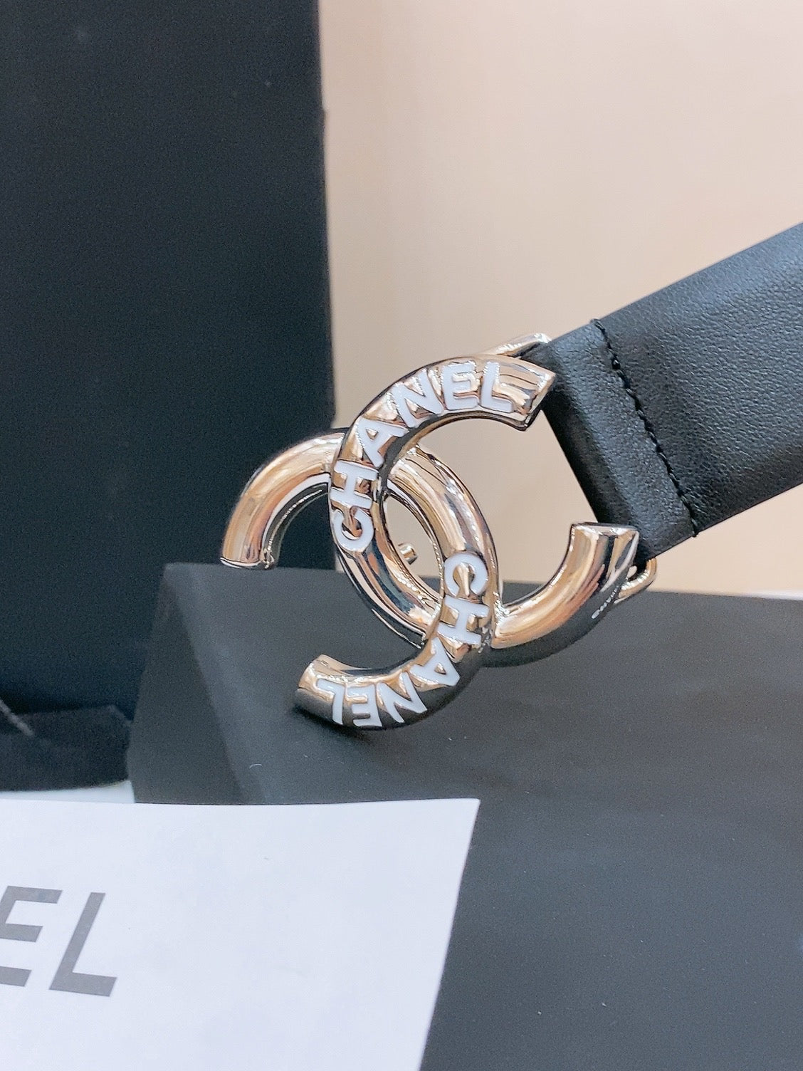 DOUBLE C BELT 30MM IN BLACK CALFSKIN SILVER BUCKLE EMBOSSED WHITE LOGO