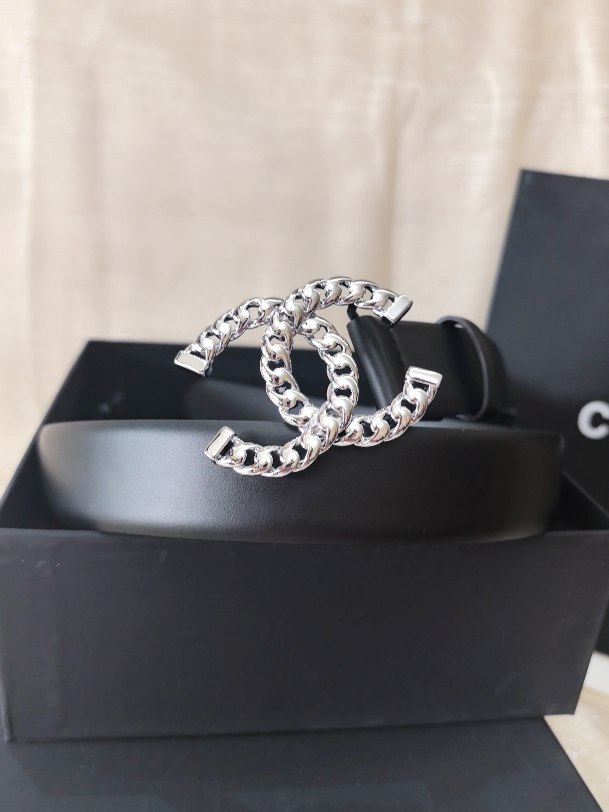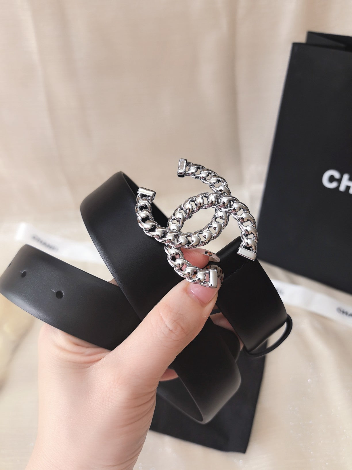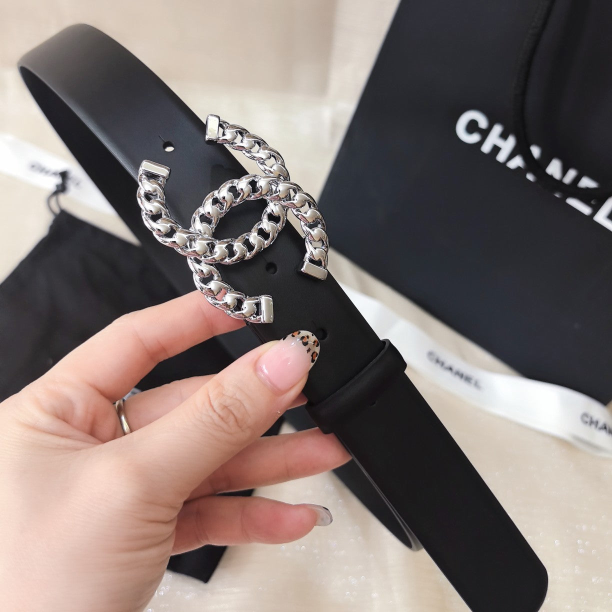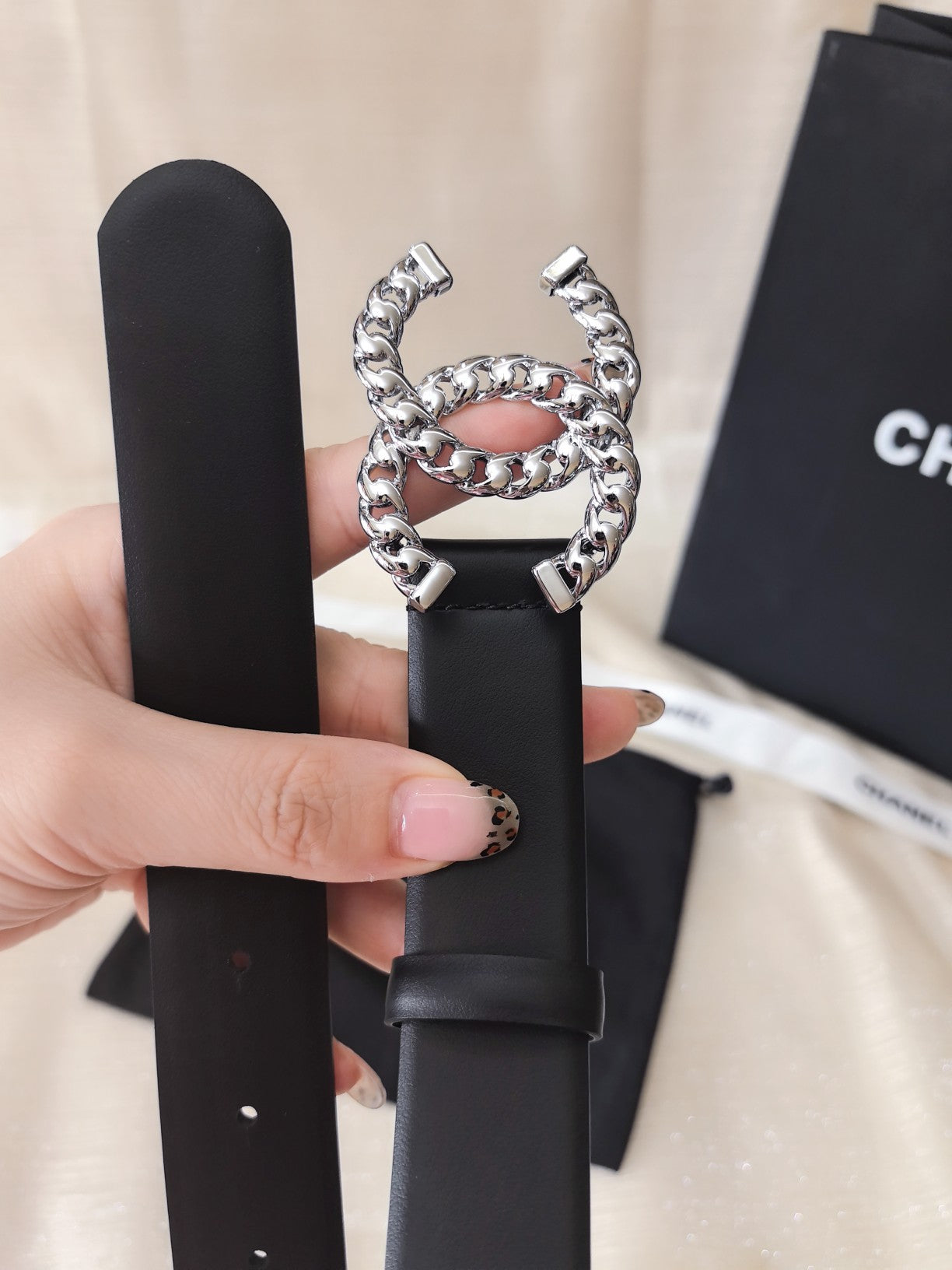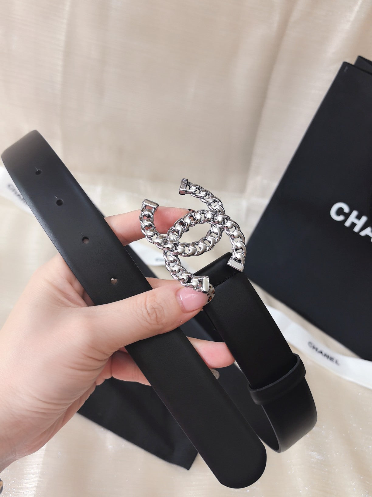 DOUBLE C BELT 30MM IN BLACK CALFSKIN SILVER CHAIN BUCKLE