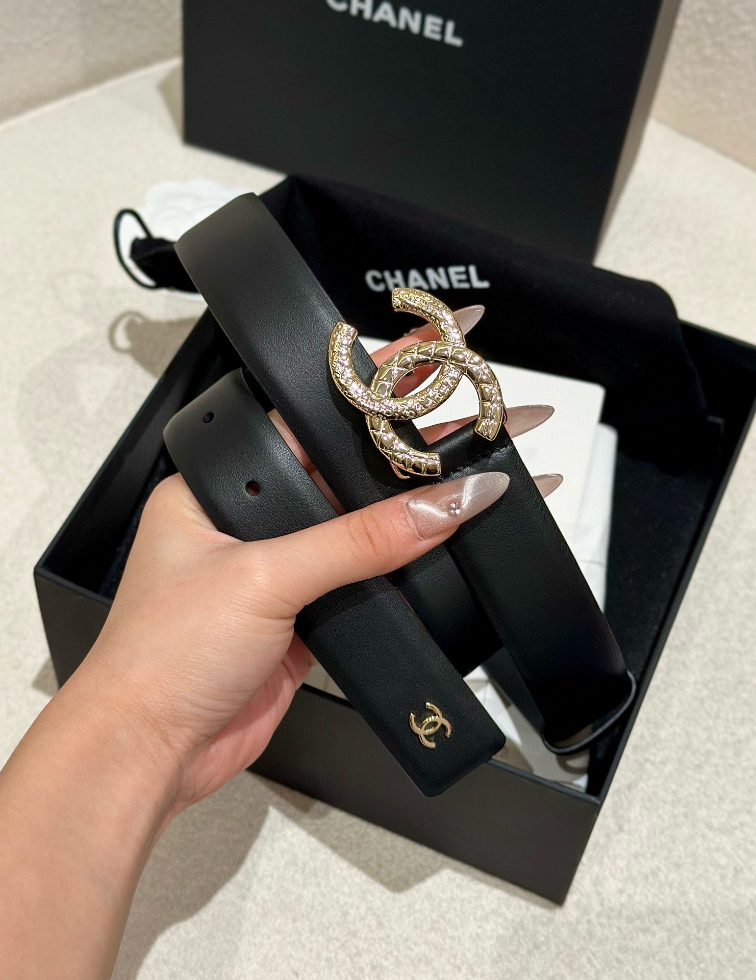 DOUBLE C BELT 30MM IN BLACK CALFSKIN WITH GOLD HARDWARE AND CARO STITCHING