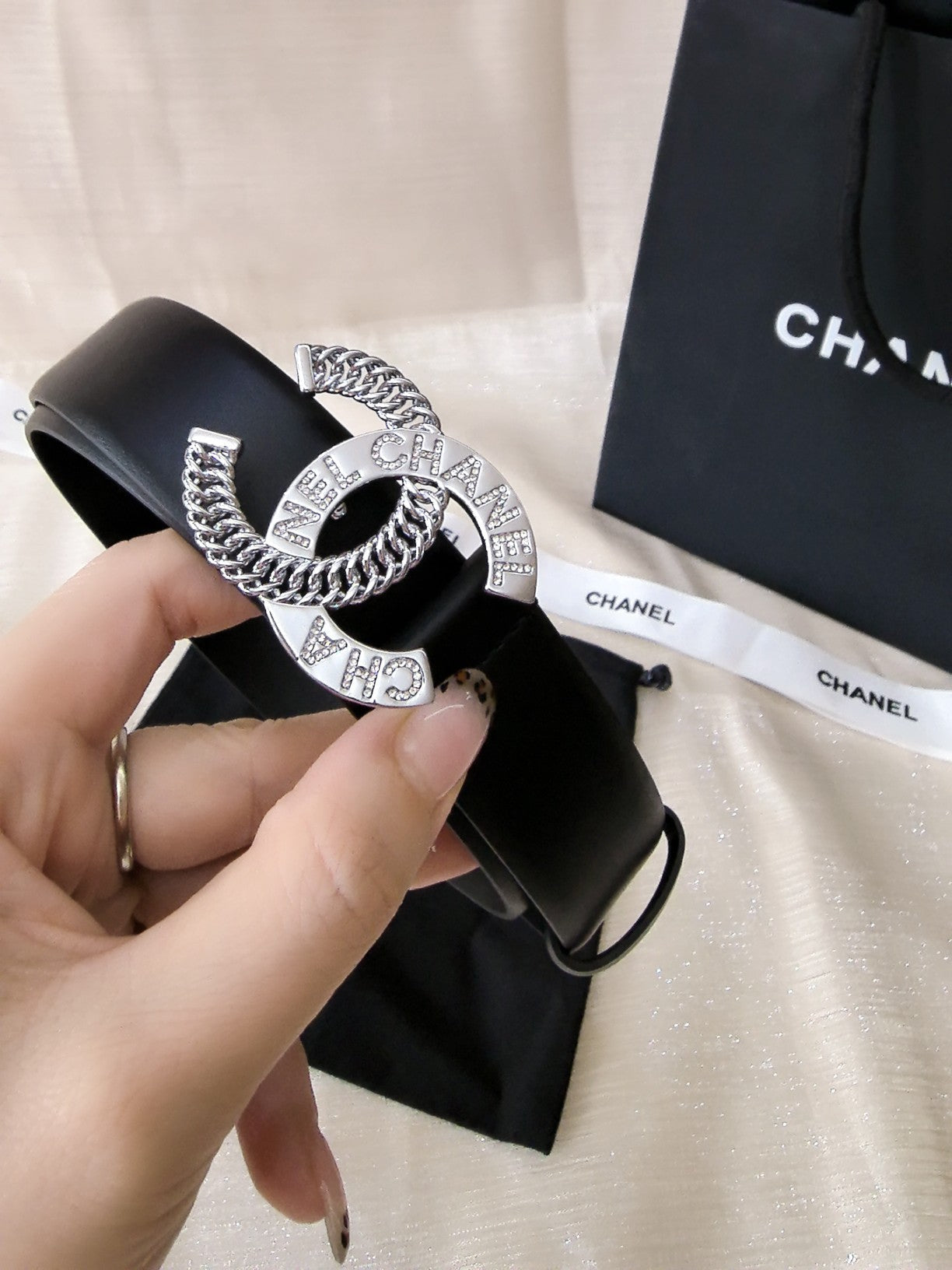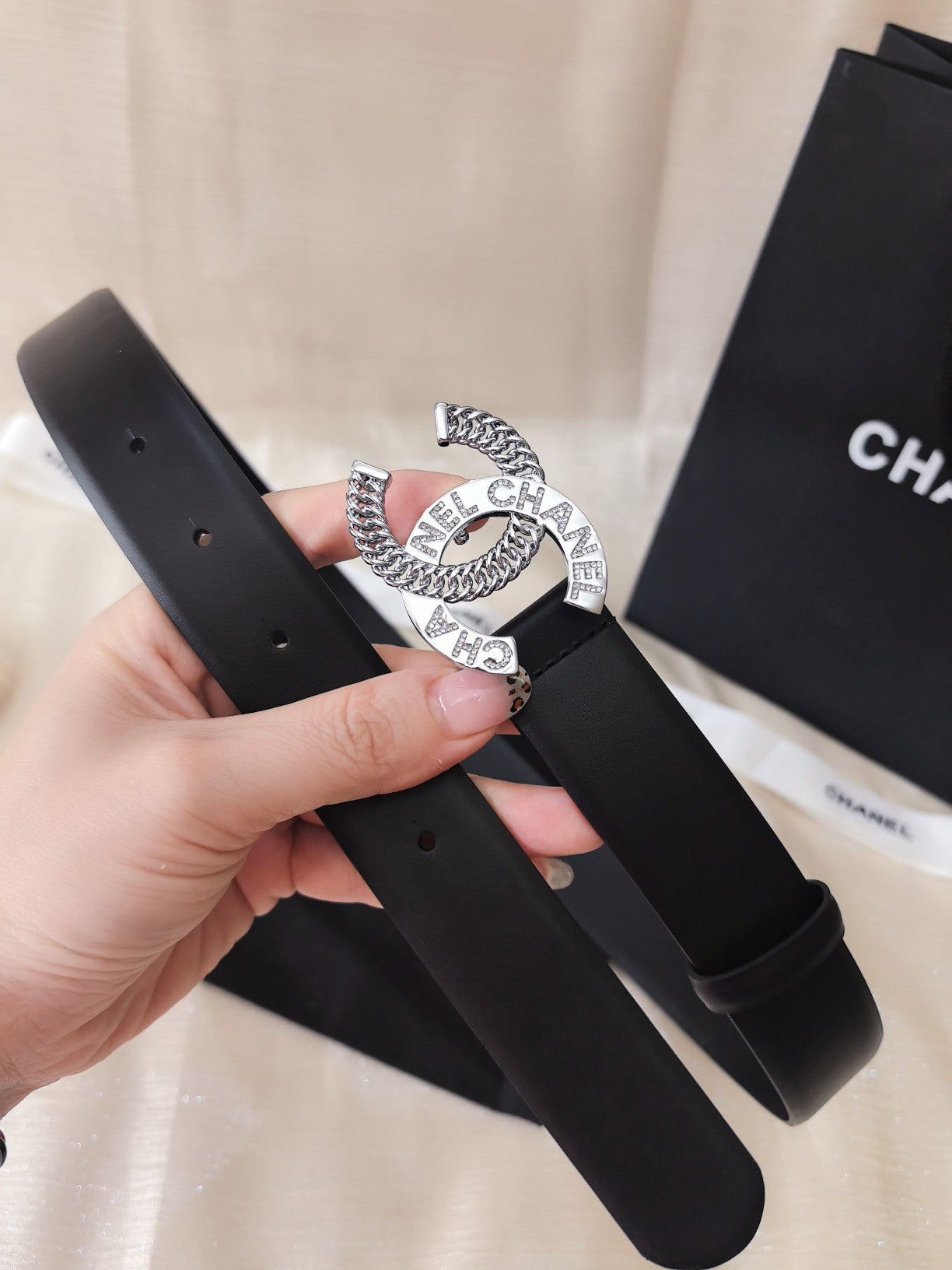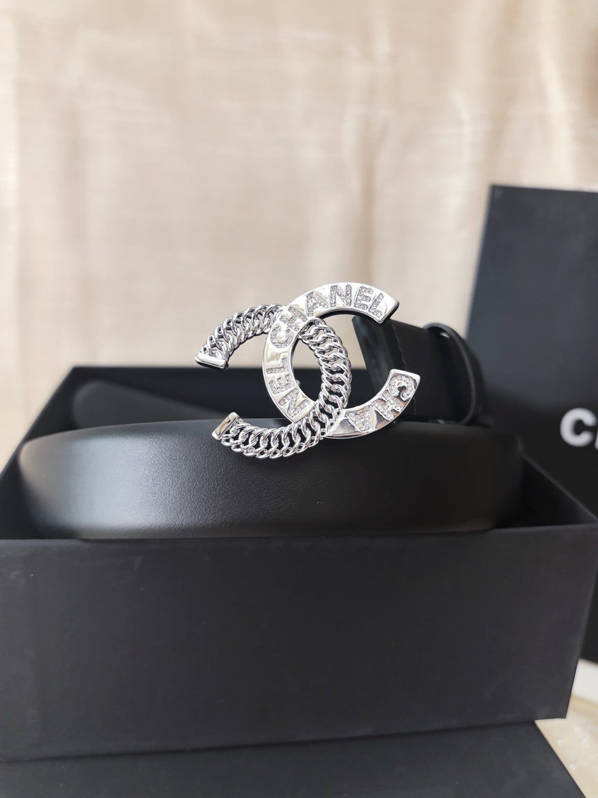 DOUBLE C CHAIN BELT 30MM IN BLACK CALFSKIN LOGO CRYSTAL GOLD BUCKLE