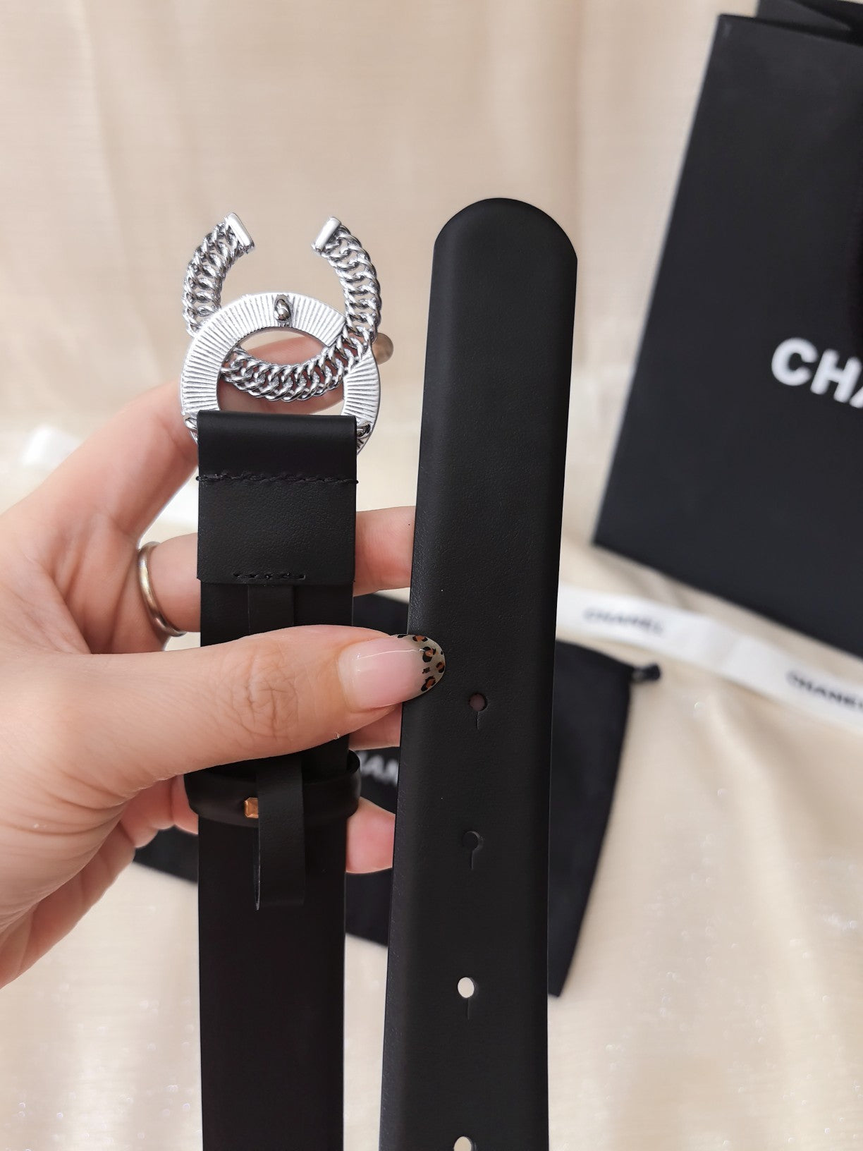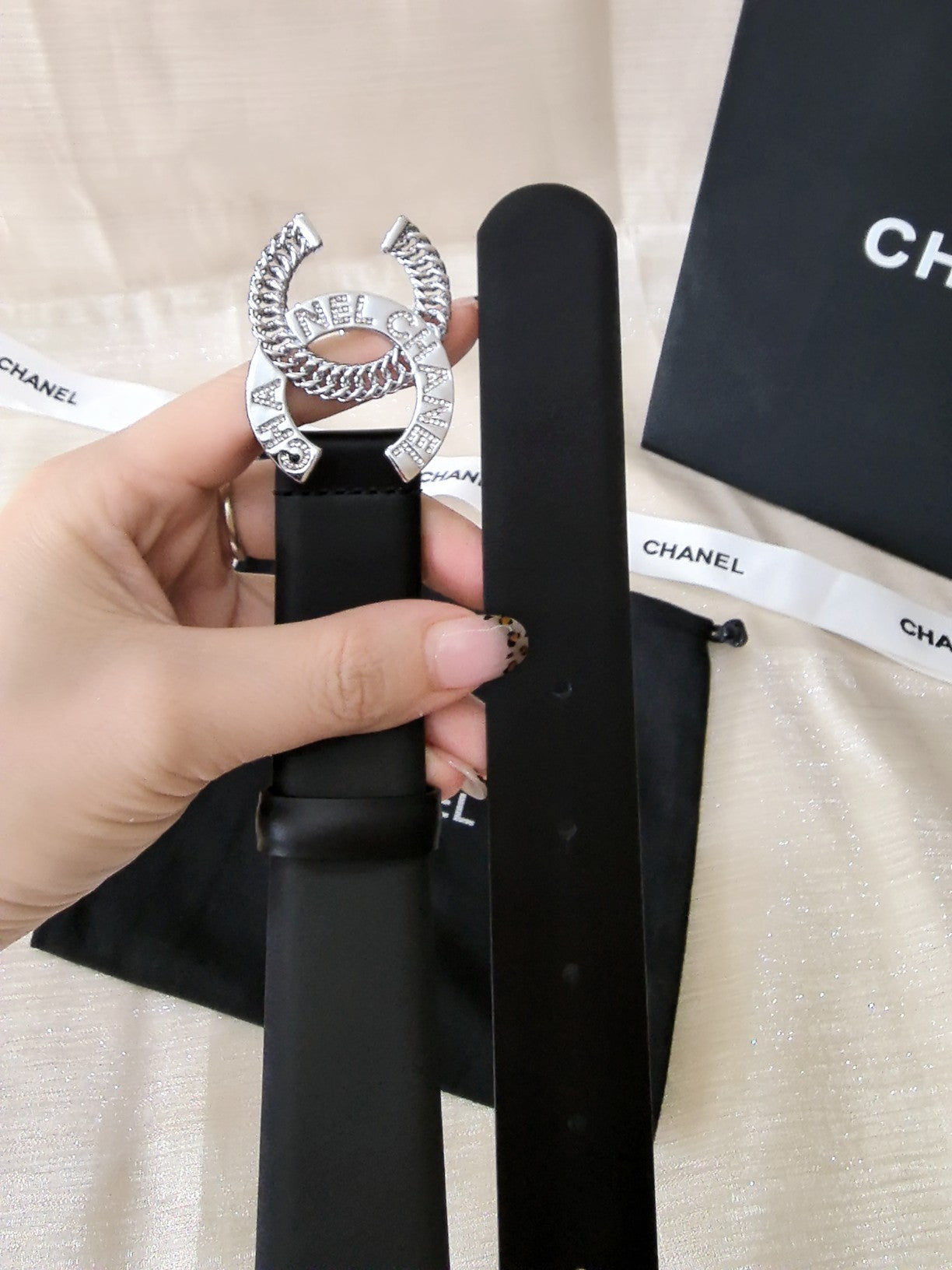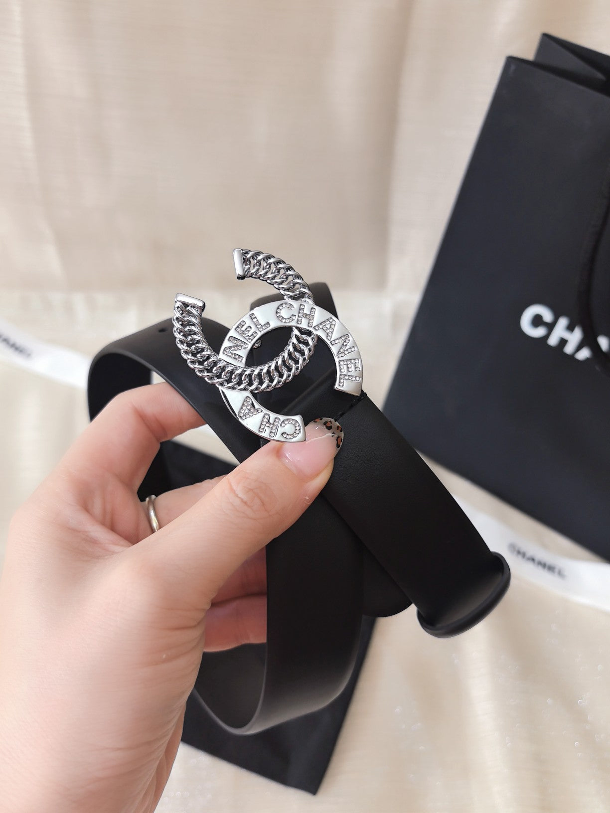 DOUBLE C CHAIN BELT 30MM IN BLACK CALFSKIN LOGO CRYSTAL GOLD BUCKLE