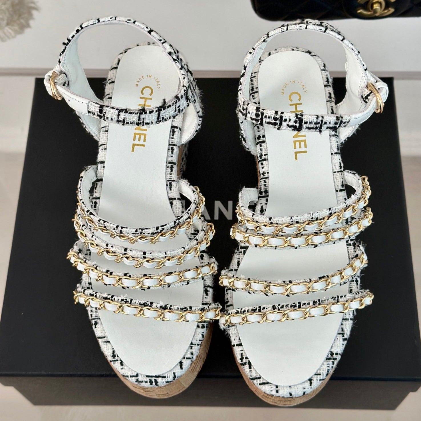 Double C Wooden Chain Platform Block Heel Sandals Black Caro/ White