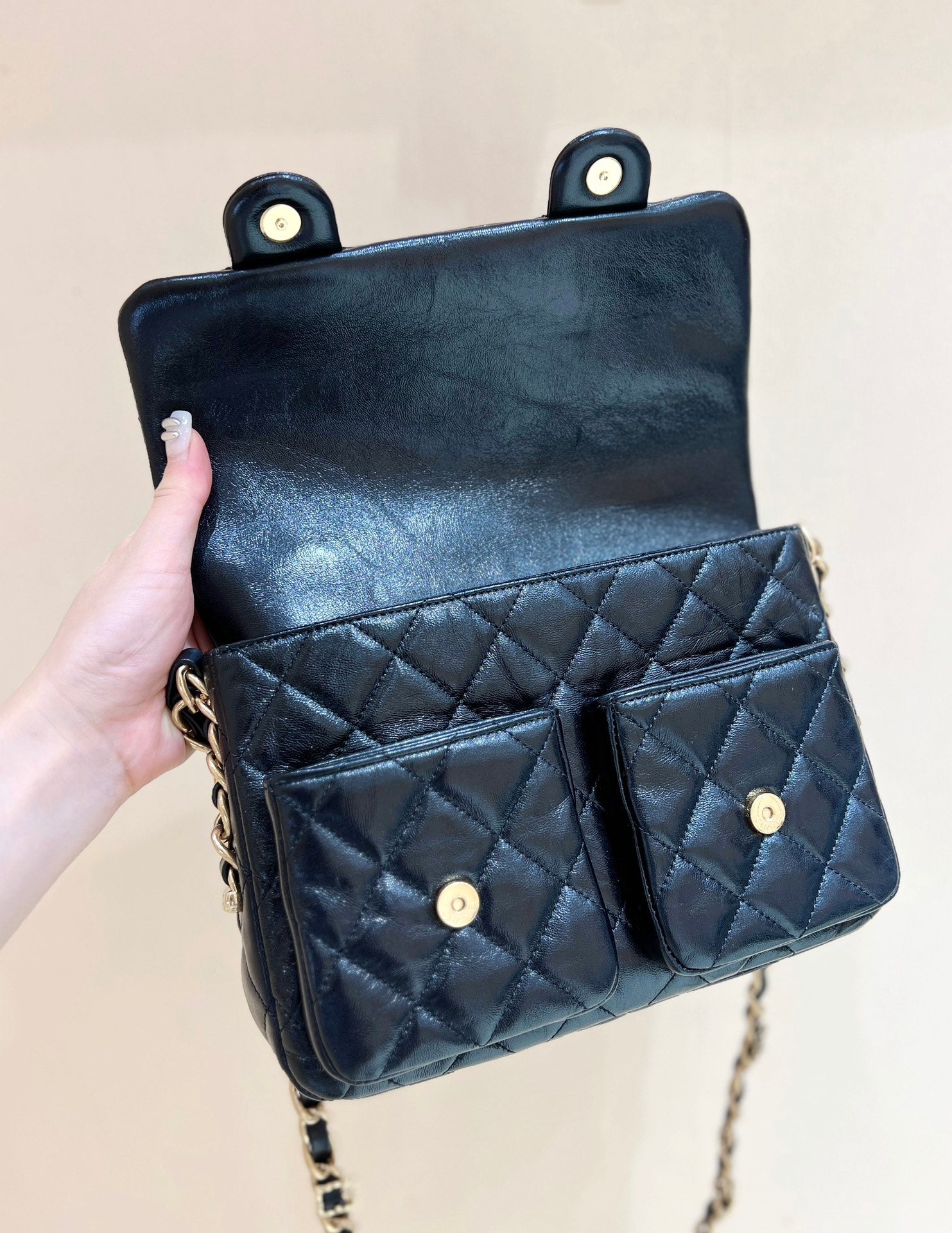 DOUBLE POCKETS FLAP BAG TOP HANDLE 24 IN BLACK LAMBSKIN GOLD HARDWARE