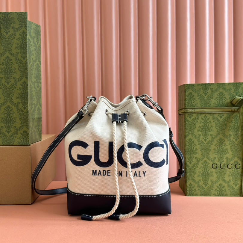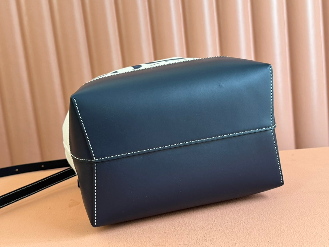 DRAWSTRING SHOULDER BAG LOGO PRINT 31 IN WHITE CANVAS DARK BLUE CALFSKIN