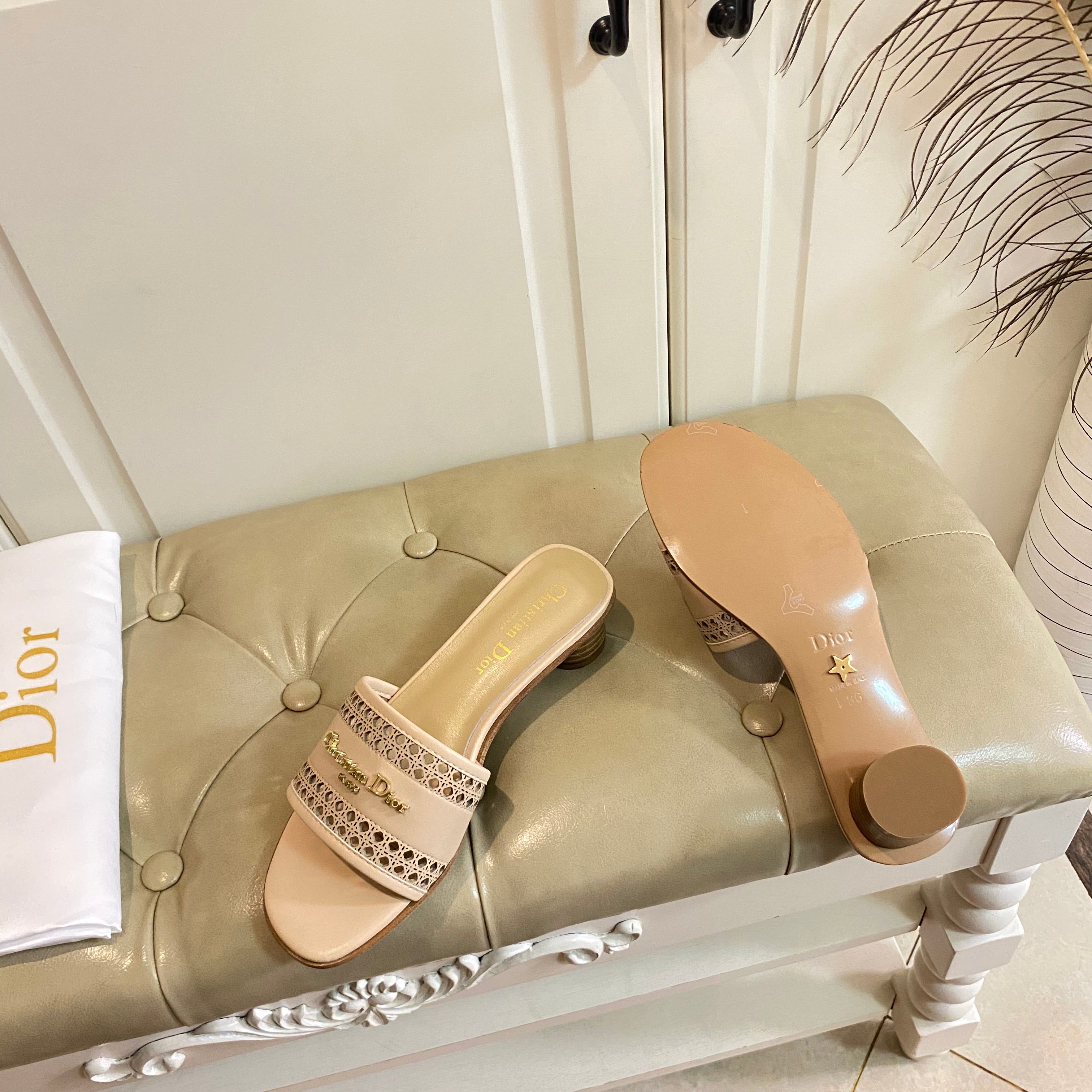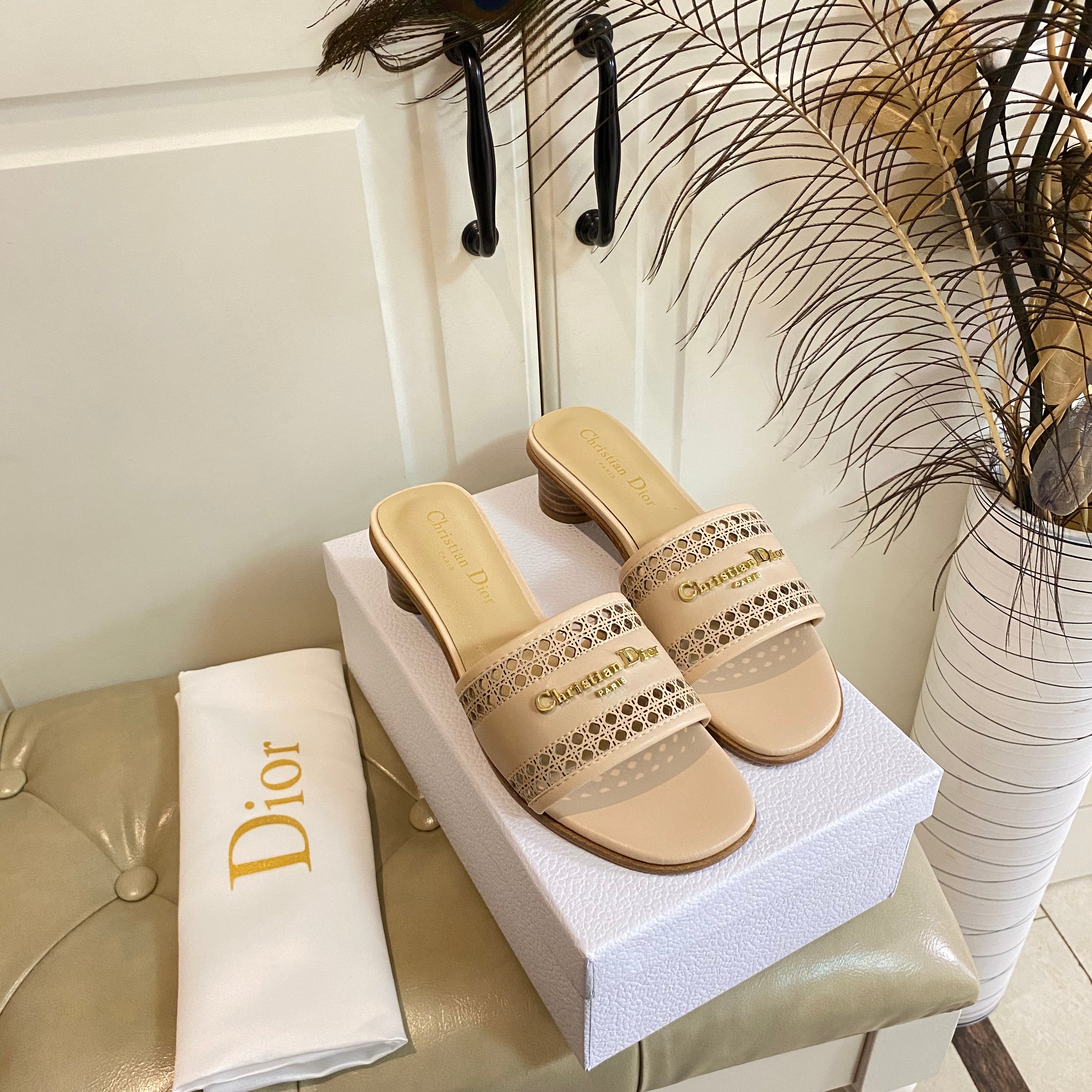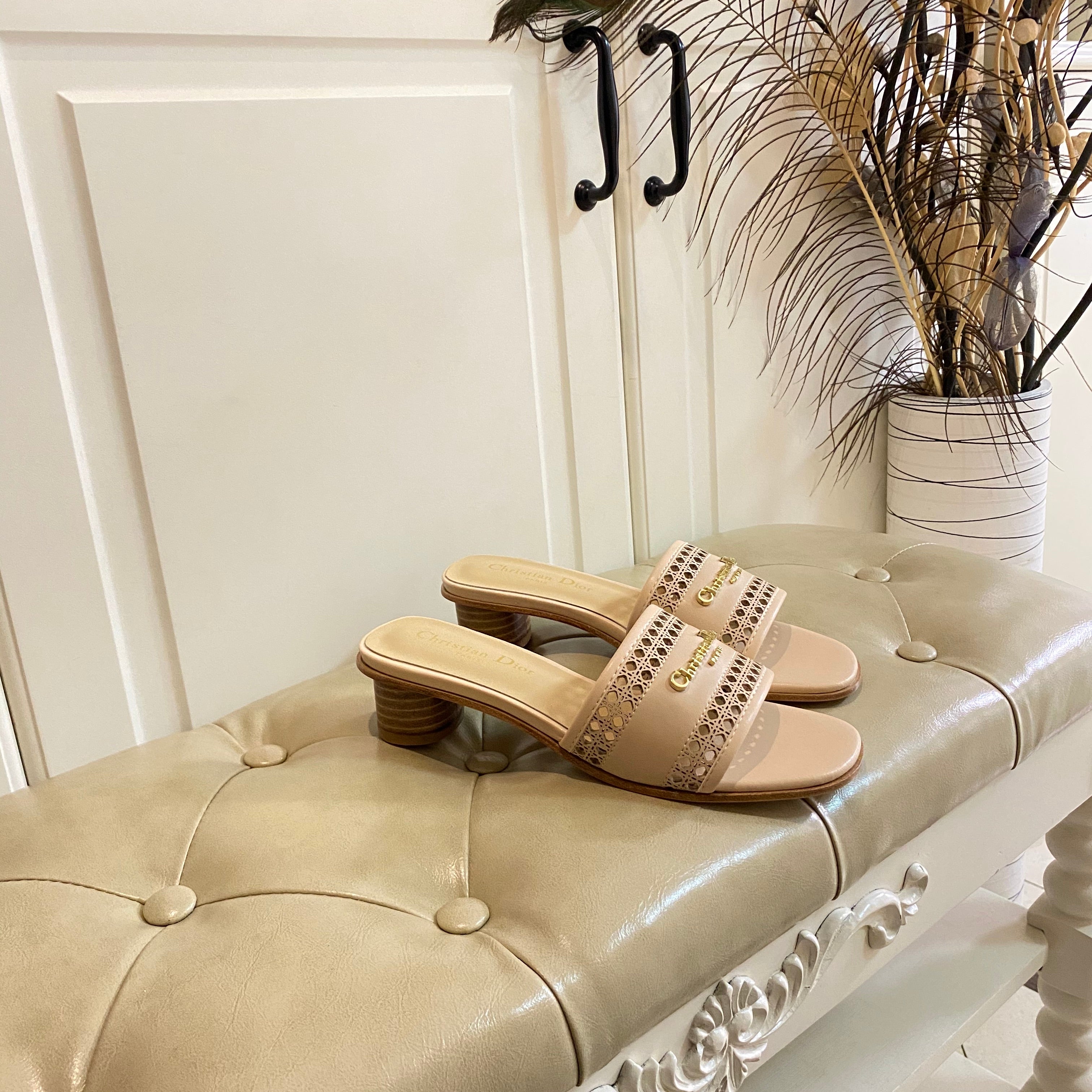 DWAY HEELED SLIDE IN CAMEL BEIGE CALFSKIN WITH GOLD LOGO