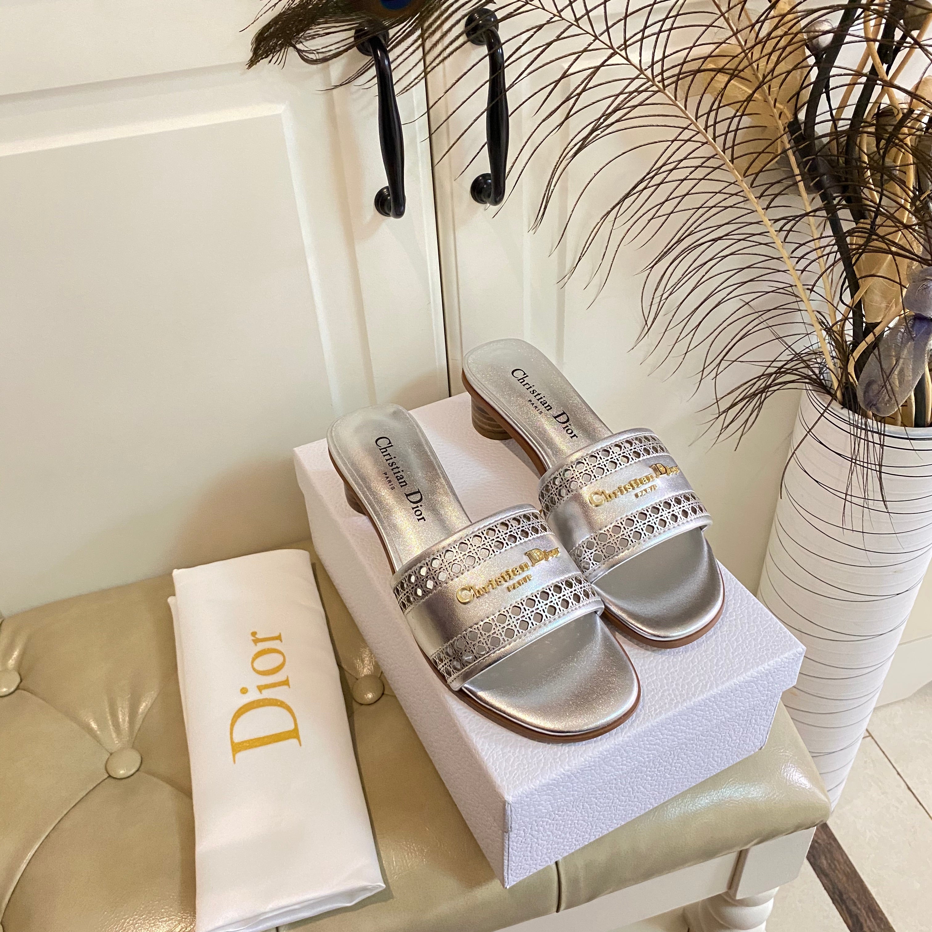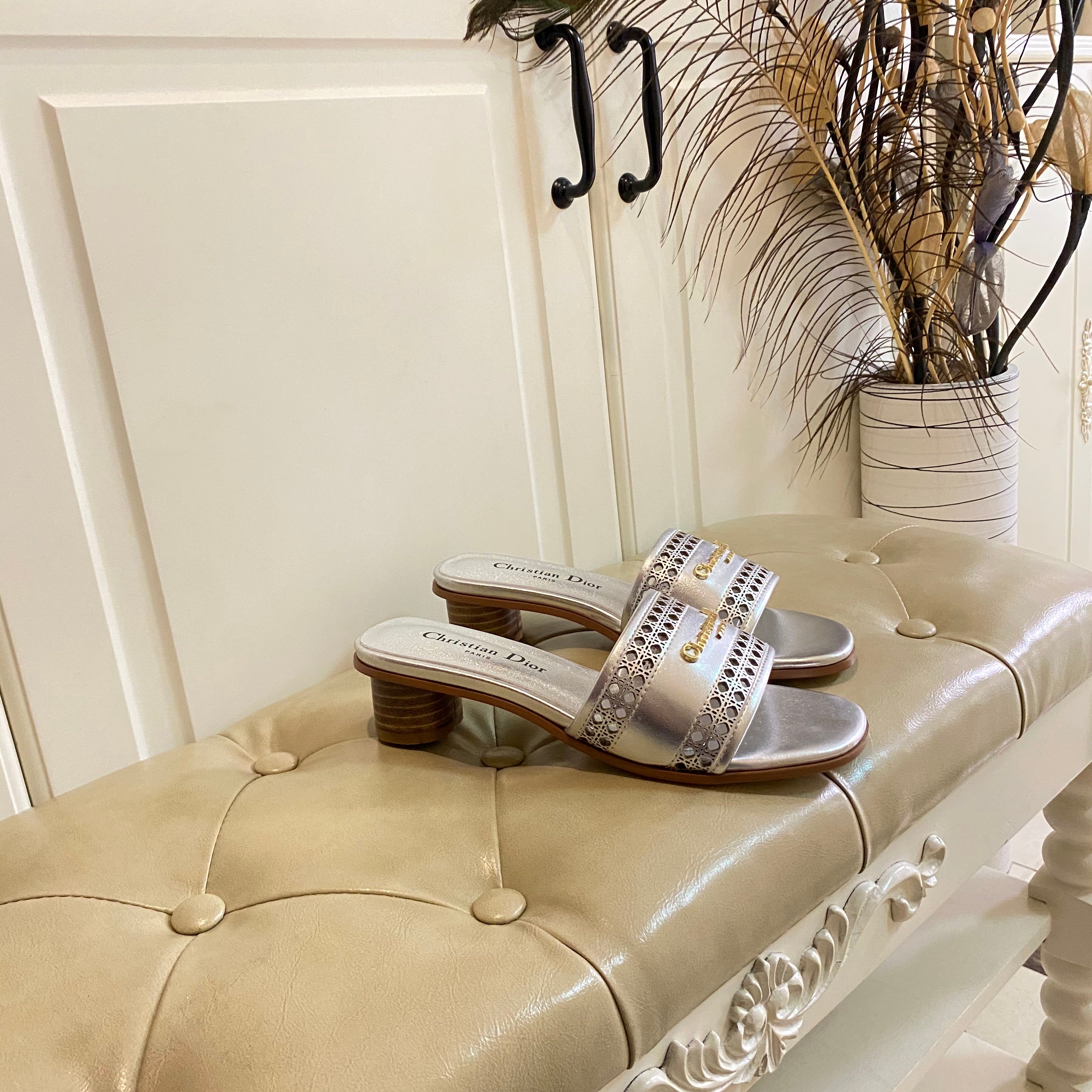 DWAY HEELED SLIDE IN SILVER CALFSKIN WITH GOLD LOGO
