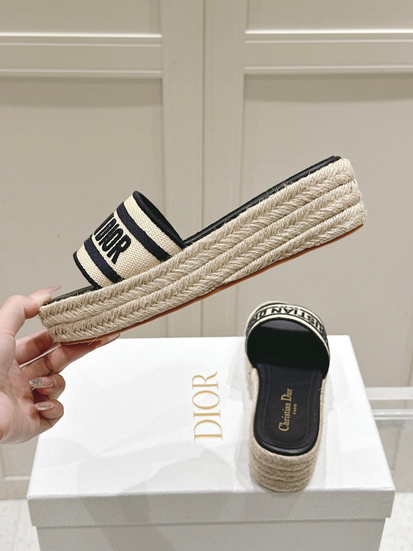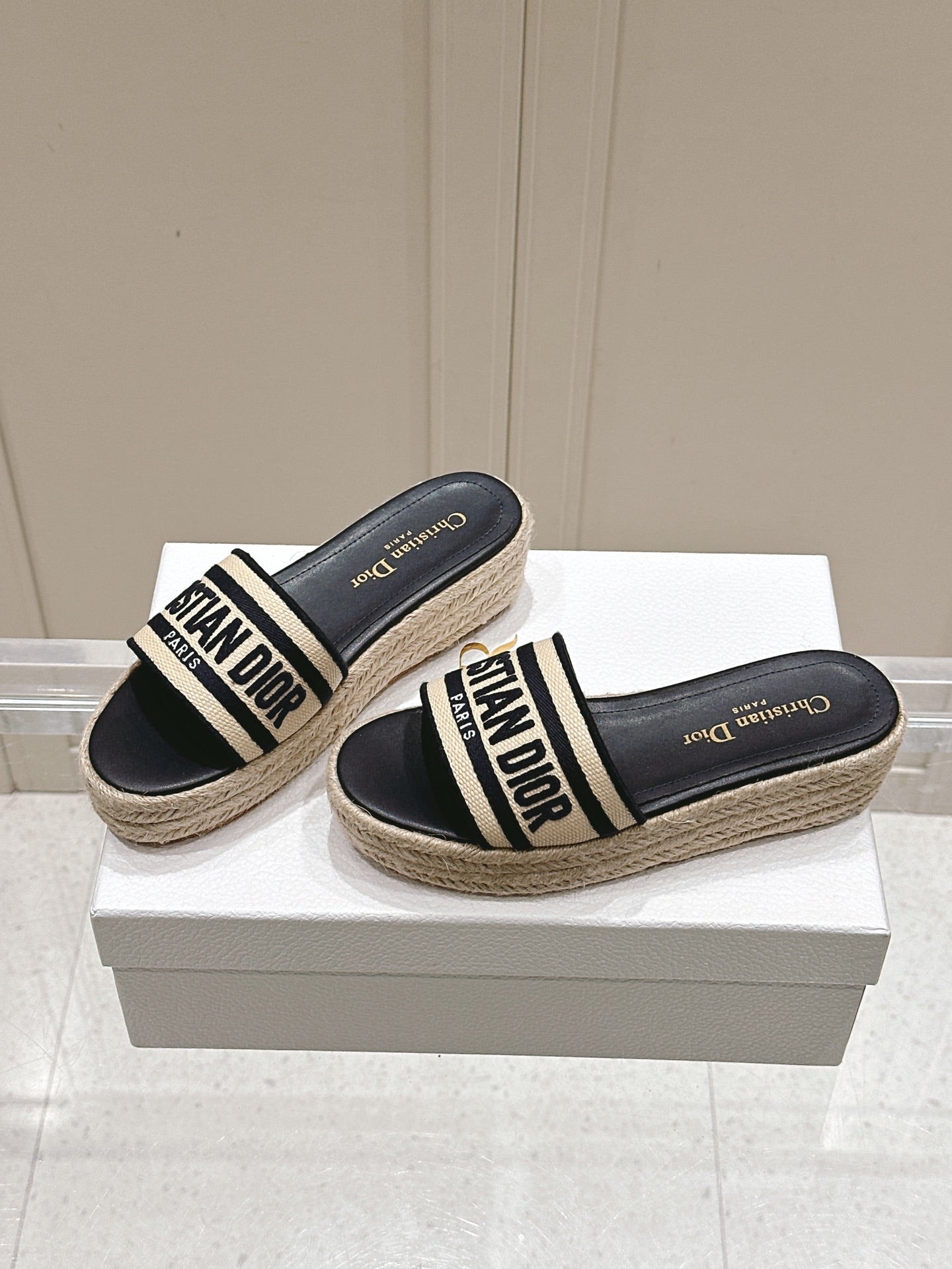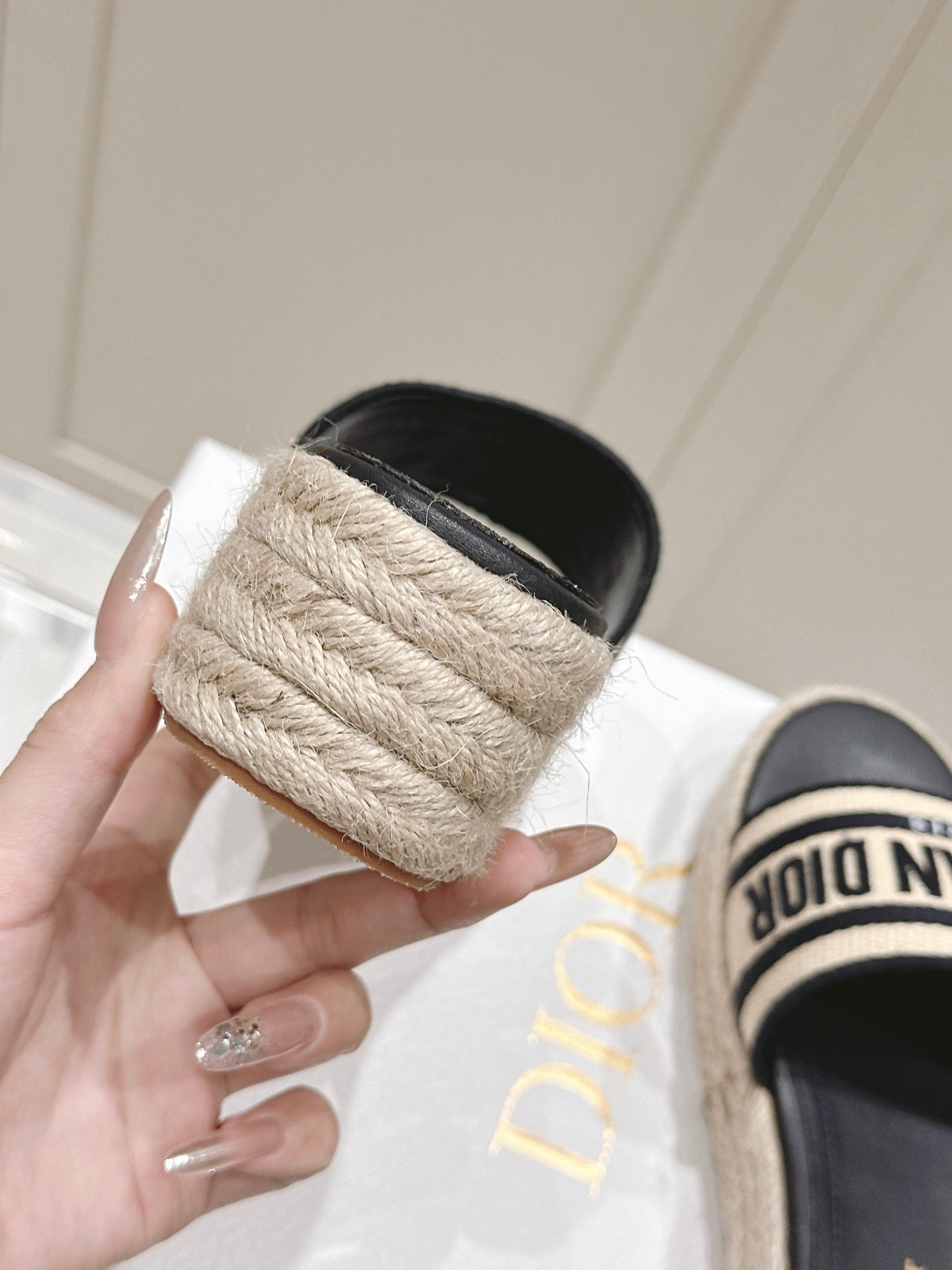 DWAY WEDGE SLIDES 45MM IN BLACK AND BEIGE FABRIC RAFFIA SOLE