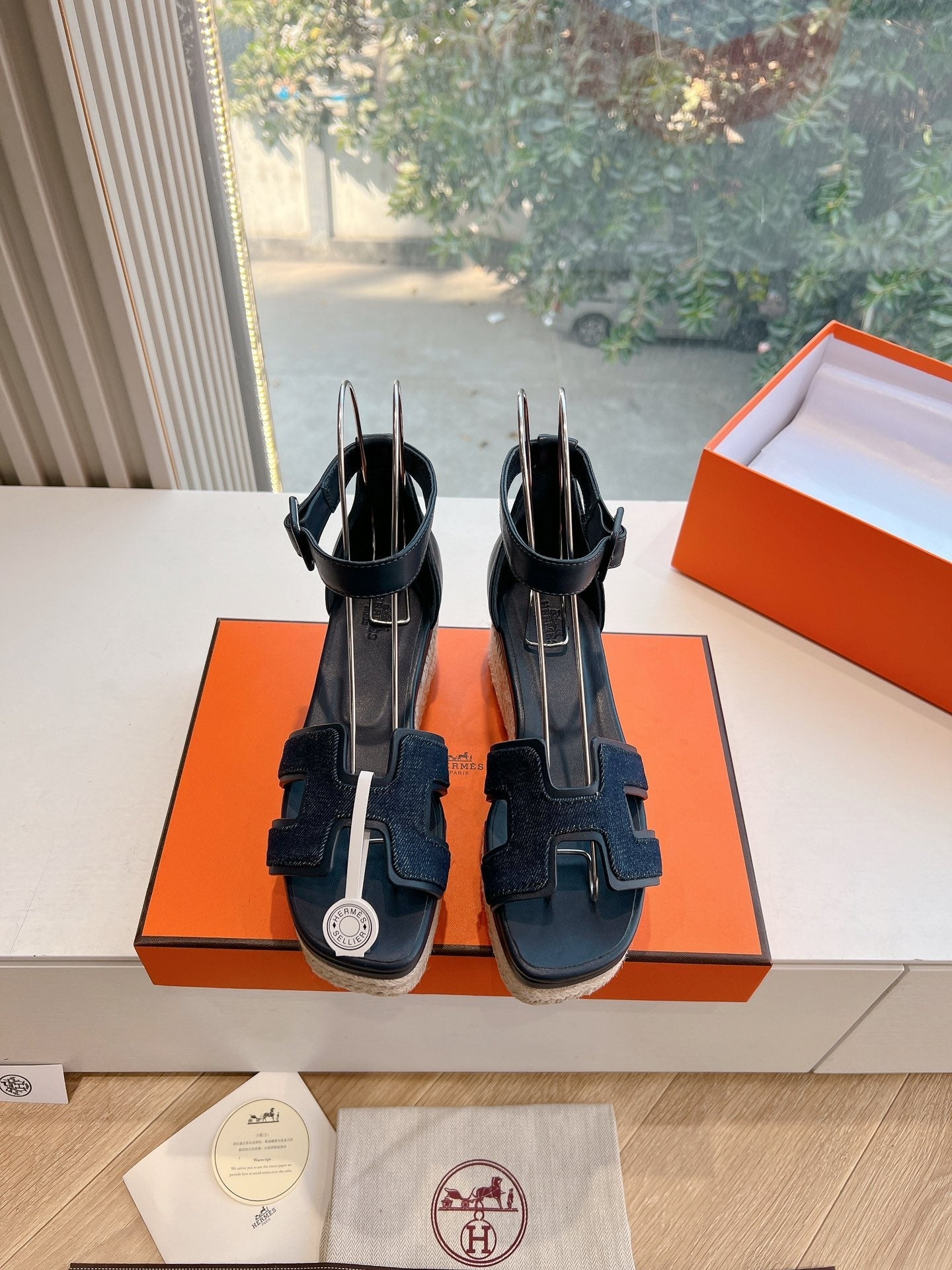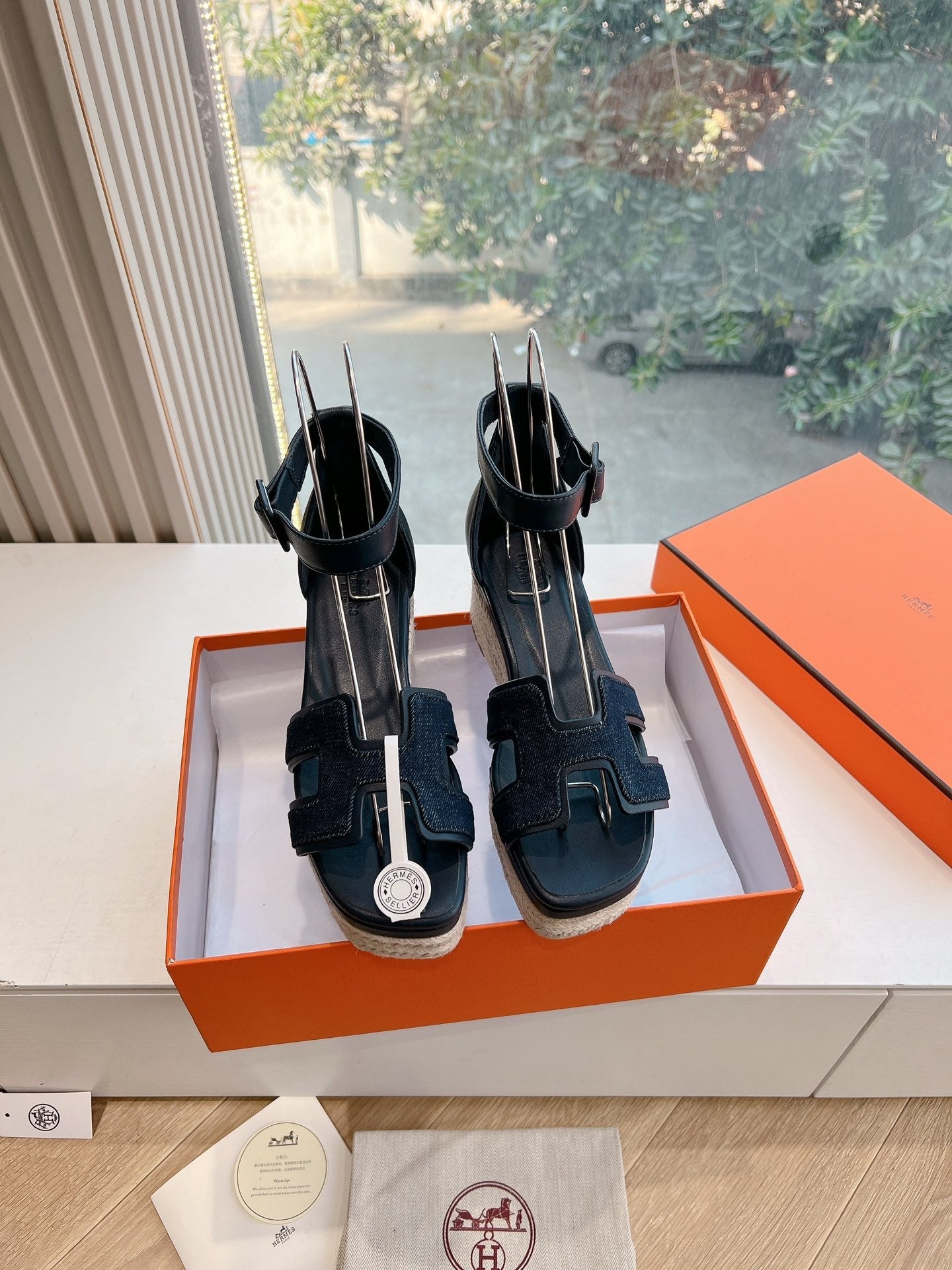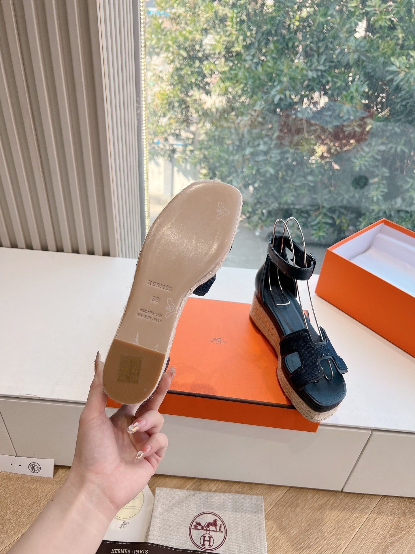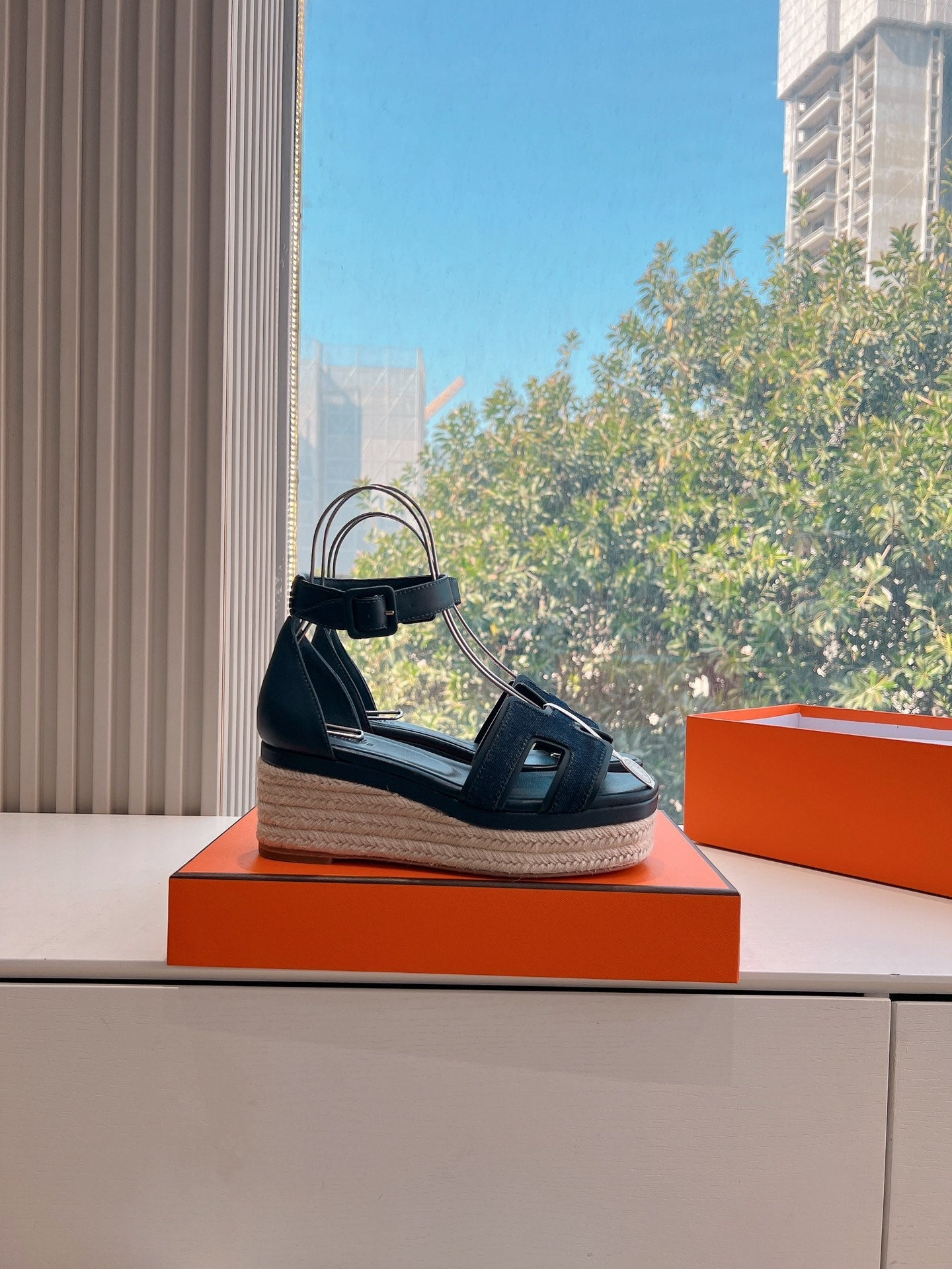 ELDA ESPADRILLE IN MIDNIGHT BLUE FABRIC AND BLACK CALFSKIN