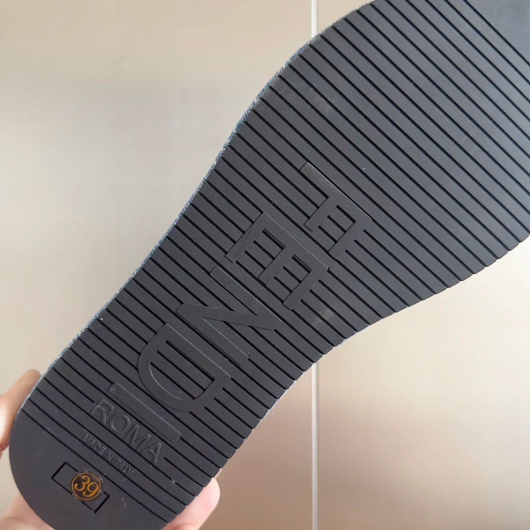 FENDI PLATFORM WEDGES IN STEEL BLUE JACQUARD FABRIC WITH EMBROIDERED LOGO
