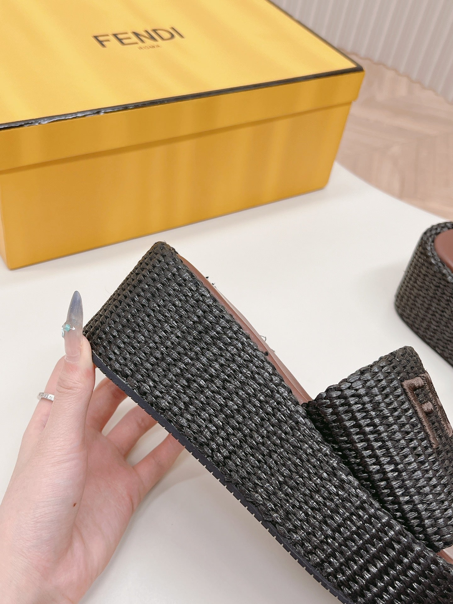 FENDI SIGNATURE WEDGE PLATFORM 6 CM IN BLACK FIBRE WITH BROWN EMBROIDERED LOGO