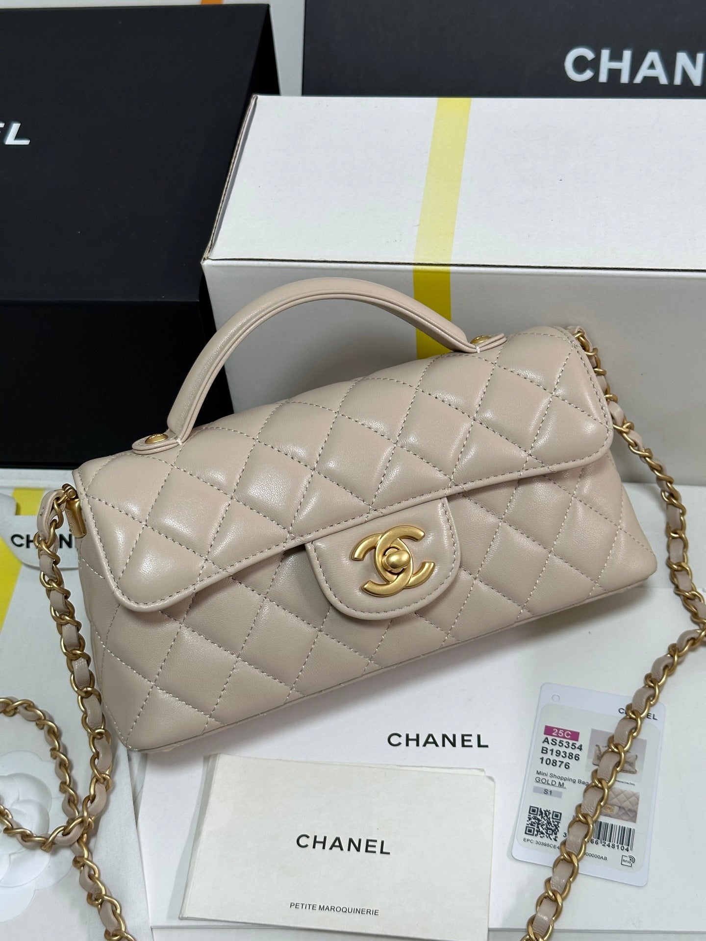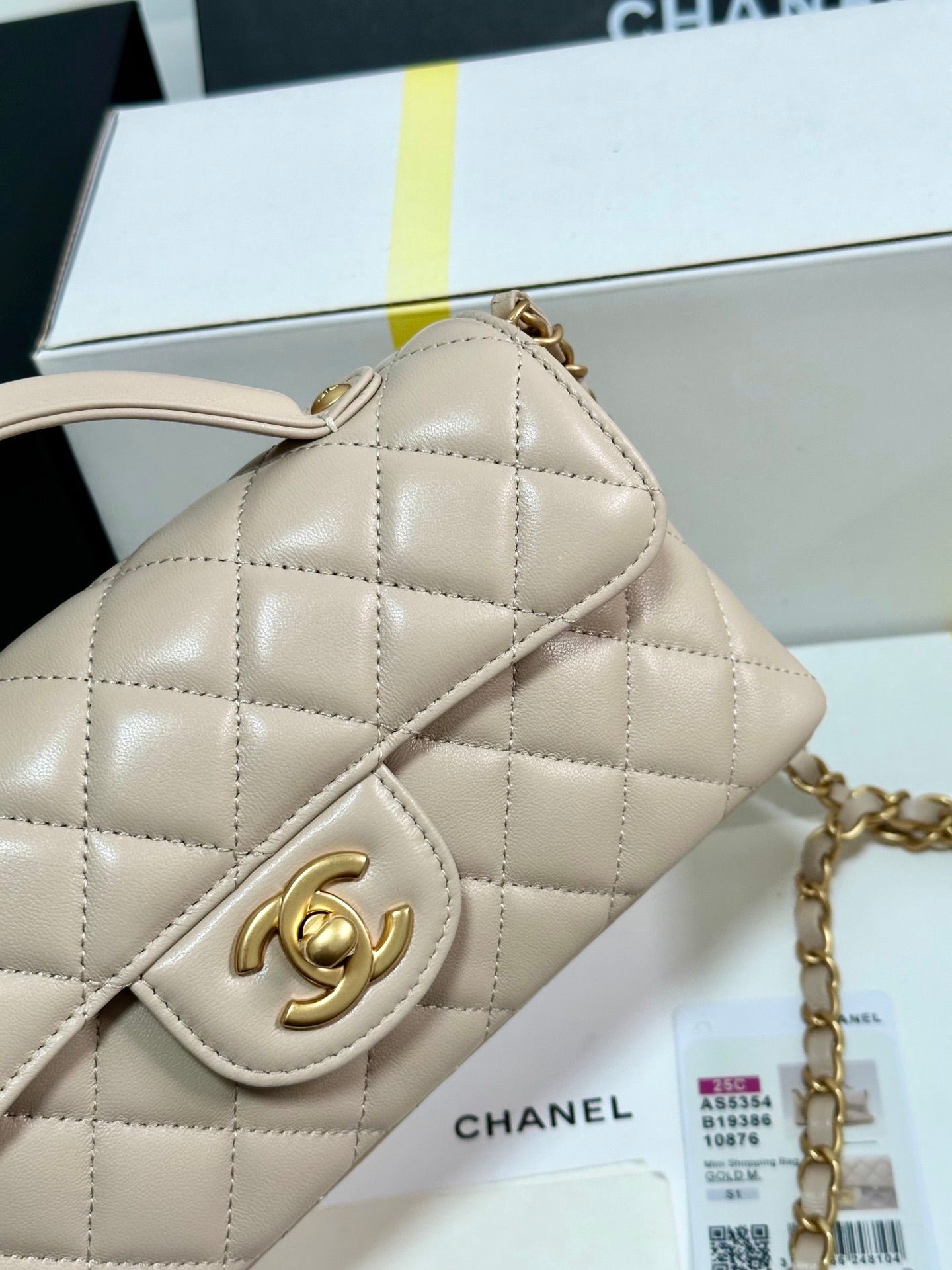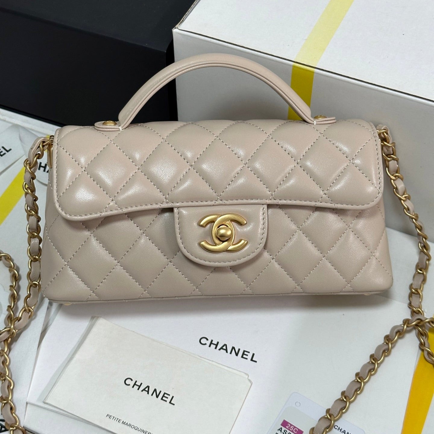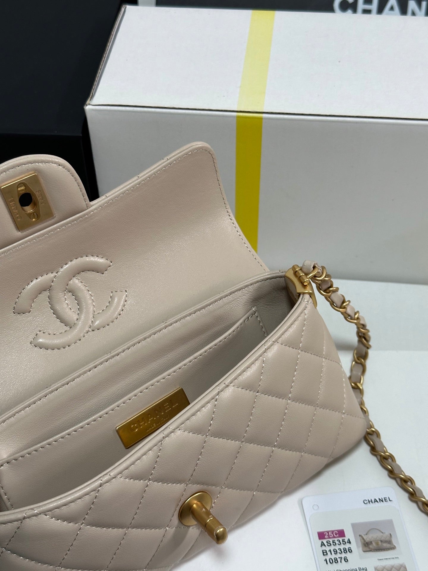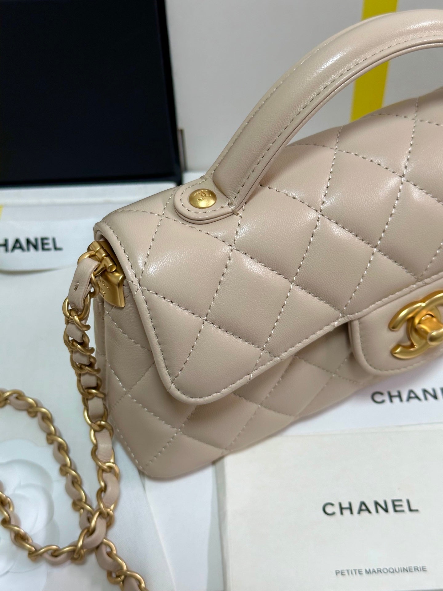 FLAP BAG WITH HANDLE 22 IN BEIGE LAMBSKIN GOLD PLATED METAL