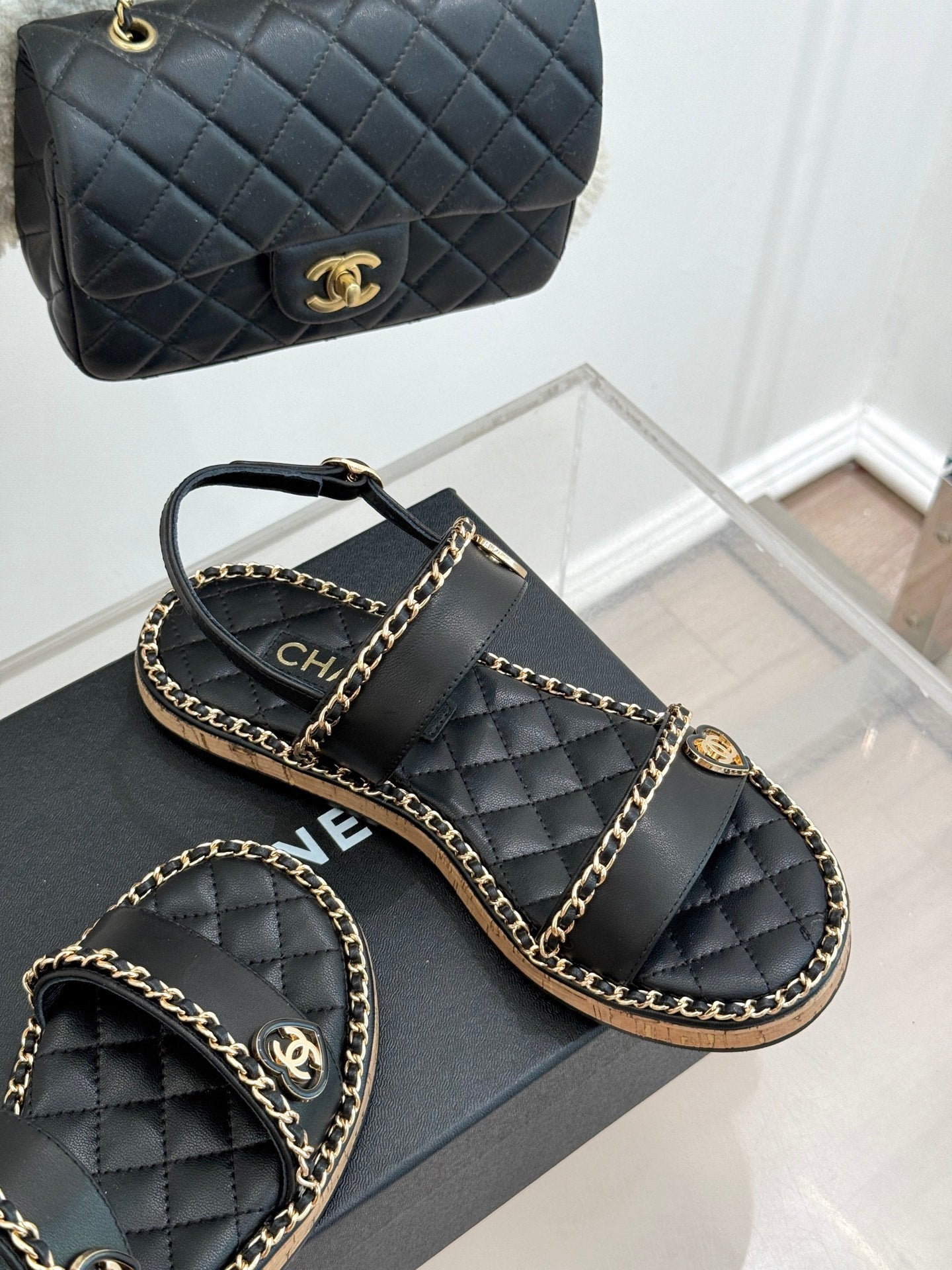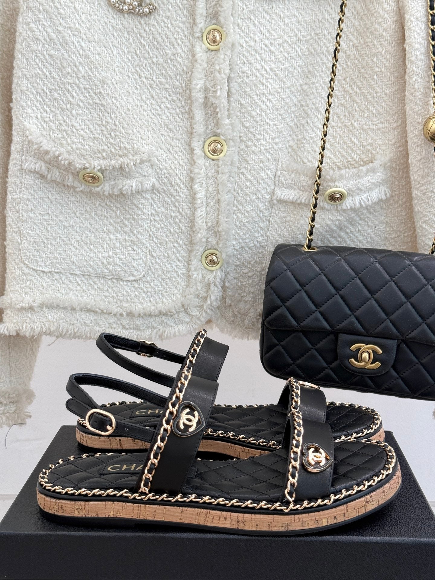 FLAT CHAIN HEART SANDAL IN BLACK LAMBSKIN