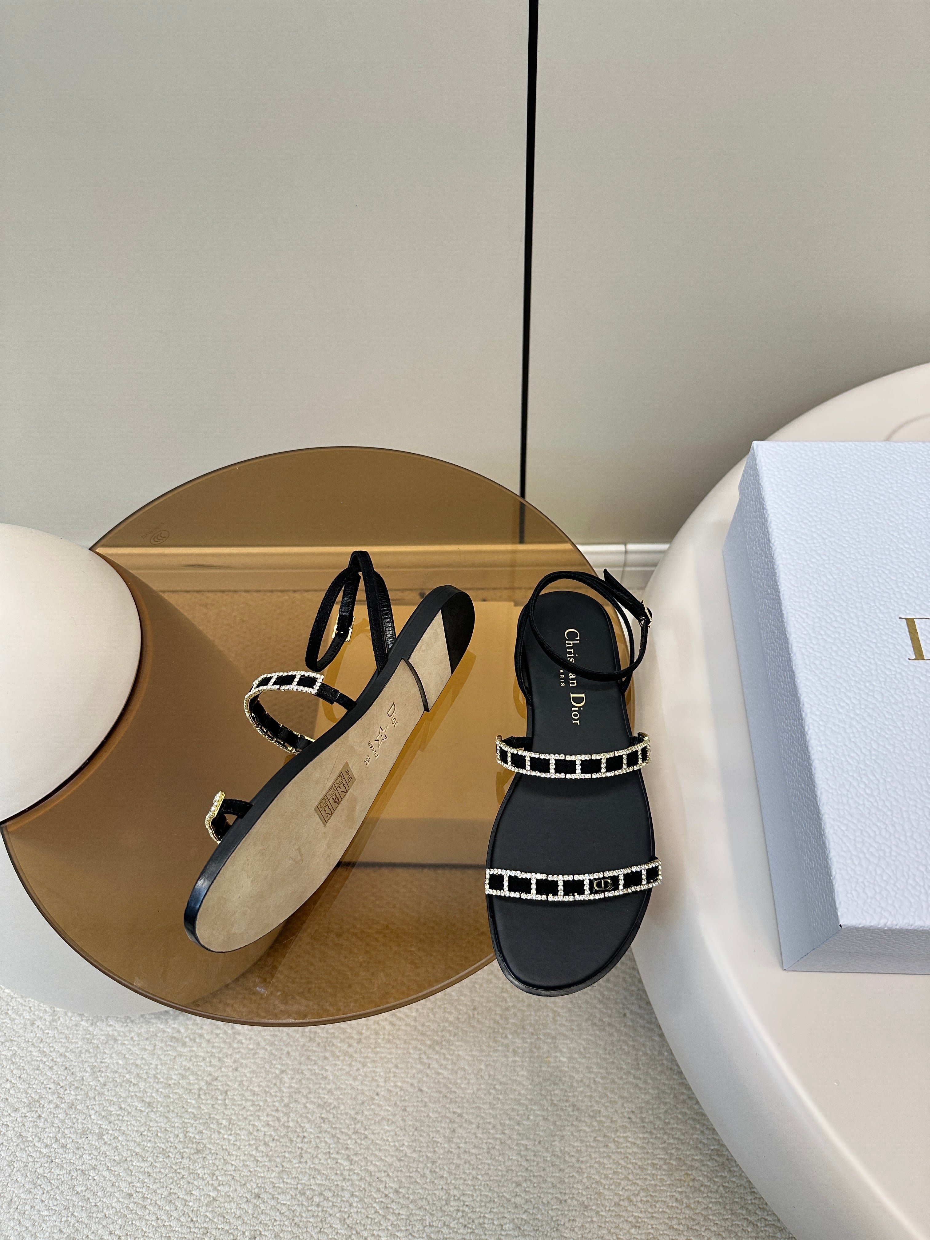 FLAT SANDALS 25S IN BLACK CALFSKIN RHINESTONES STRAP