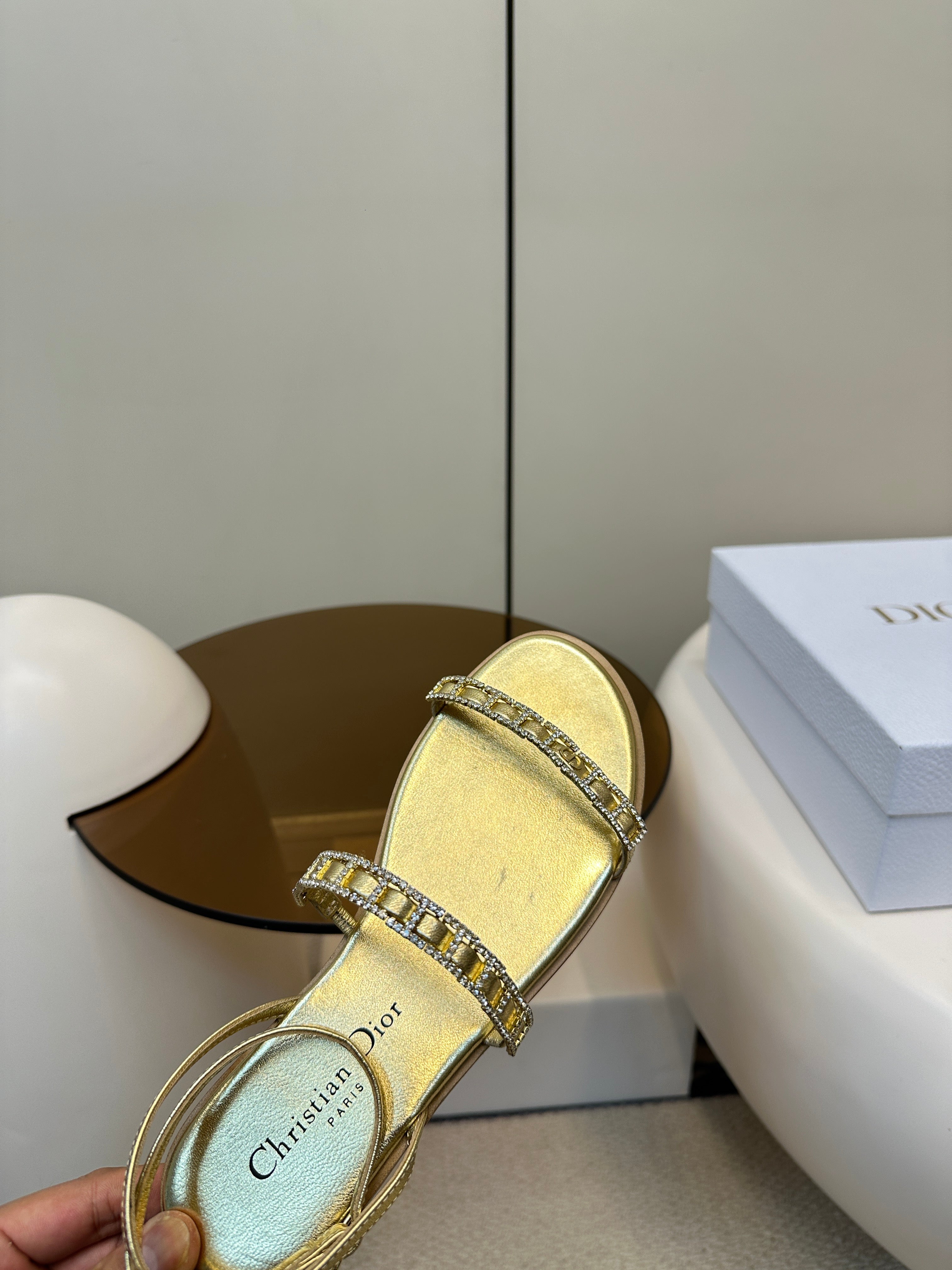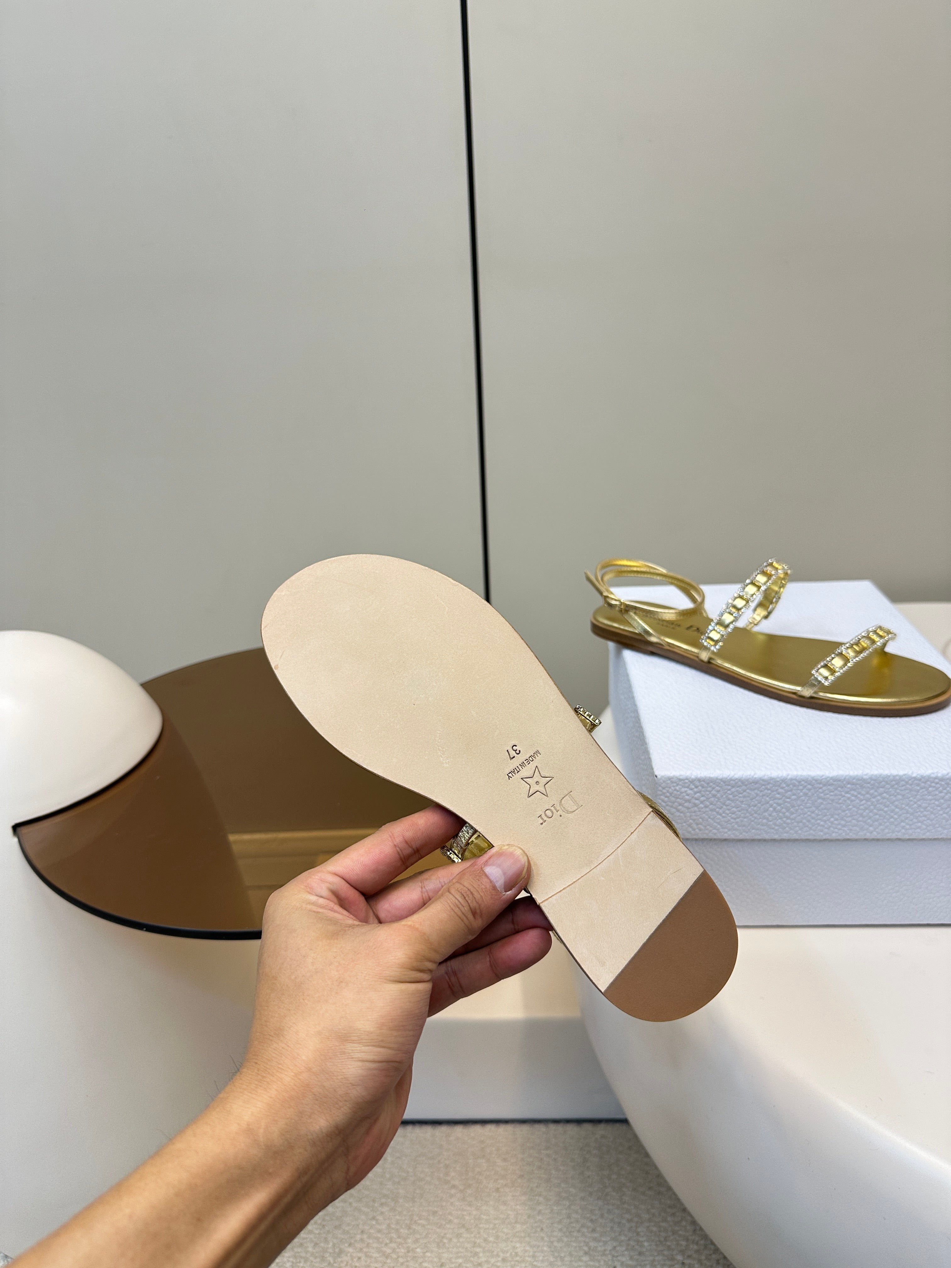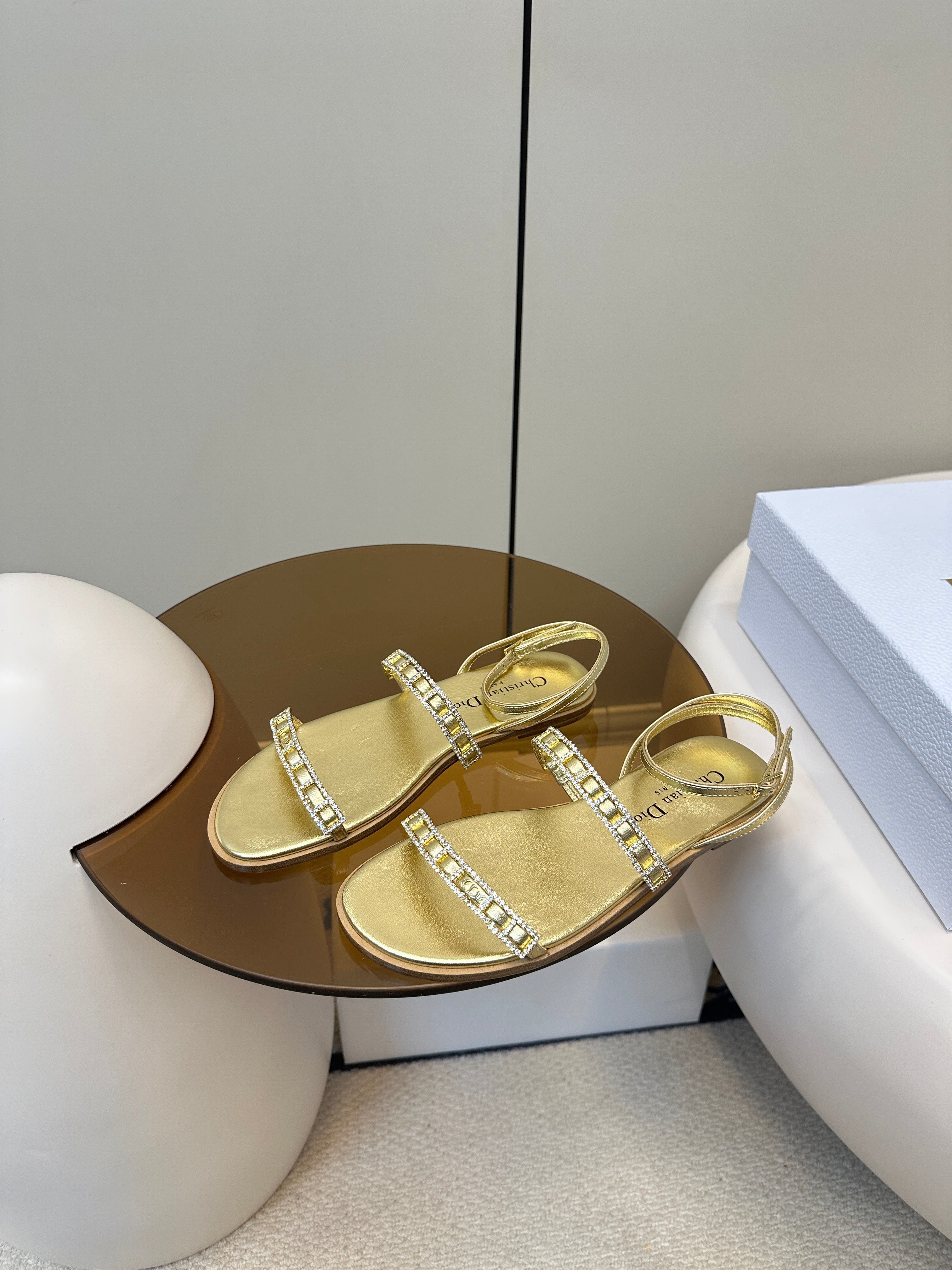 FLAT SANDALS 25S IN SHINY GOLD CALFSKIN RHINESTONES STRAP