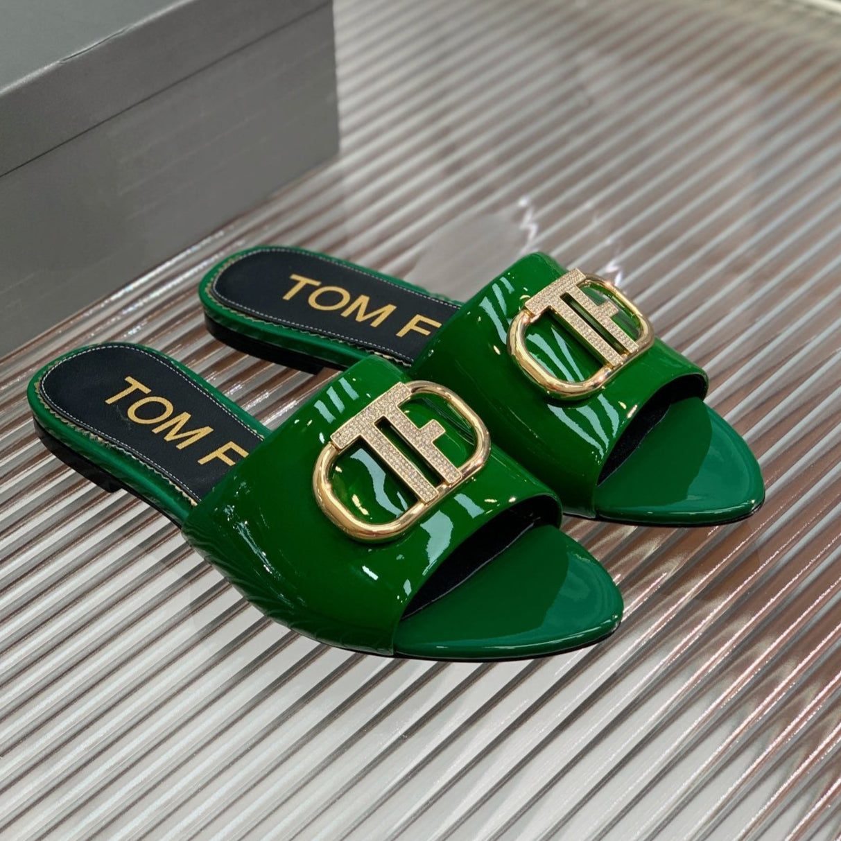 FLAT SLIDE IN PINE GREEN METALLIC CALFSKIN