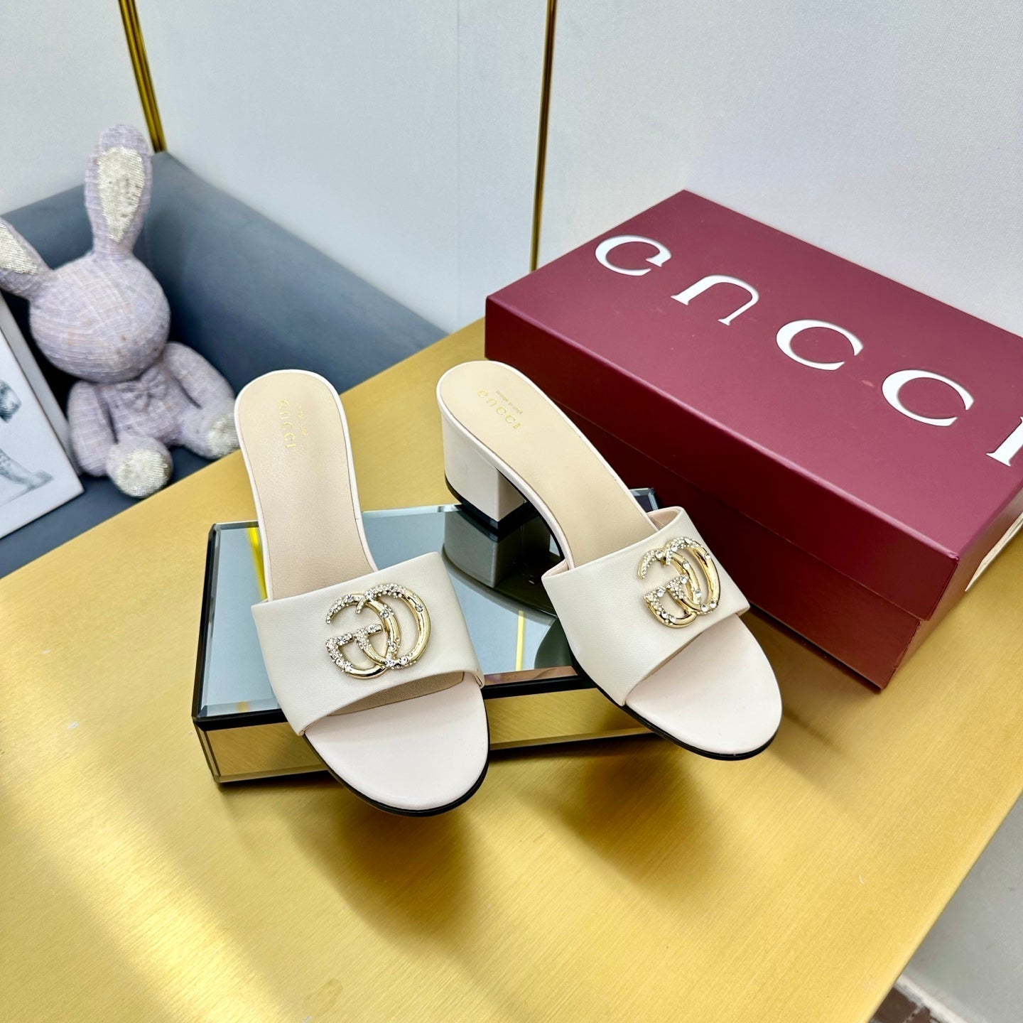 GG HIGH HEELS IN CREAM WHITE CALFSKIN GOLD-TONE HARDWARE WITH RHINESTONES