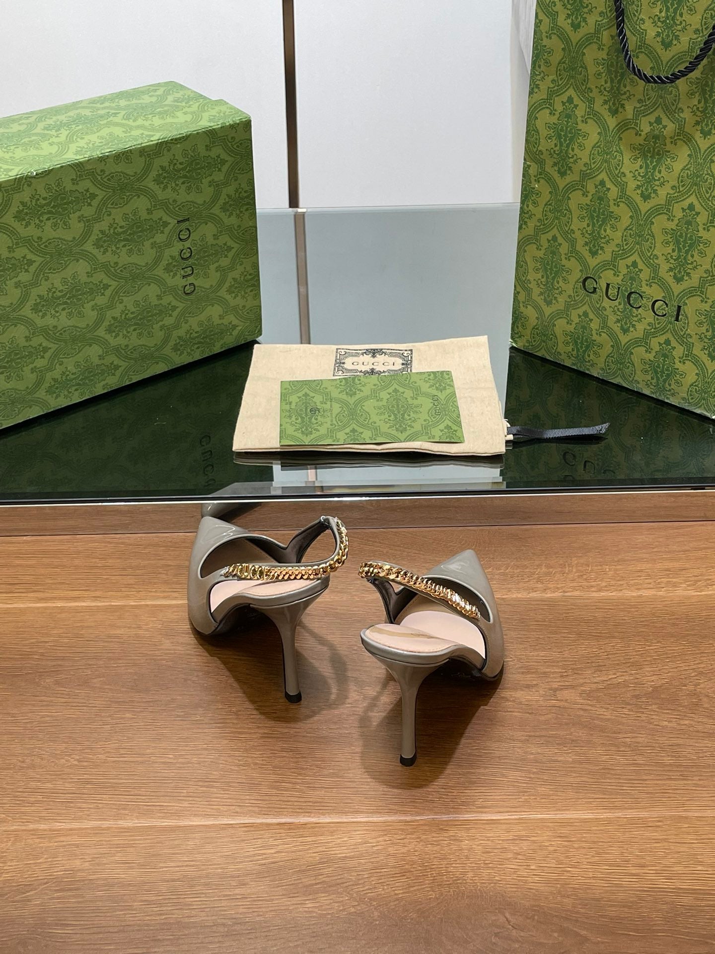 GG HIGH SLINGBACK 10.5 CM IN DOVE GREY GLOSSY CALFSKIN WITH GOLD HARDWARE