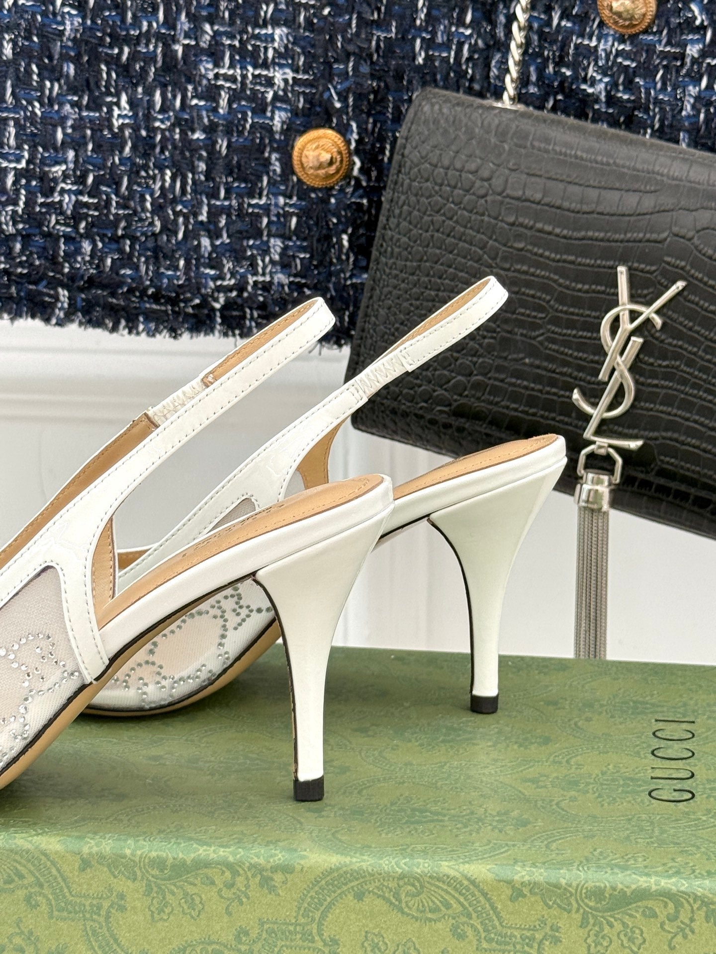 GG HIGH SLINGBACK 8.5 CM IN WHITE CLASSIC POINTED-TOE MESH WITH RHINESTONE EMBELLISHMENTS