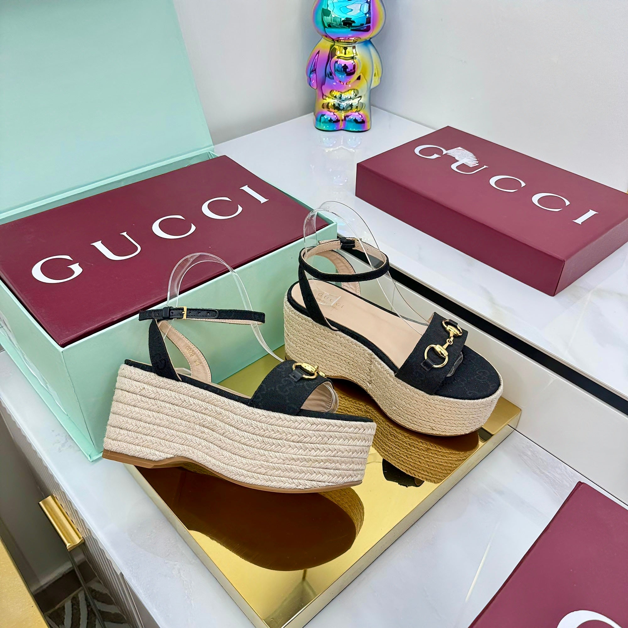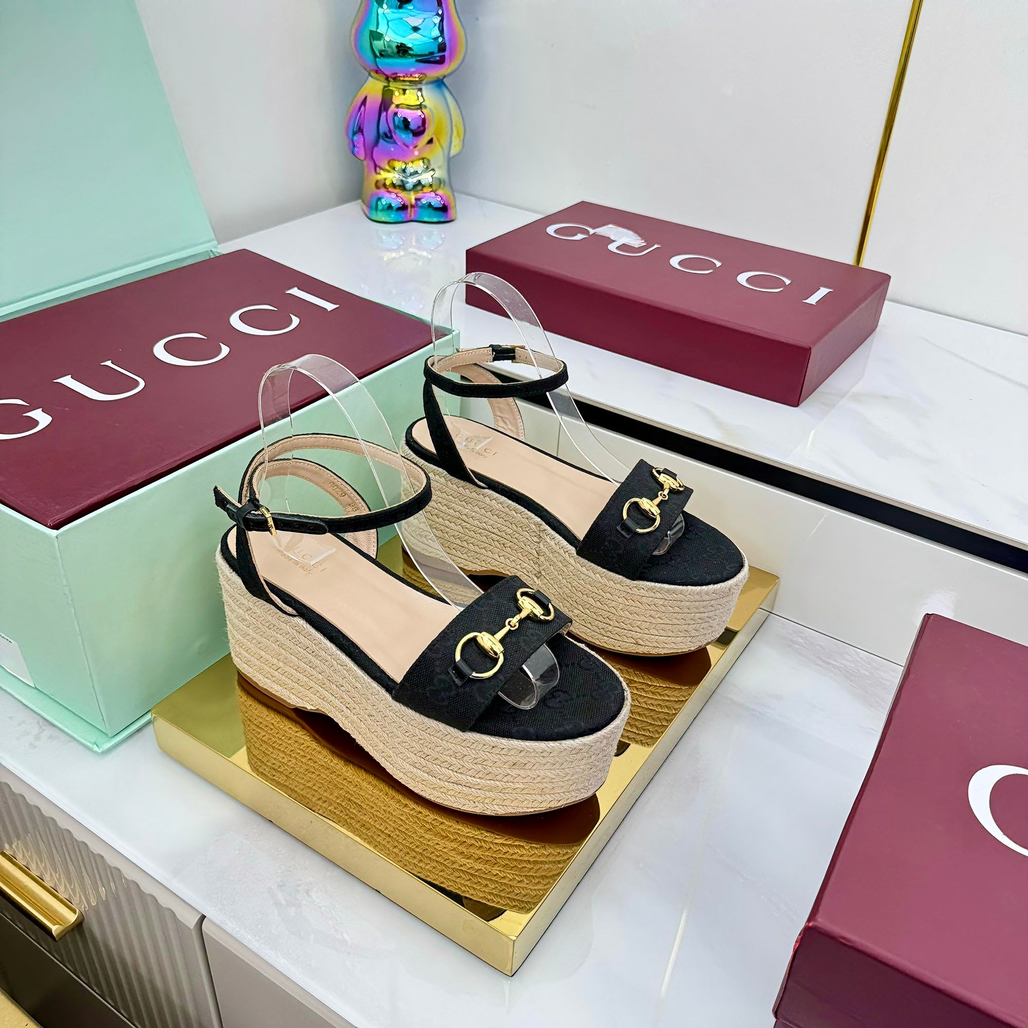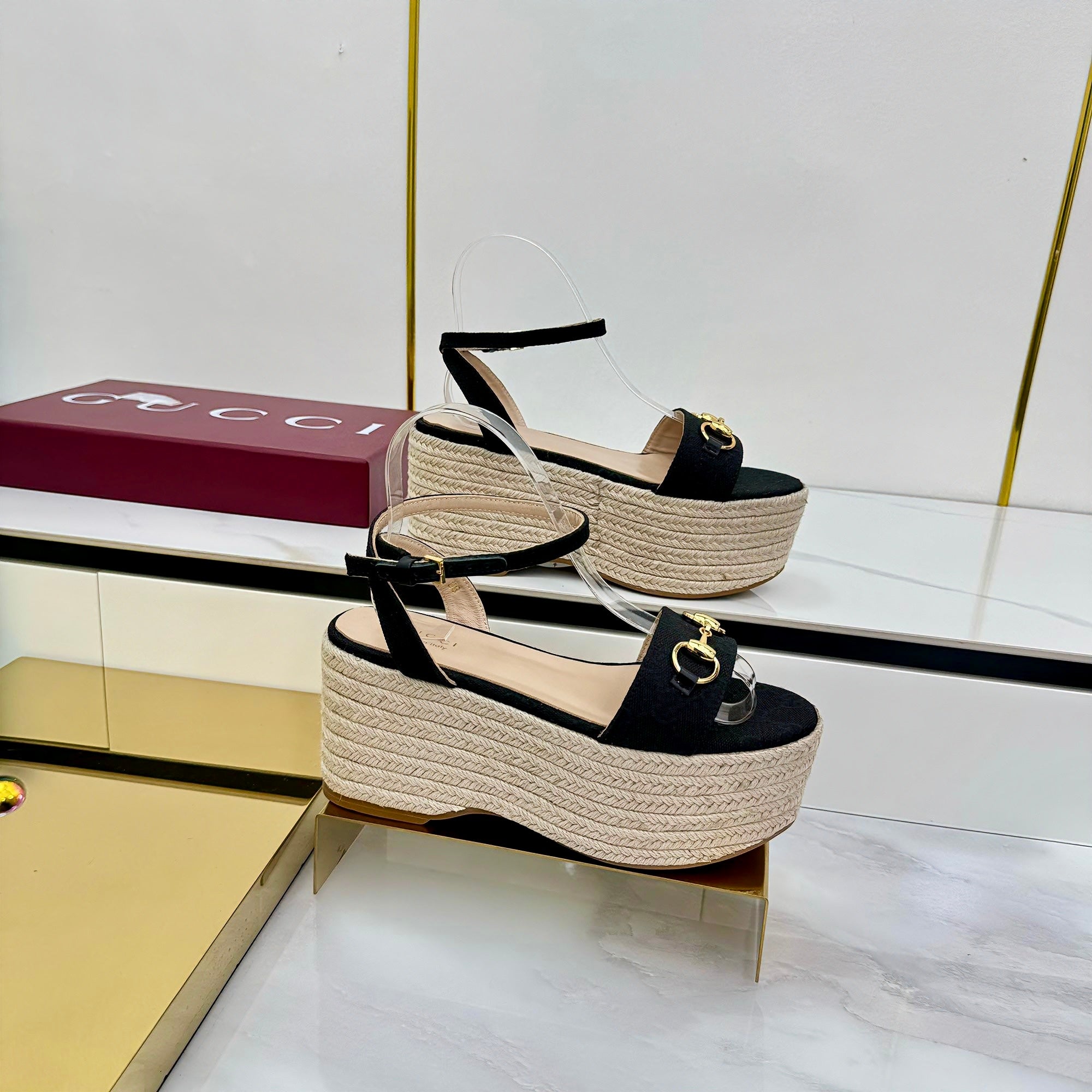 GG HIGH WEDGE SANDALS IN BLACK FABRIC AND RAFFIA WITH GOLD HARDWARE