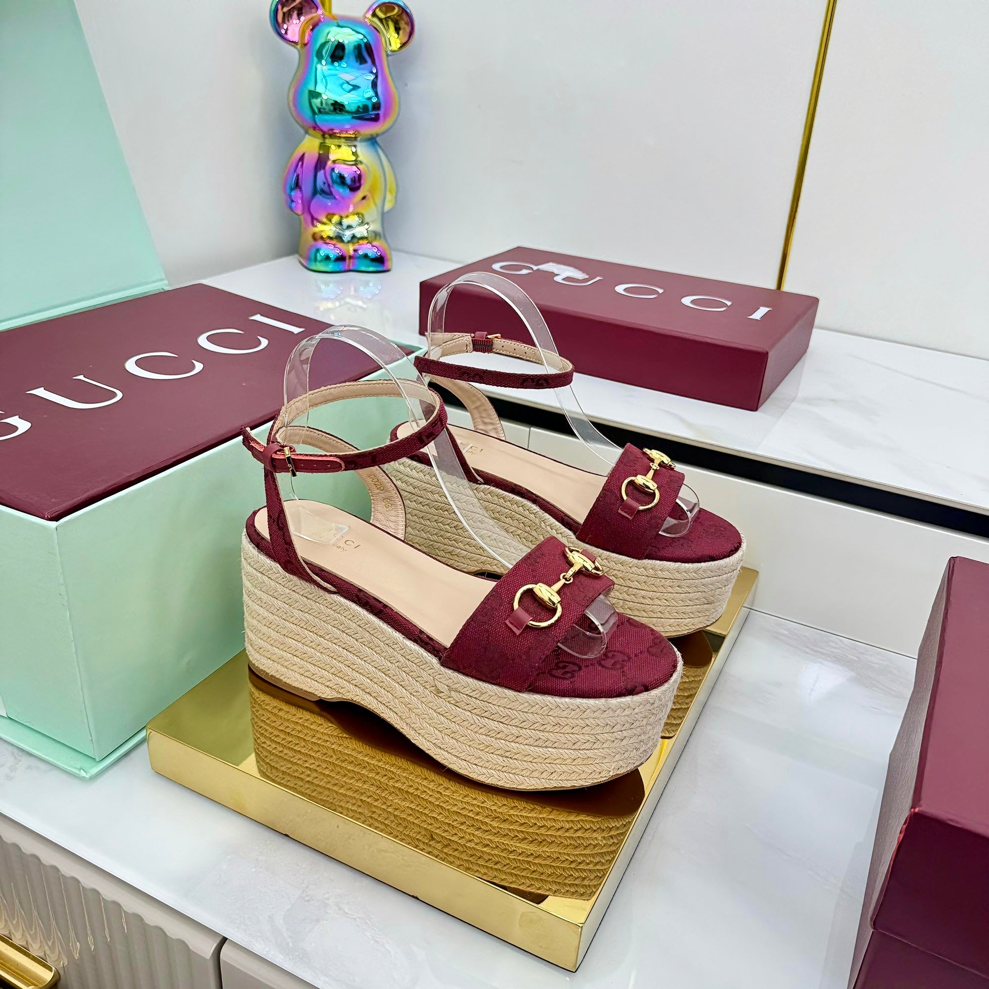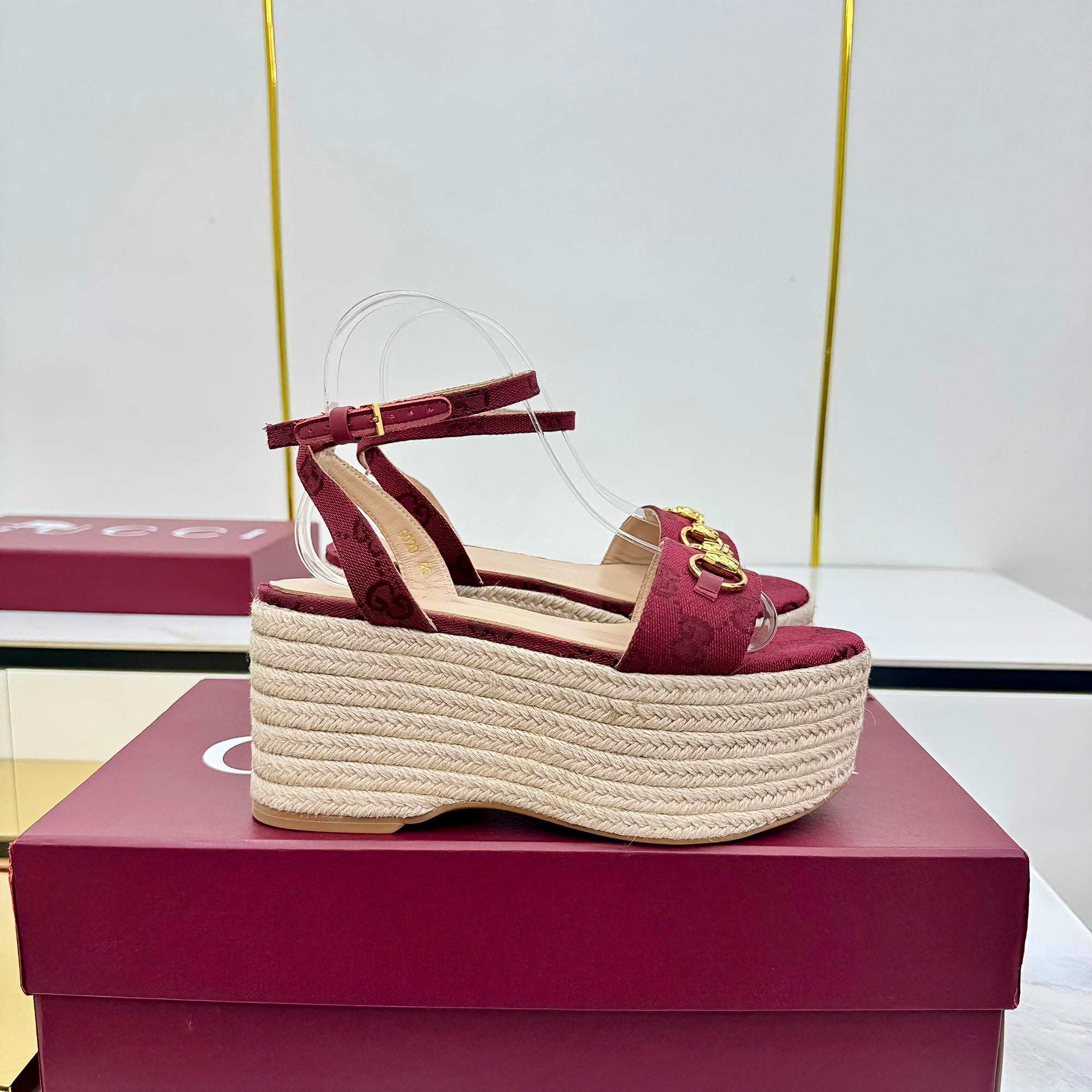 GG HIGH WEDGE SANDALS IN RED FABRIC AND RAFFIA WITH GOLD HARDWARE