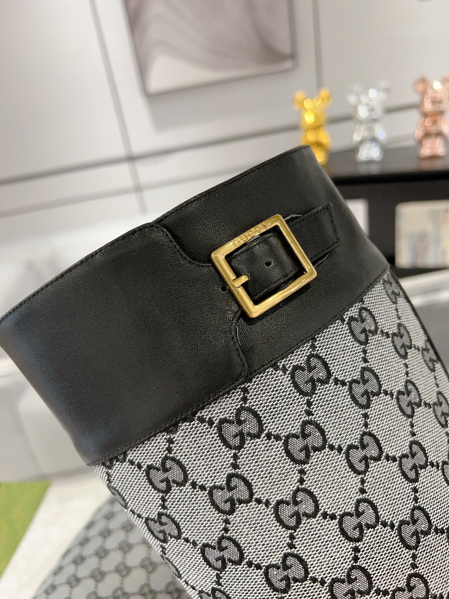 GG KNEE BOOTS IN LIGHT GRAY MONOGRAM CANVAS AND BLACK GLOSSY SHEEPSKIN